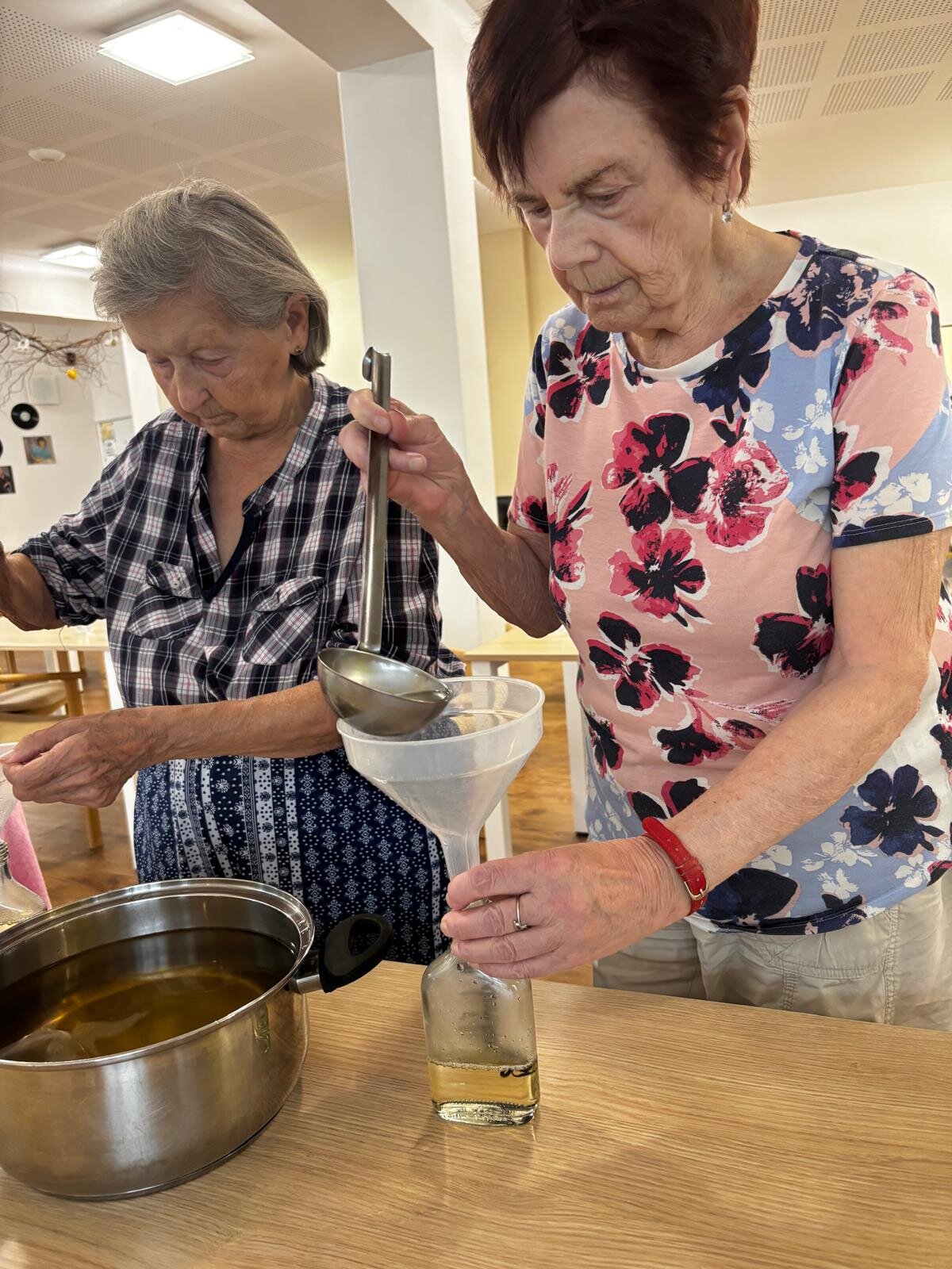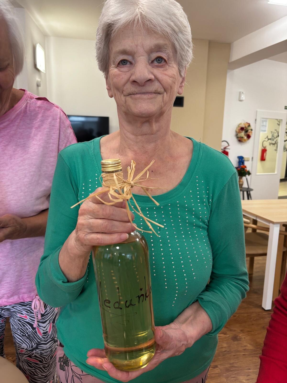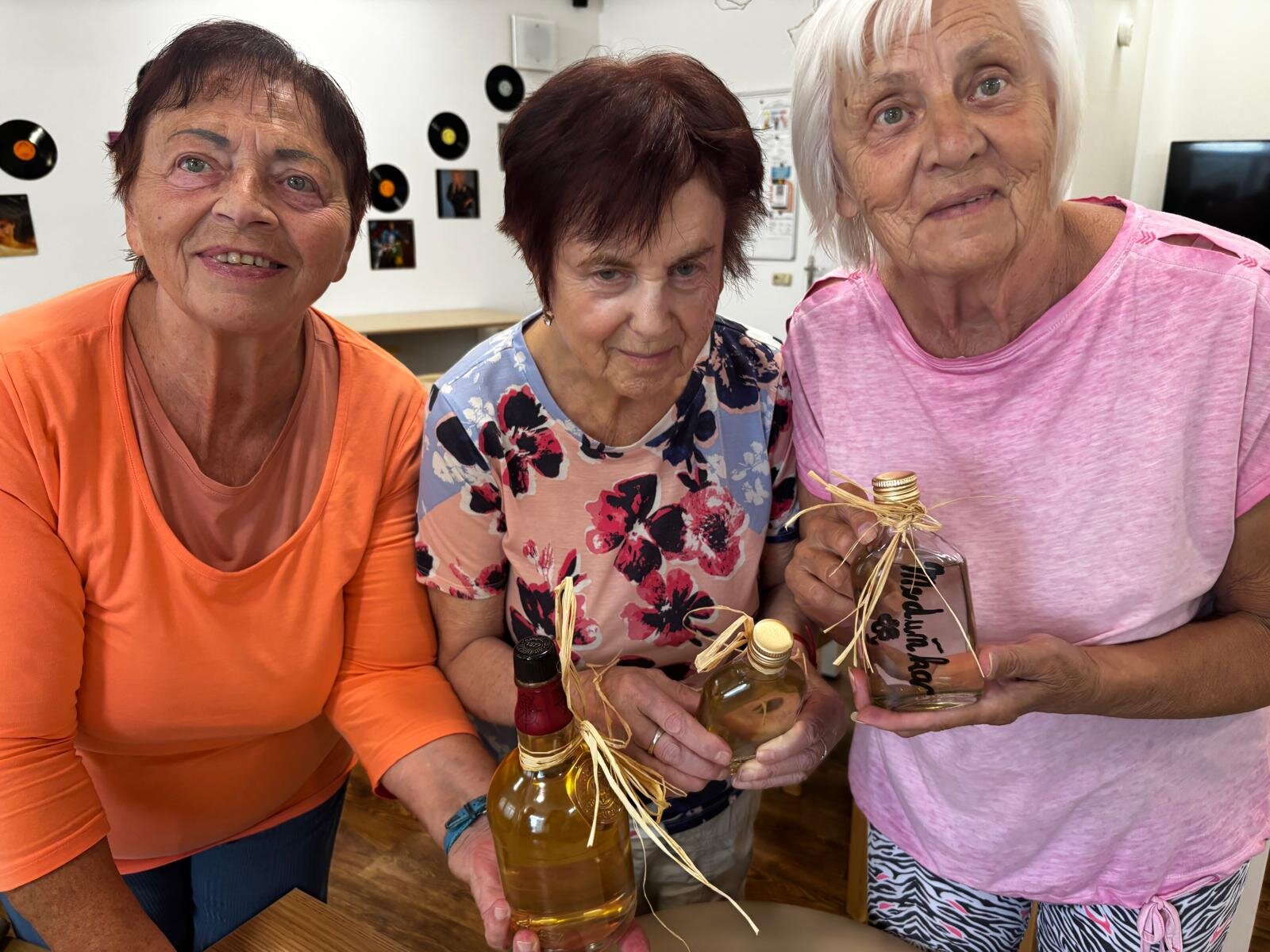 Meduňkový sirup. Z nasbíraných lístků meduňky jsme s klienty Senevida Kateřinice uvařili sirup. Společnými silami jsme ho rozlili do připravených sklenic a poté malé lahvičky krásně dozdobili. Lahvičky se sirupem budou tak nejen pro potěchu oka, ale především pro naše mlsné jazýčky.