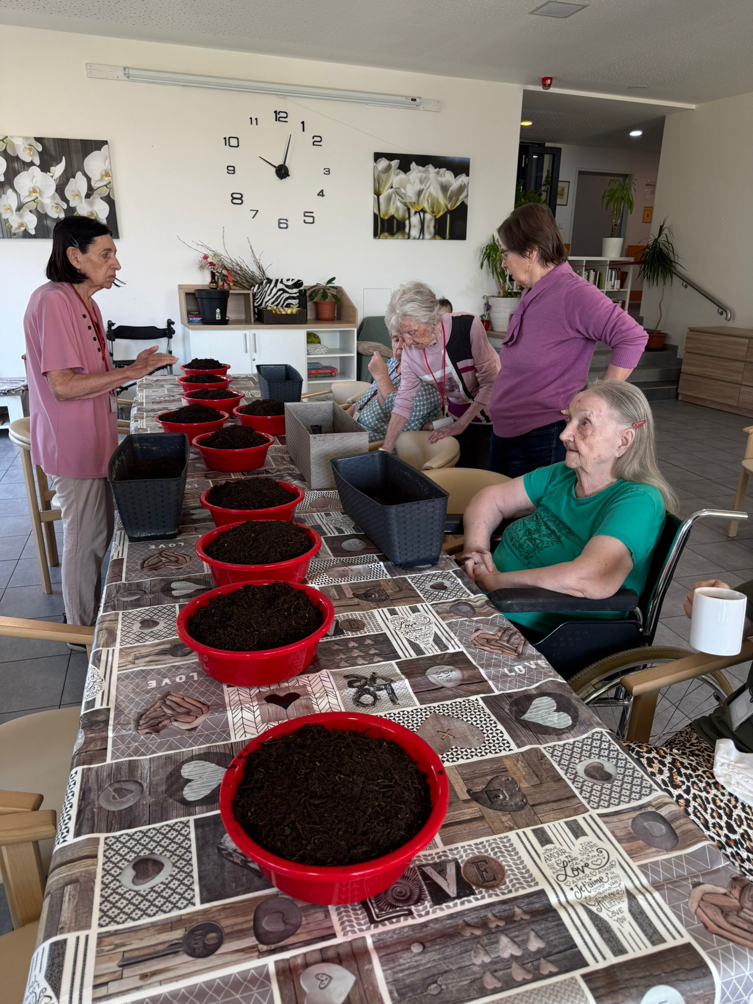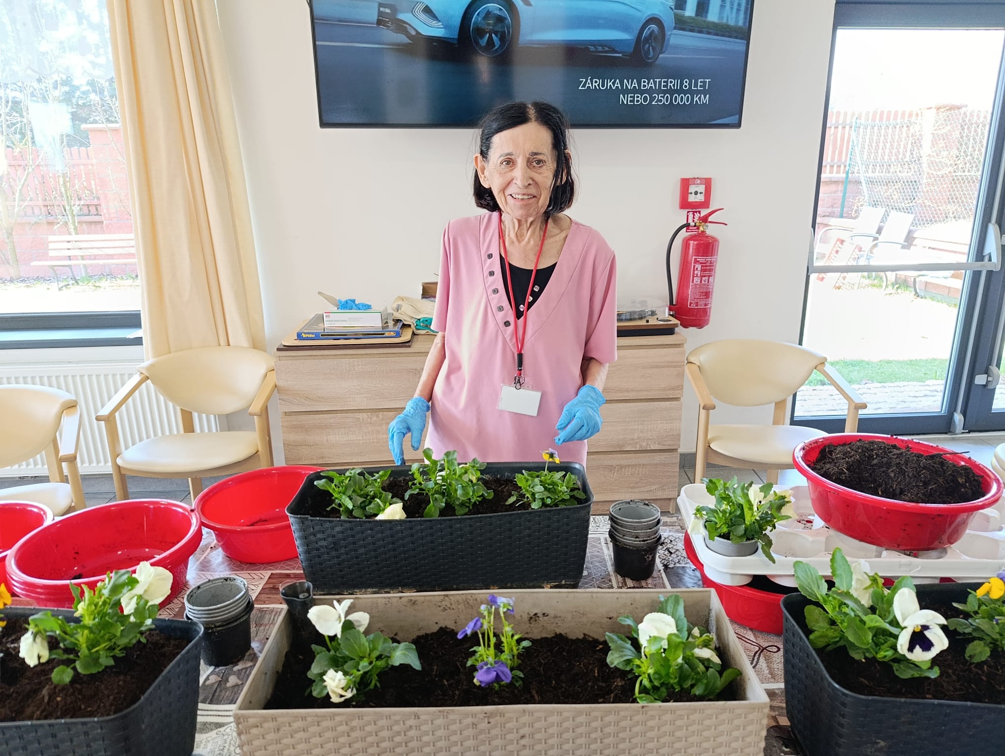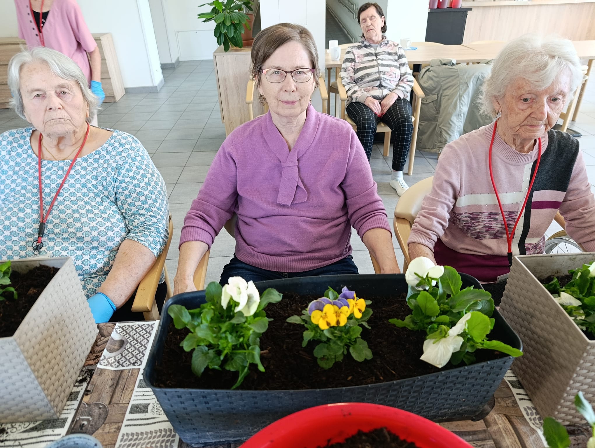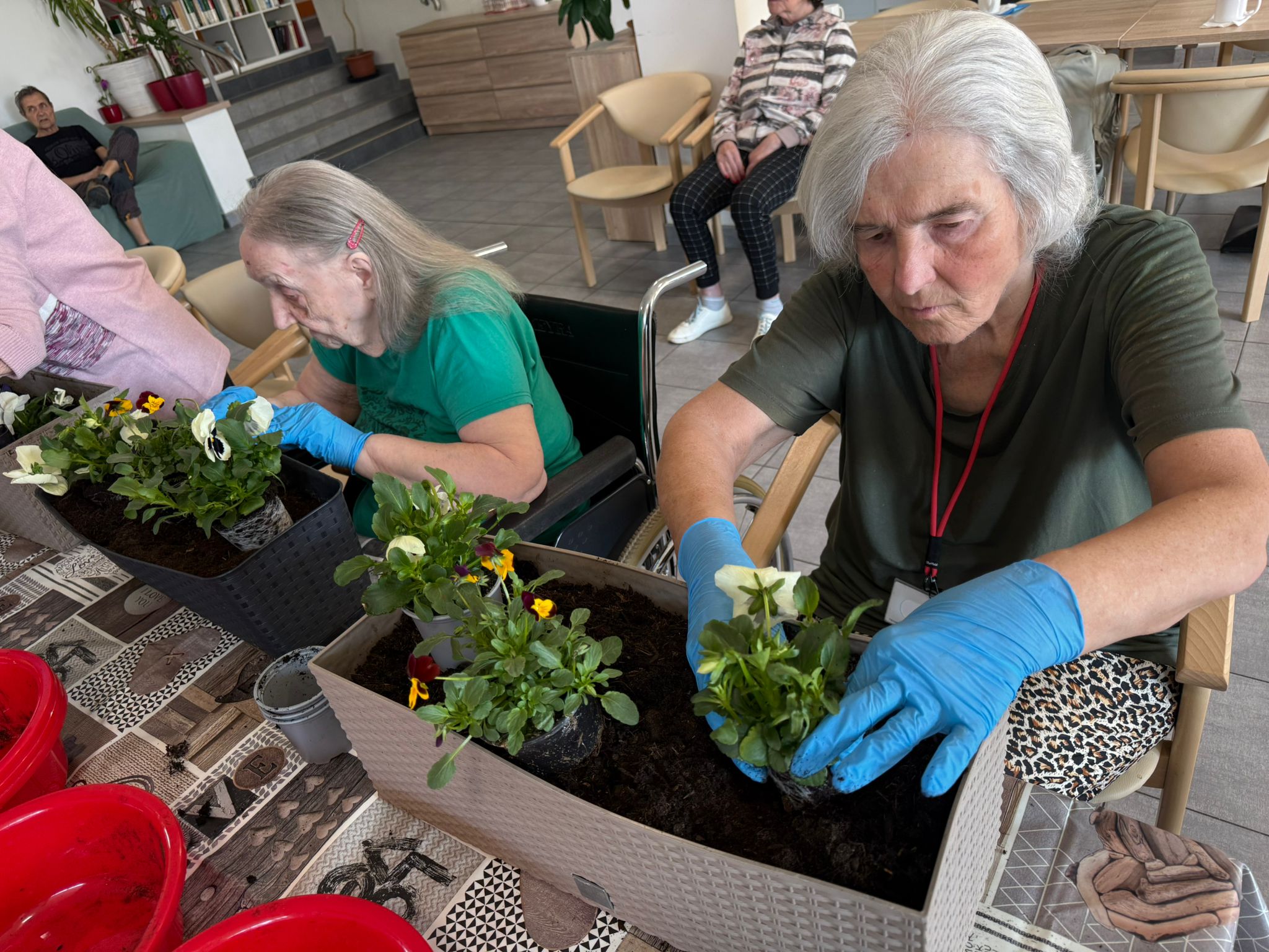 Klienti si tvorbu a sázení květin při společné aktivizaci nesmírně užili – bavilo je sázet, dotvářet květinové sadby a předhánět se ve vědomostech o květinách a vzpomínkách na svoje zahrádky. 🏡