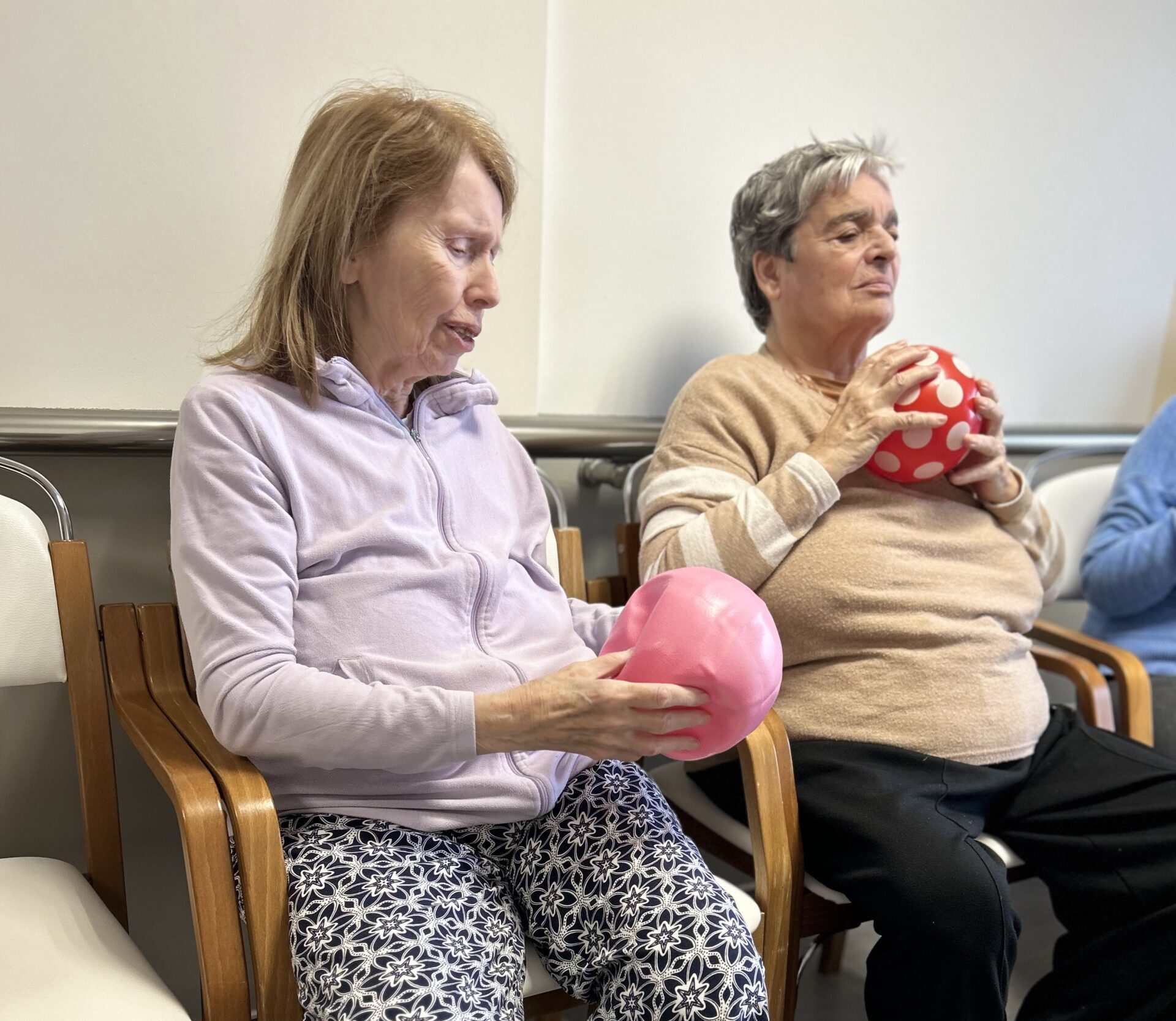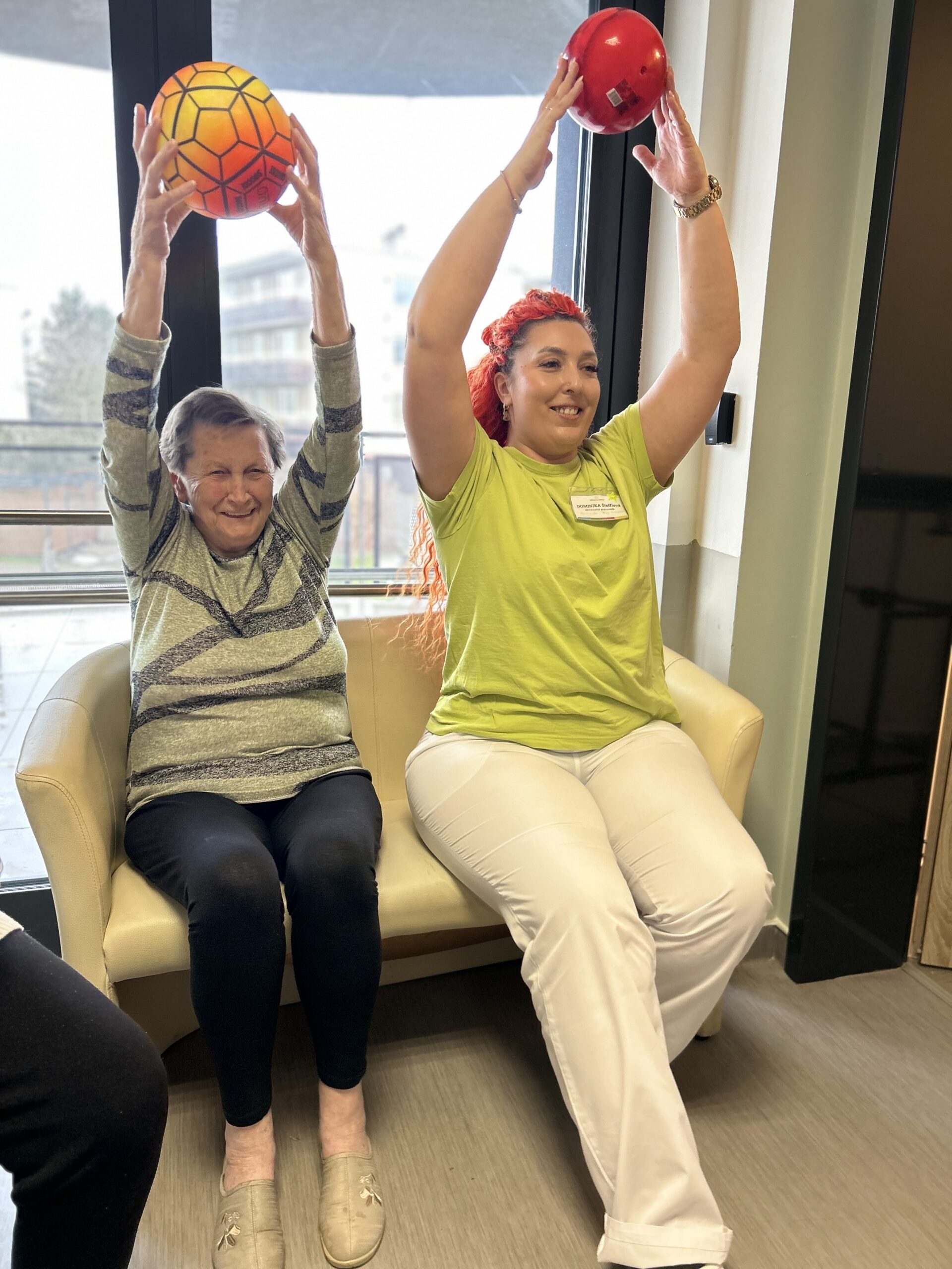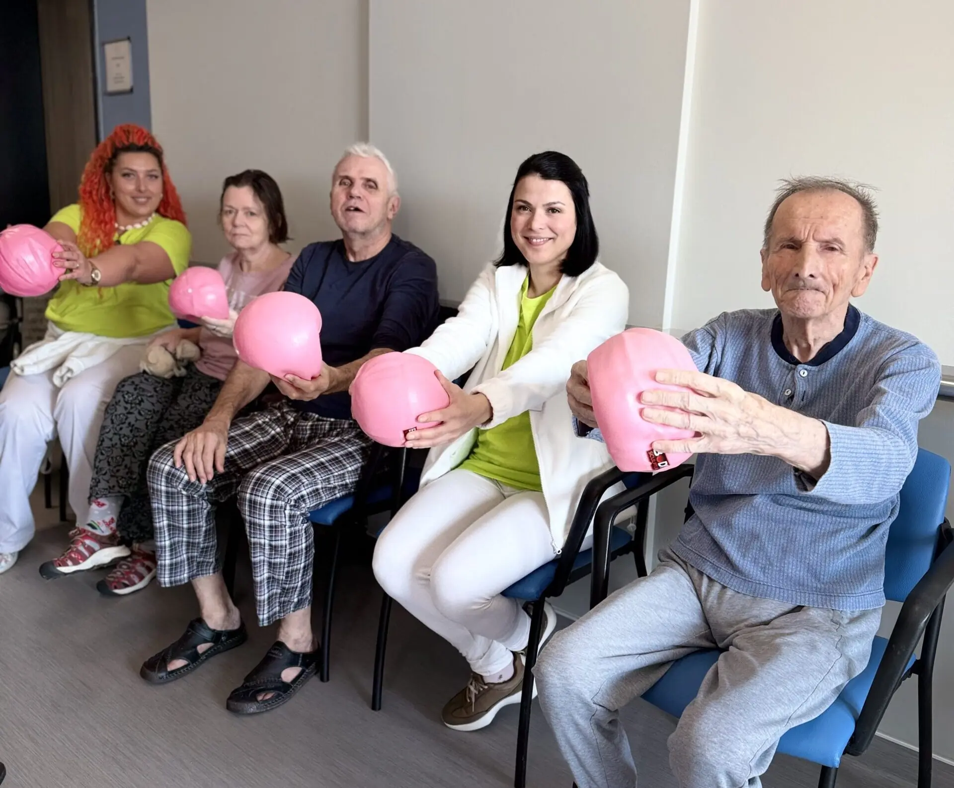 Někde se víc posiluje s pomůckami, jinde se zaměřujeme na jemné protažení na lůžku nebo v křesle, ale vždycky je u toho úsměv a dobrá nálada.