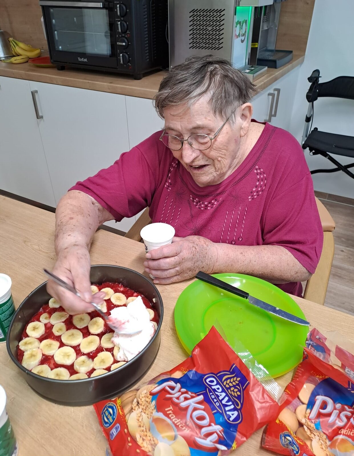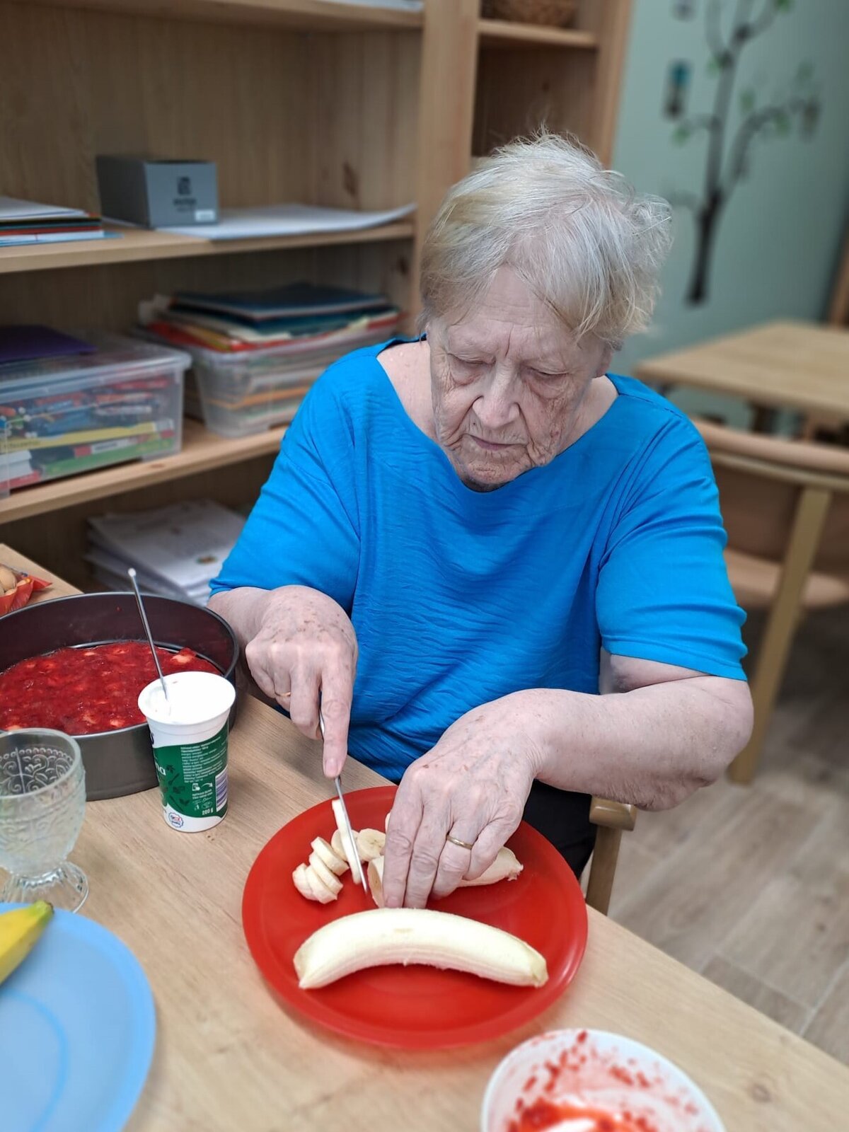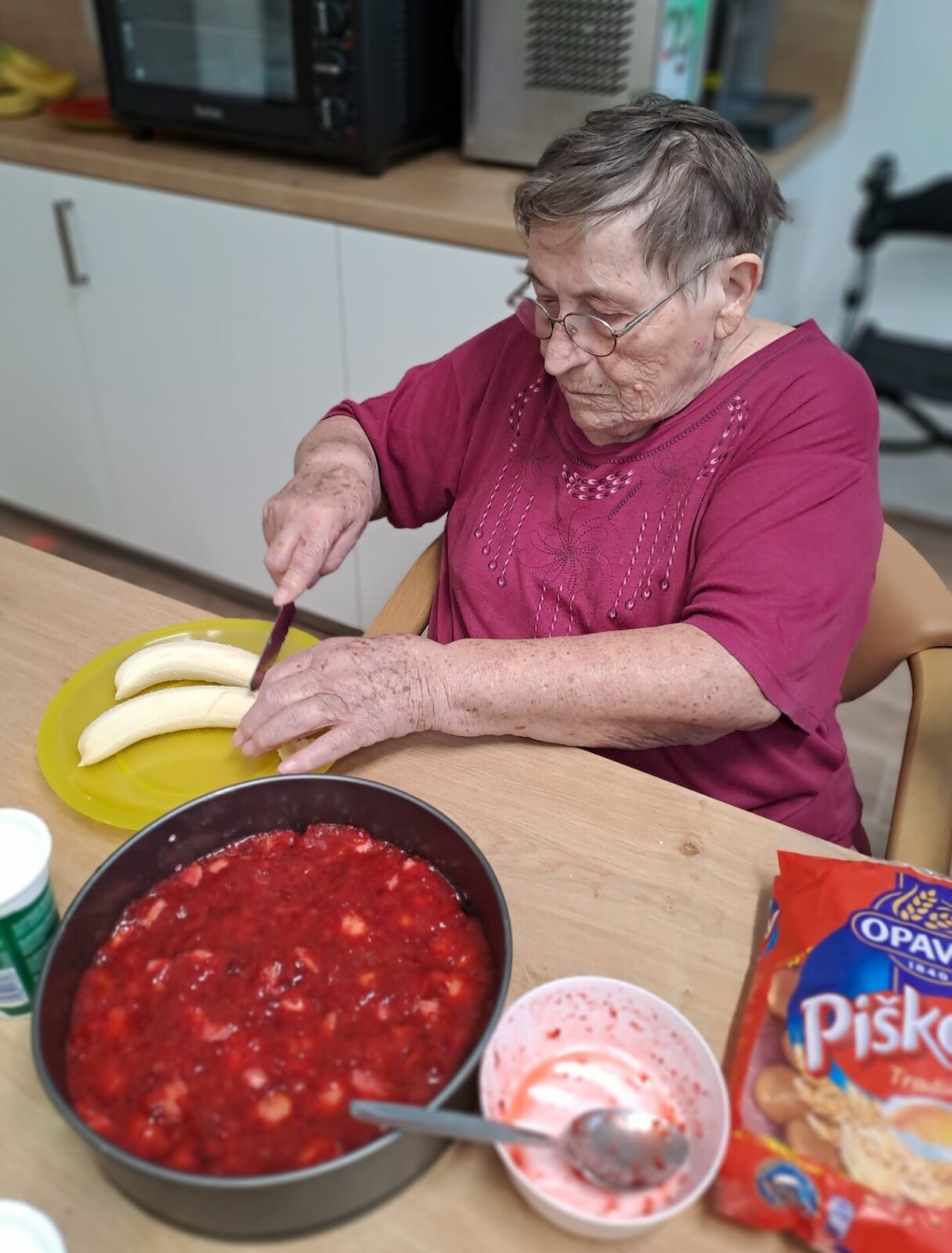 Rozhodli se pro kombinaci jahod, banánu a smetany, což poskytlo krásné barevné kontrasty. Když byl dort konečně hotov, panovala v místnosti hrdost a spokojenost. Tento dort nebyl jen důkazem jejich týmové práce, ale také připomínkou toho, že i v pokročilém věku lze stále tvořit krásné a chutné věci.😀❤️