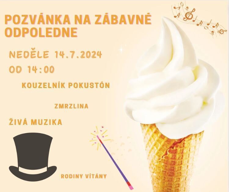 Pozvánka na zábavné odpoledne 14.7.2024 v neděli od 14 hodin. Přijede kouzelník, živá muzika a bude i zmrzlina