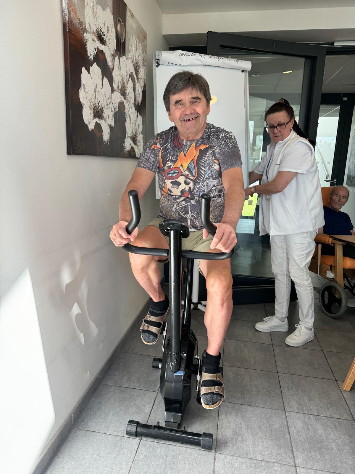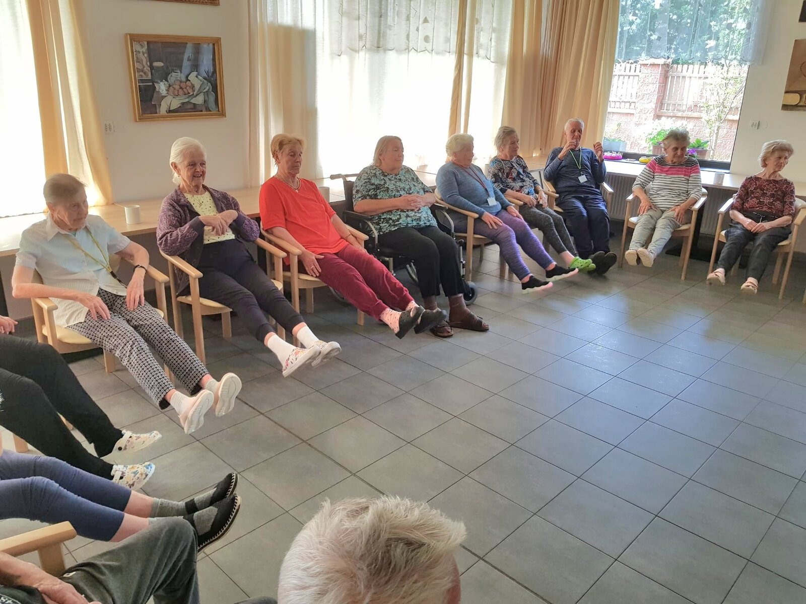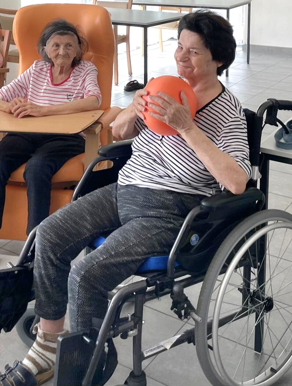 Každý všední den mají klienti možnost zapojit se do rozcviček s rehabilitační sestřičkou. Využívají k tomu různé pomůcky a cvičení klienty vždy velmi baví.