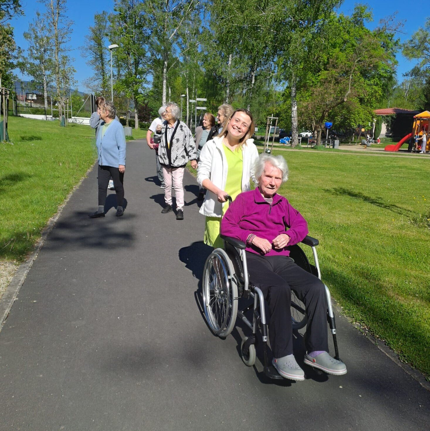 Smích a radostné povídání zaplnily vzduch, když se klienti dělili o své vzpomínky a příběhy spojené s jednotlivými květinami. Procházka byla nejen příležitostí k pohybu a pobytu na čerstvém vzduchu, ale také k aktivizaci jejich paměti a procvičení smyslů. Díky těmto aktivitám se klienti cítili spokojeněji a propojeněji s přírodou i se svými vzpomínkami. ❤️😀