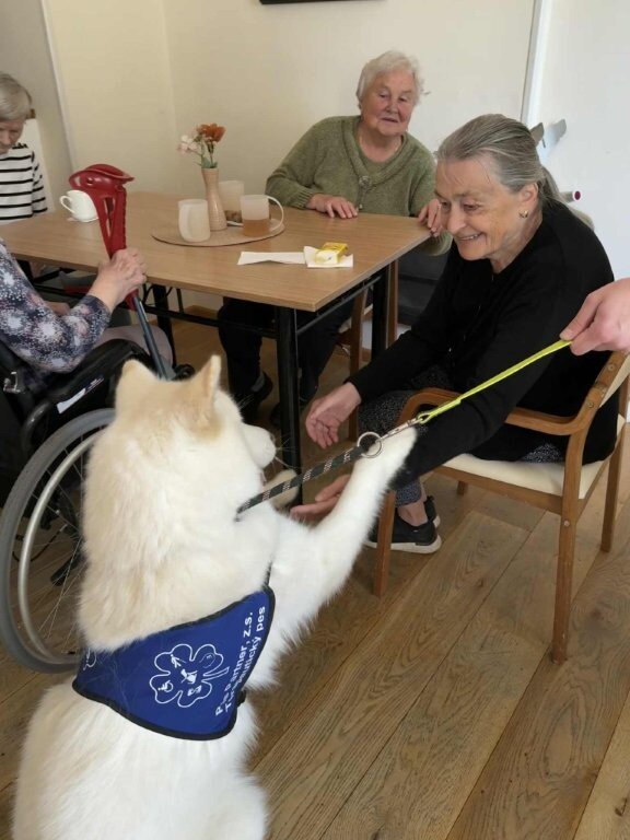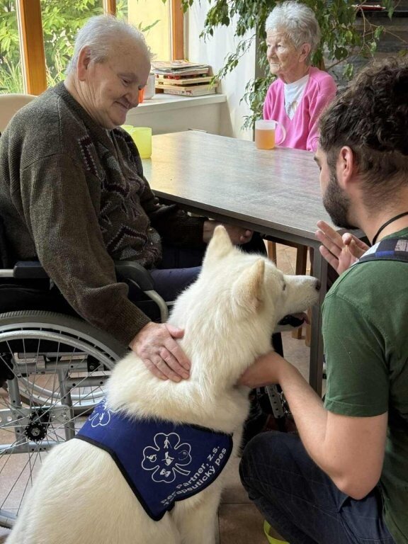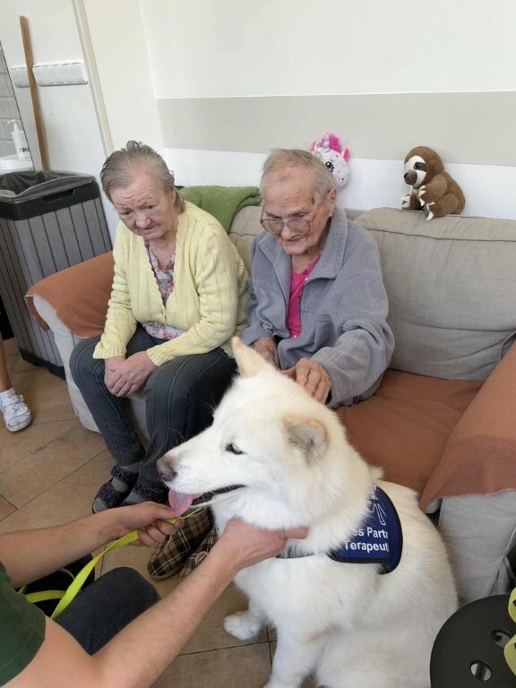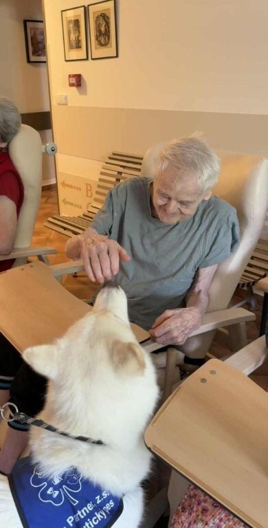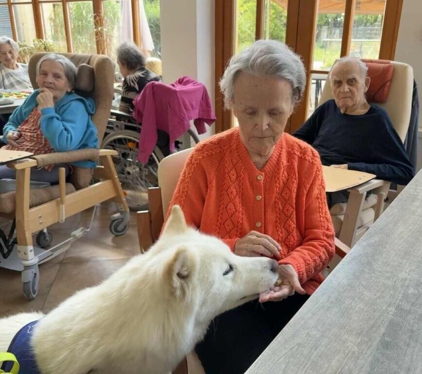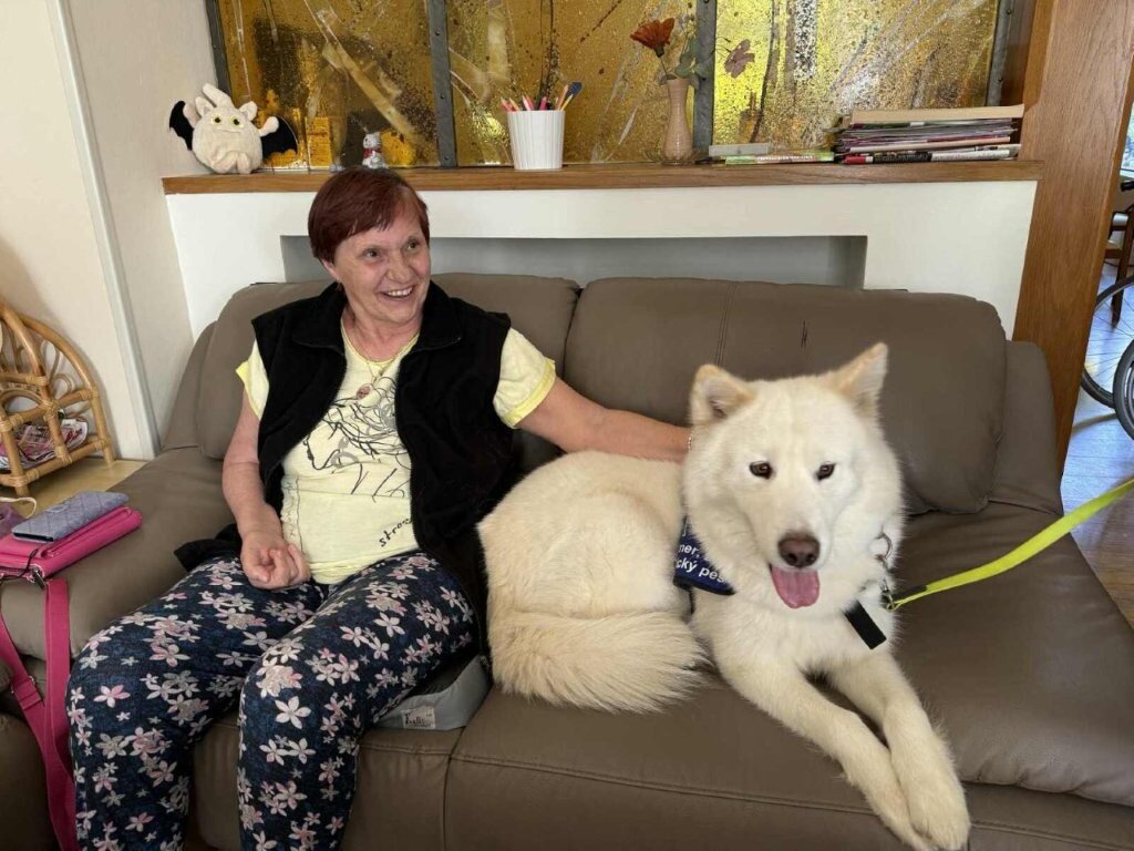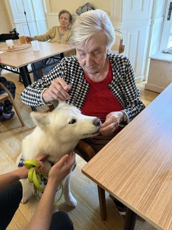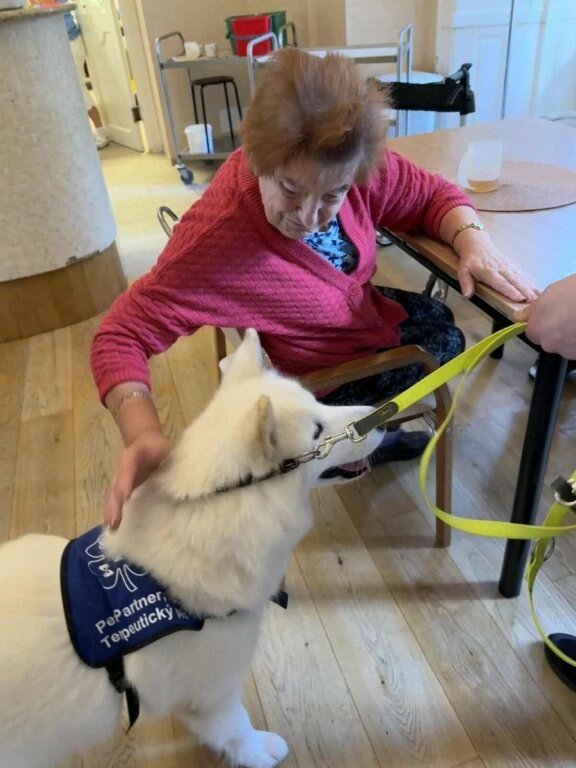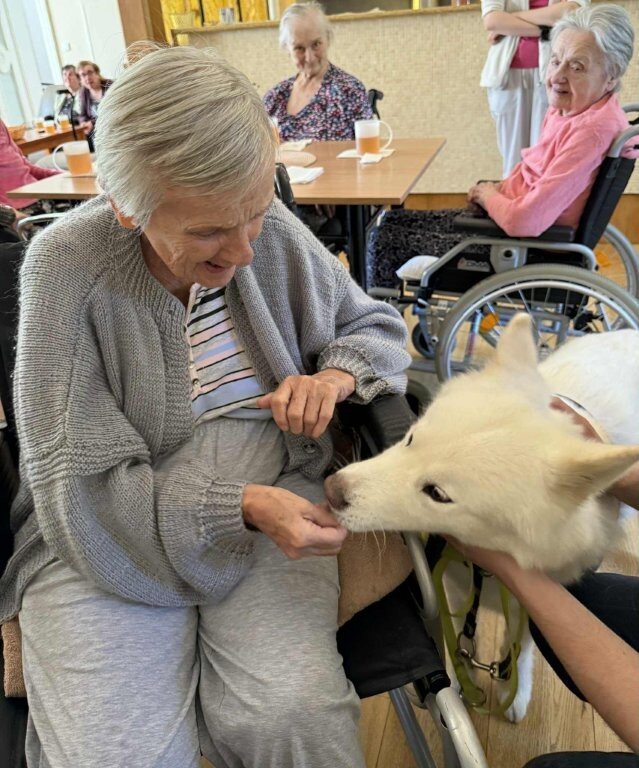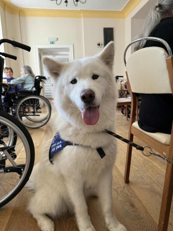 Dnes nás poprvé navštívila krásná bílá malamutka Janika – speciálně vycvičená ke canisterapii.