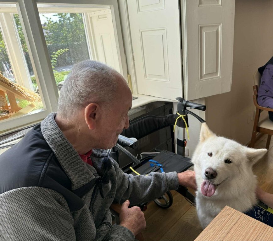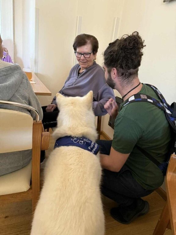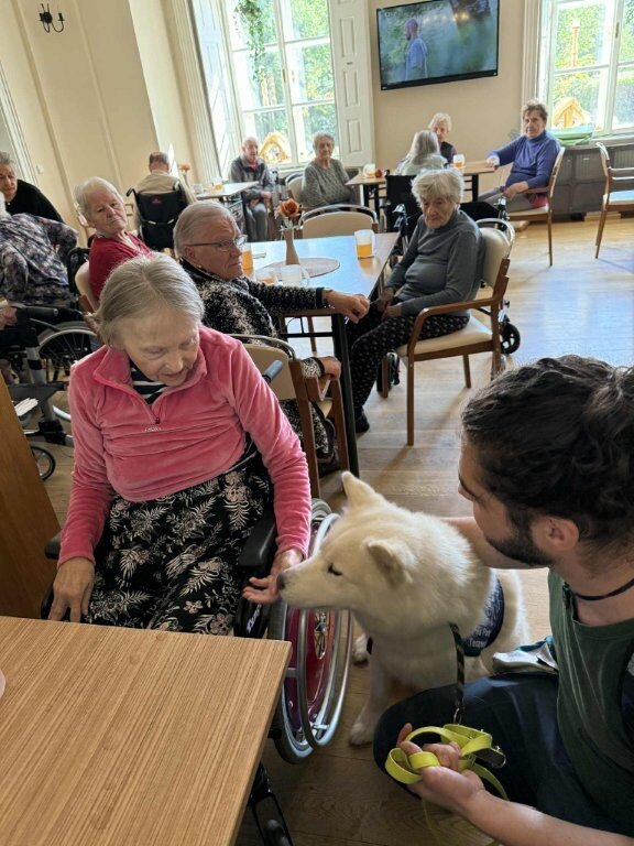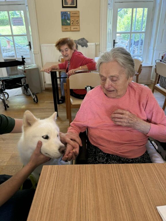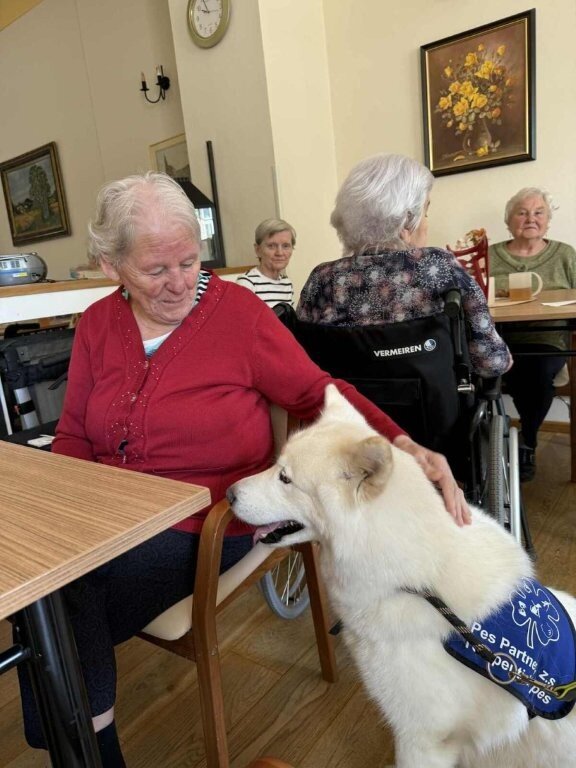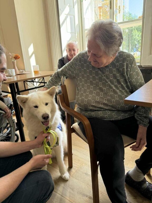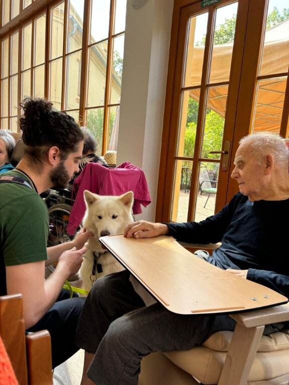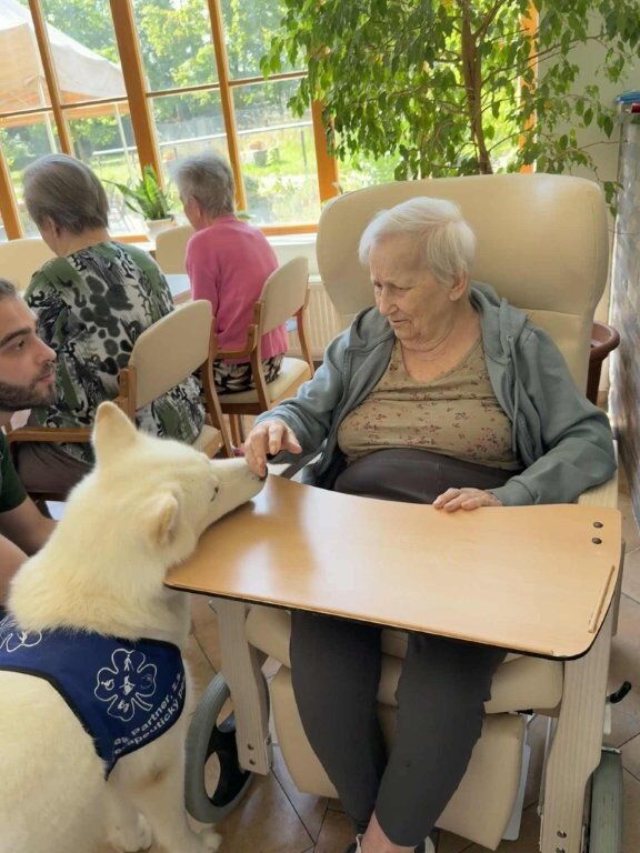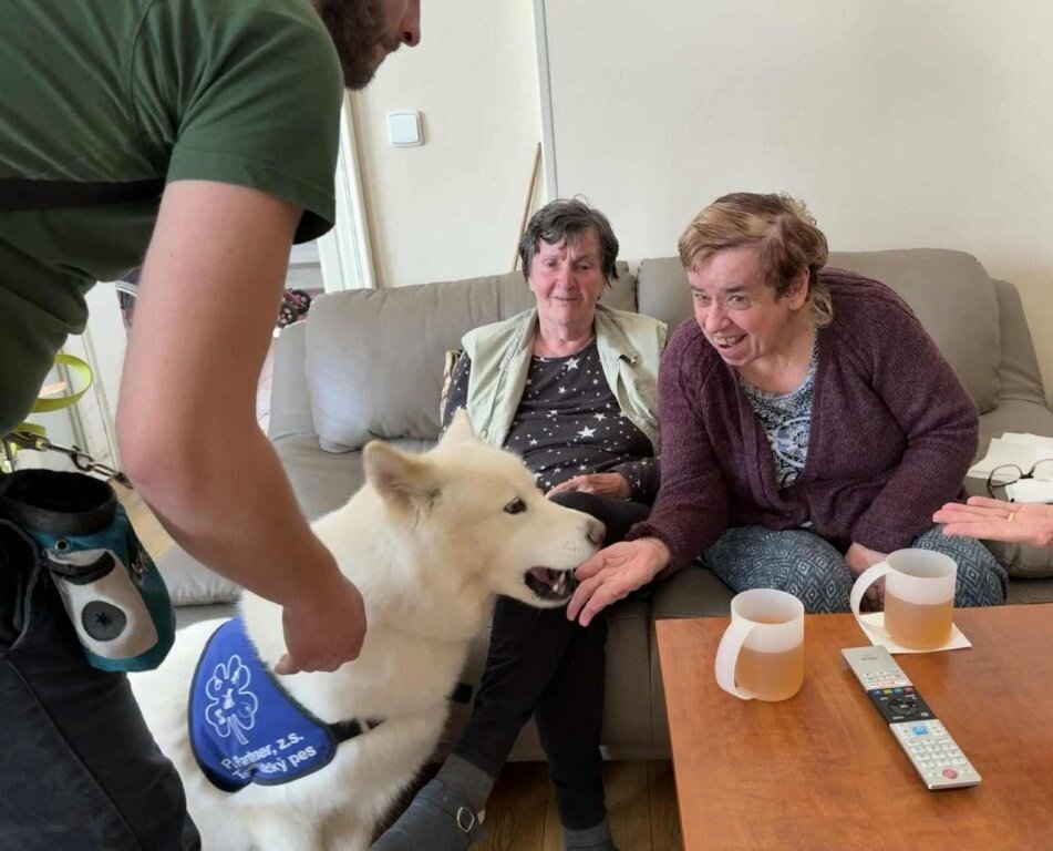 Dnes nás poprvé navštívila krásná bílá malamutka Janika – speciálně vycvičená ke canisterapii.