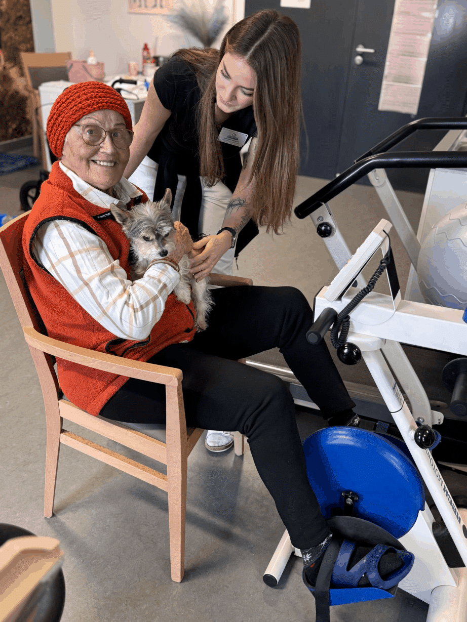 Rehabilitační sestry se věnovaly každému individuálně, ať už v pokojích nebo ve fitness tělocvičně, a s jejich odborným vedením se klienti zapojili do cvičení přizpůsobených jejich potřebám a schopnostem. Přítomnost pejska navíc vnesla do každého setkání klid a pohodu. Klienti se mohli se čtyřnohým kamarádem nejen pomazlit, ale také se s ním vyfotit, což bylo pro mnohé velmi příjemným zážitkem.