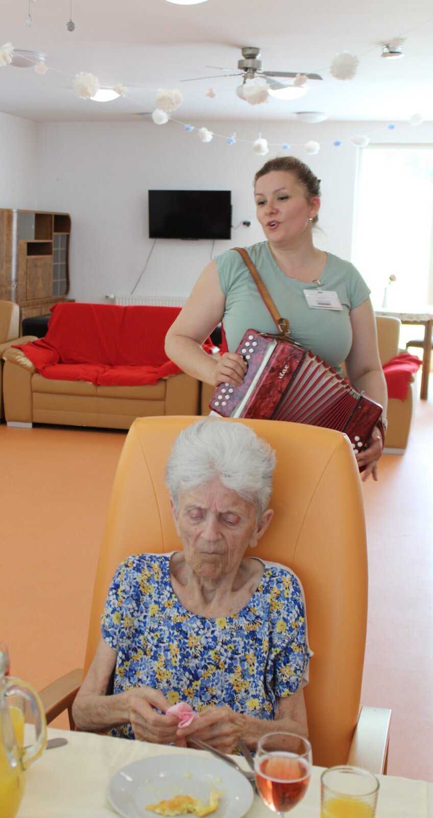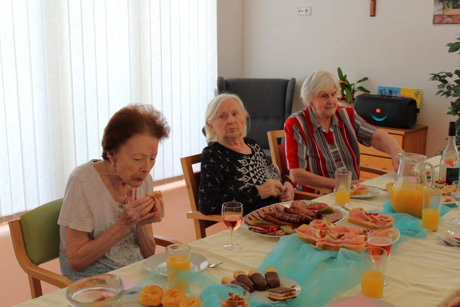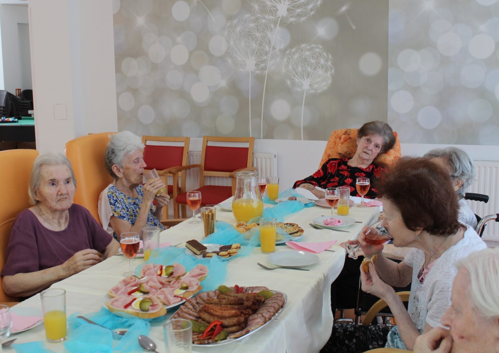 Oslavili jsme narozeniny s červencovými oslavenci. Povídali jsme si, vzpomínali, vyprávěli si příhody a zpívali si za doprovodu harmoniky. Některým příhodám jsme se všichni zasmáli, jiné nás, jak se říká, pohladily po srdíčku. V průběhu oslavy si klienti pochutnávali na občerstvení, které donesly jejich rodiny.