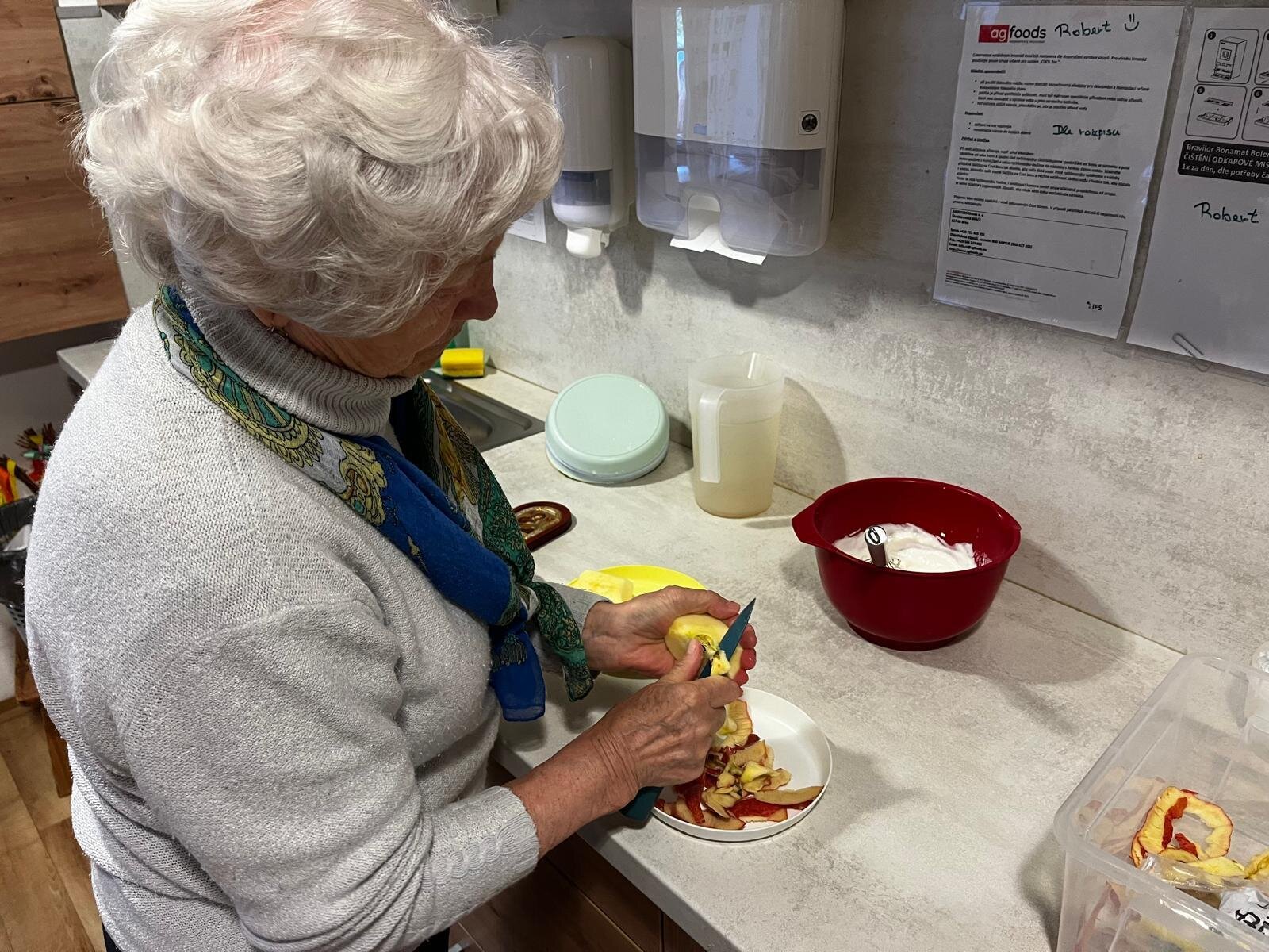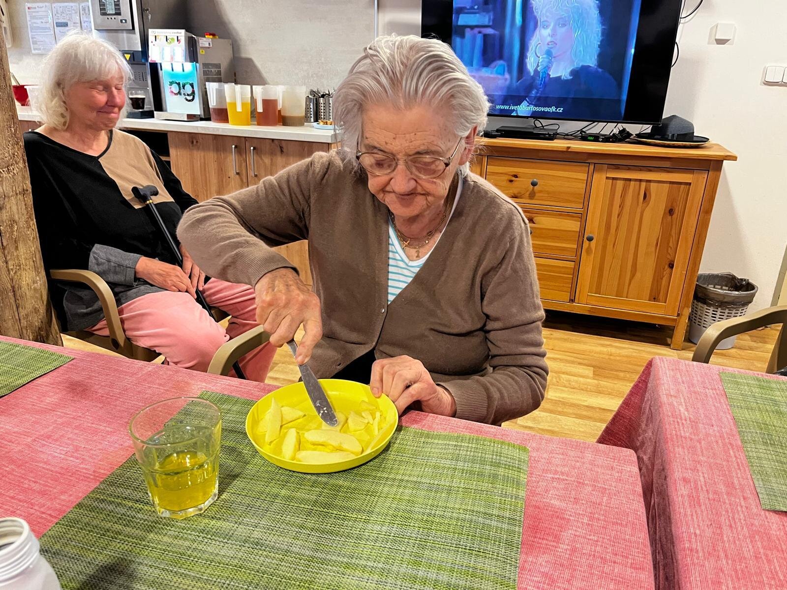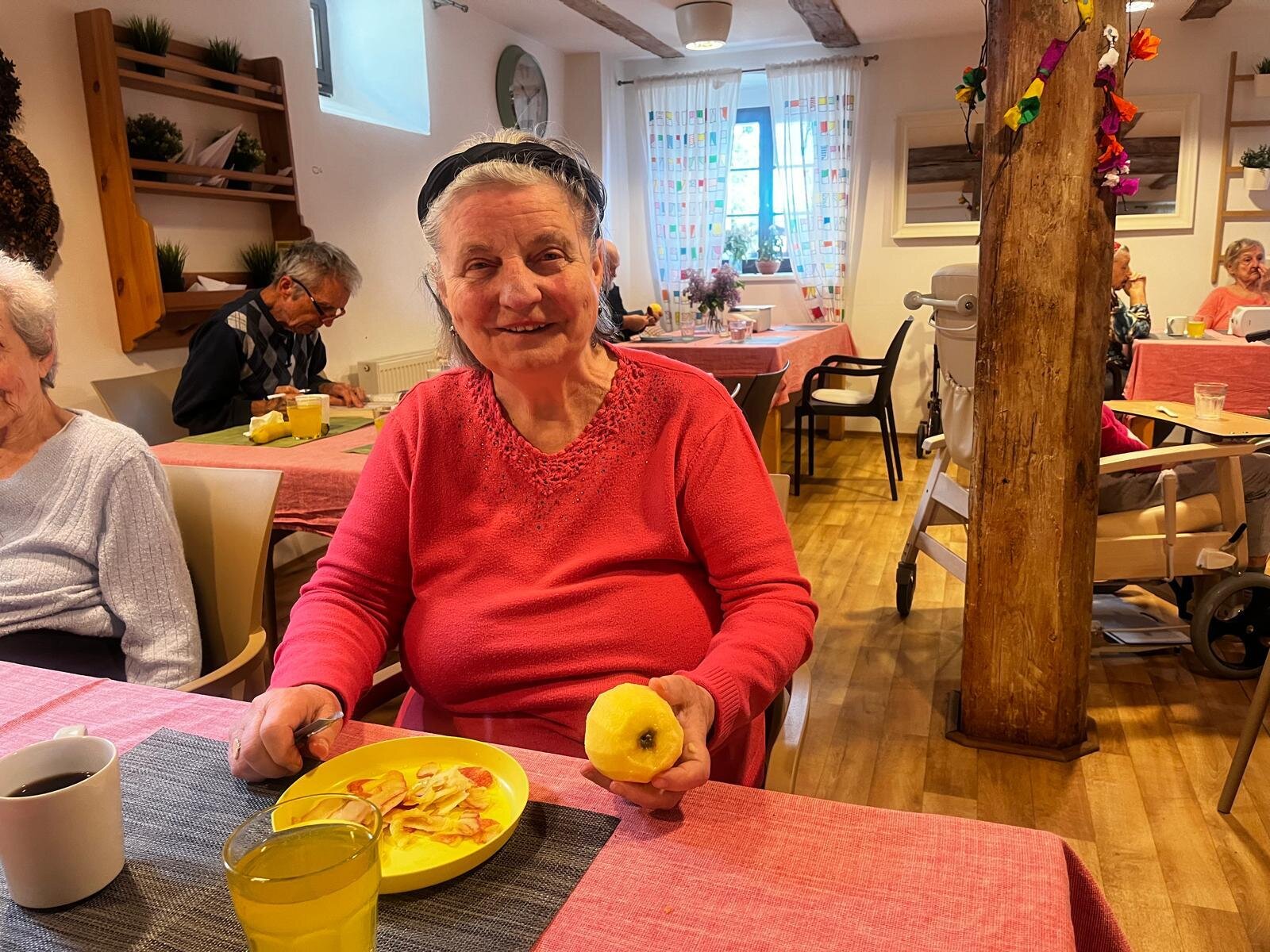 V Senevida Pyšely se po chodbách linula krásná vůně. Klienti pekli jablkový koláč s drobenkou. Do příprav se zapojili všichni klienti, protože motivace, že si k odpolední kávě dají domácí sladkou dobrotu, byla velká. Koláč se velmi povedl, a všichni si pochutnali.