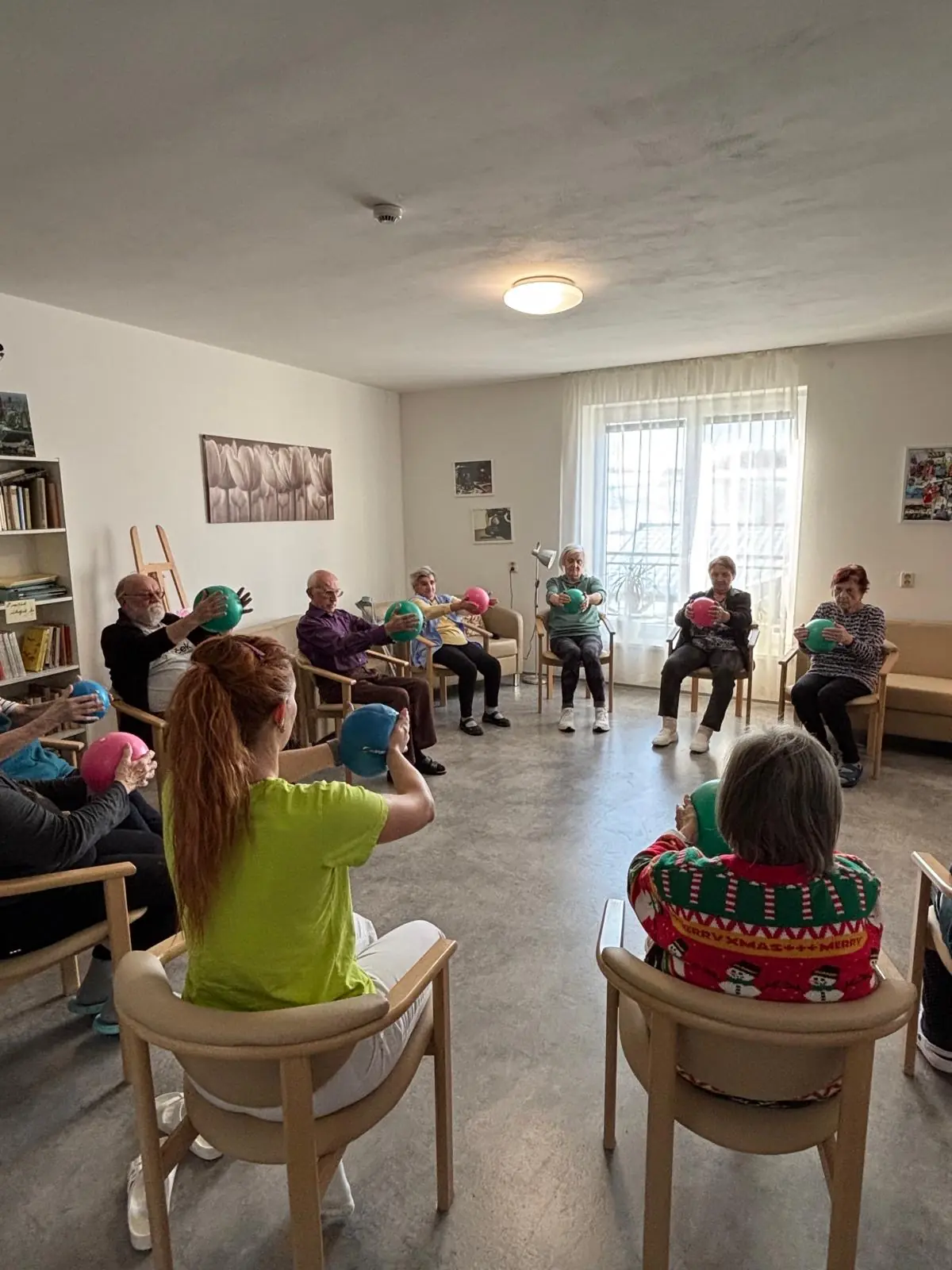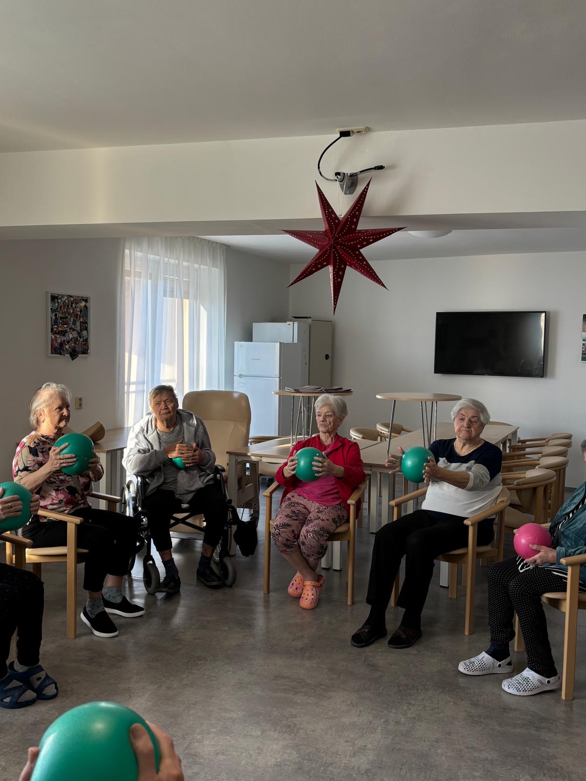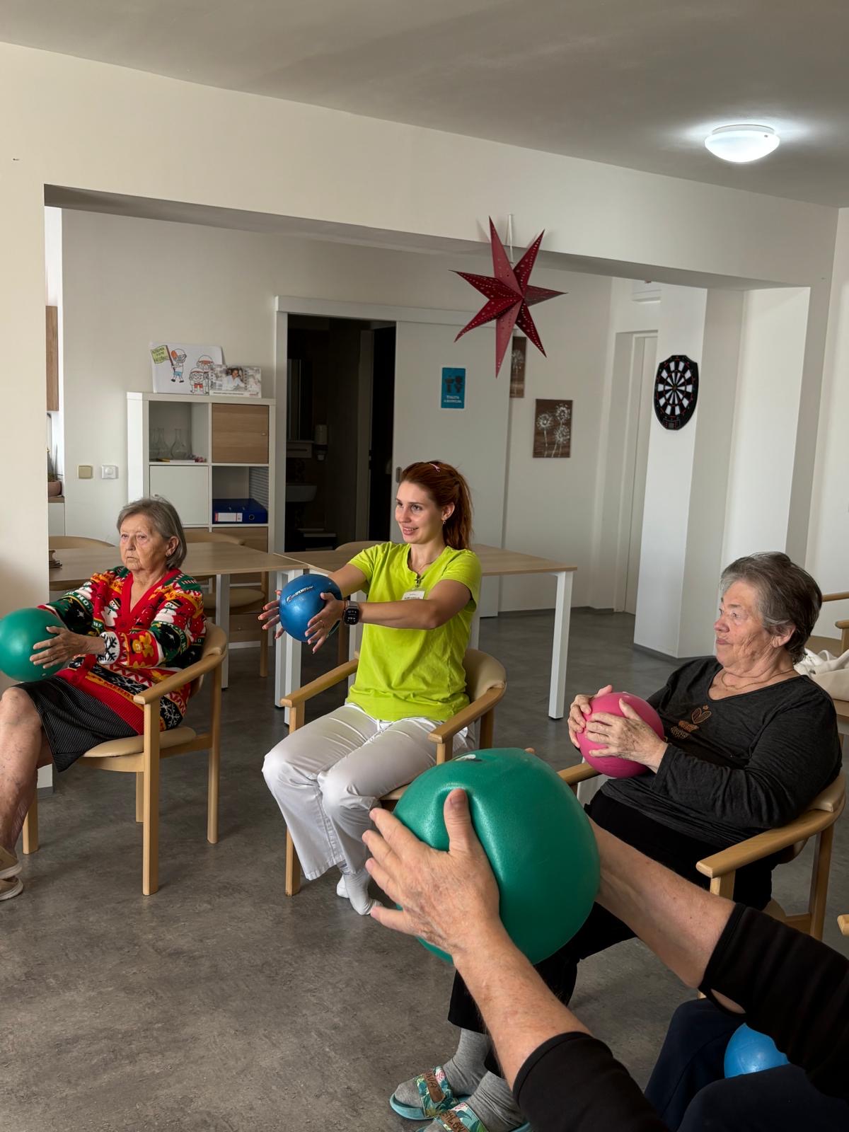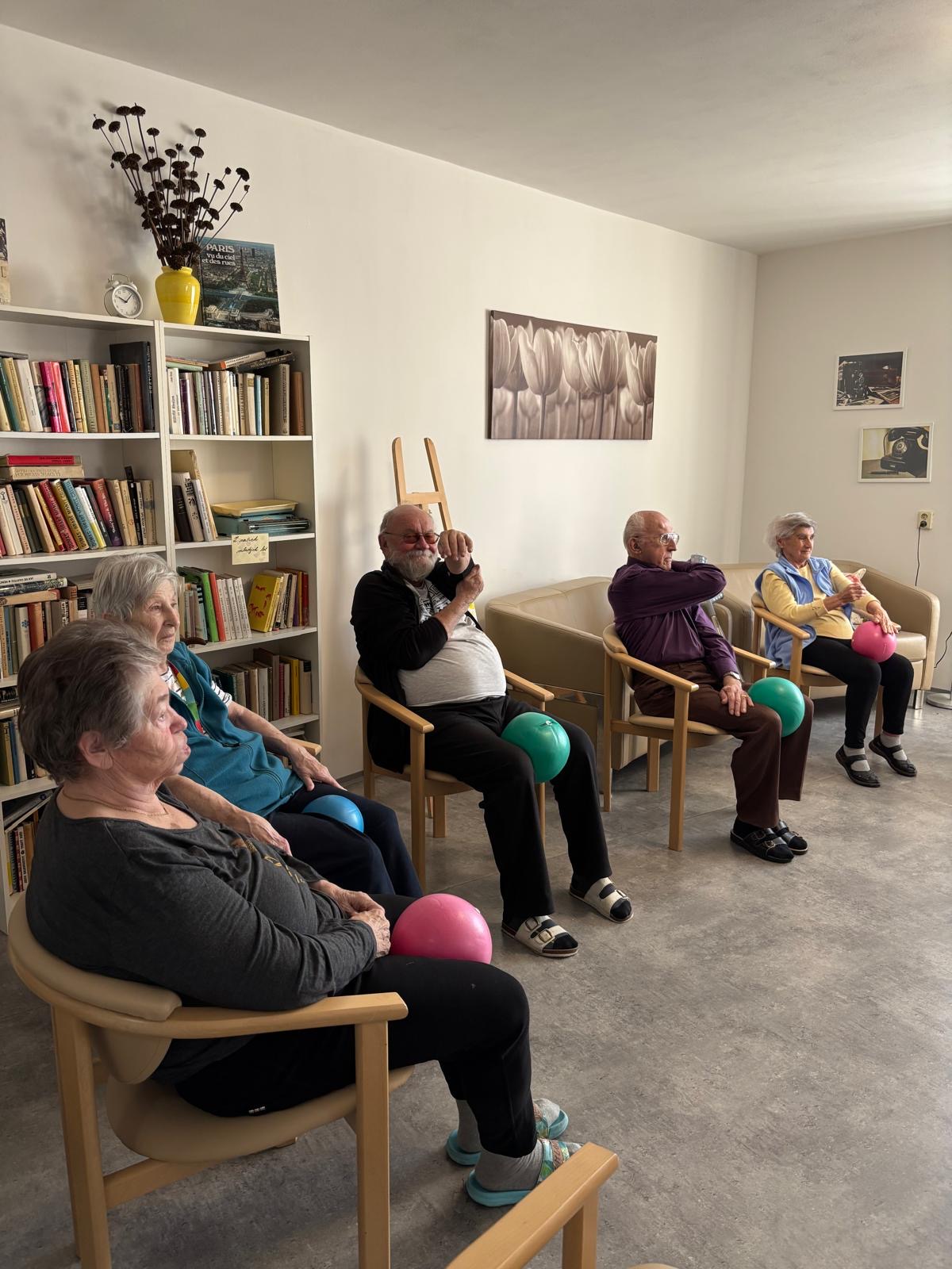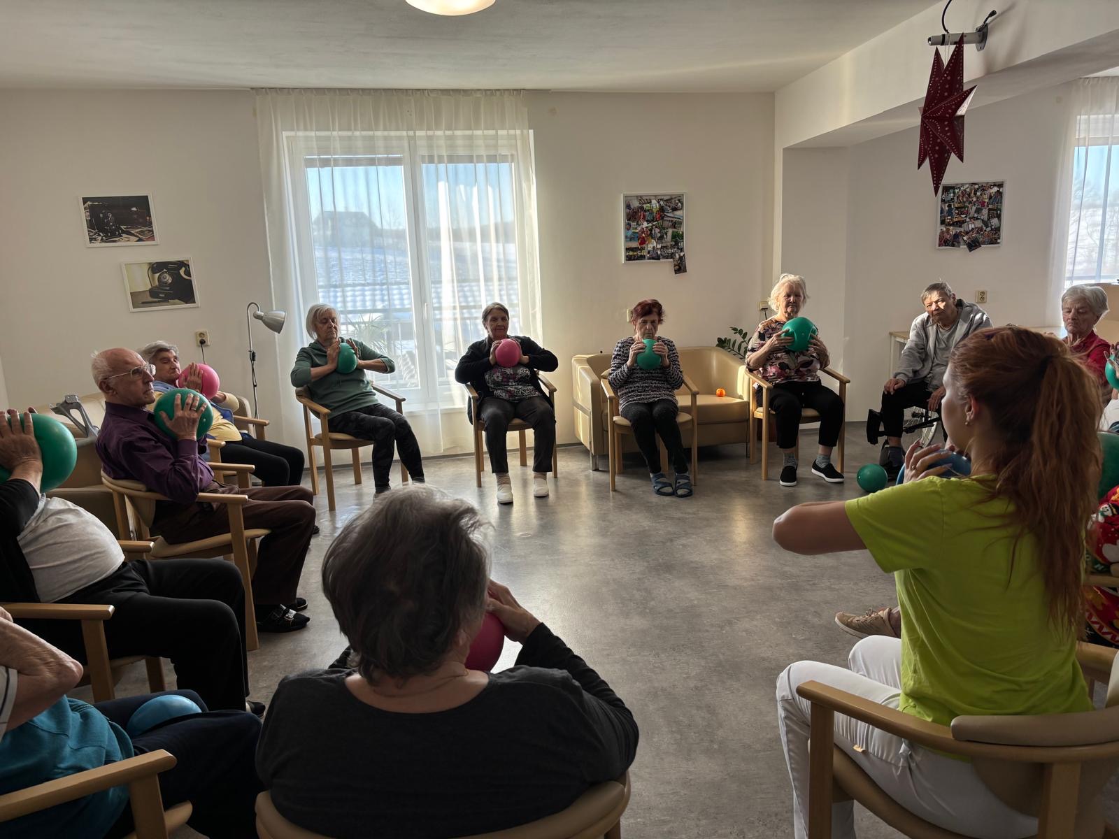 Pravidelně pořádáme u nás v domově minimálně jednou týdně cvičení na židlích s overbally, kde se zaměřujeme na opatrné posilování svalů pomocí práce s vlastní váhou, vhodné pro seniory, které je promyšlené tak, abychom eliminovali riziko vzniku úrazů nebo pádů. Dále se také protahujeme a učíme se tzv. krabicové dýchání.
