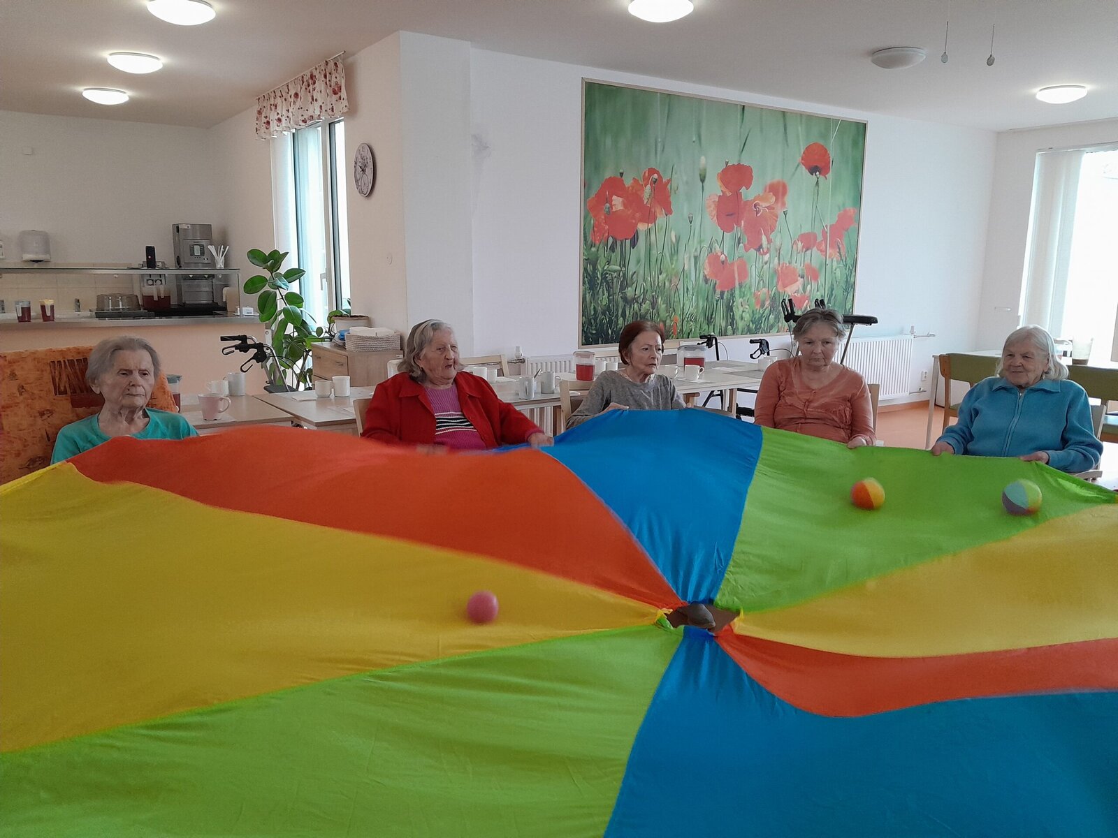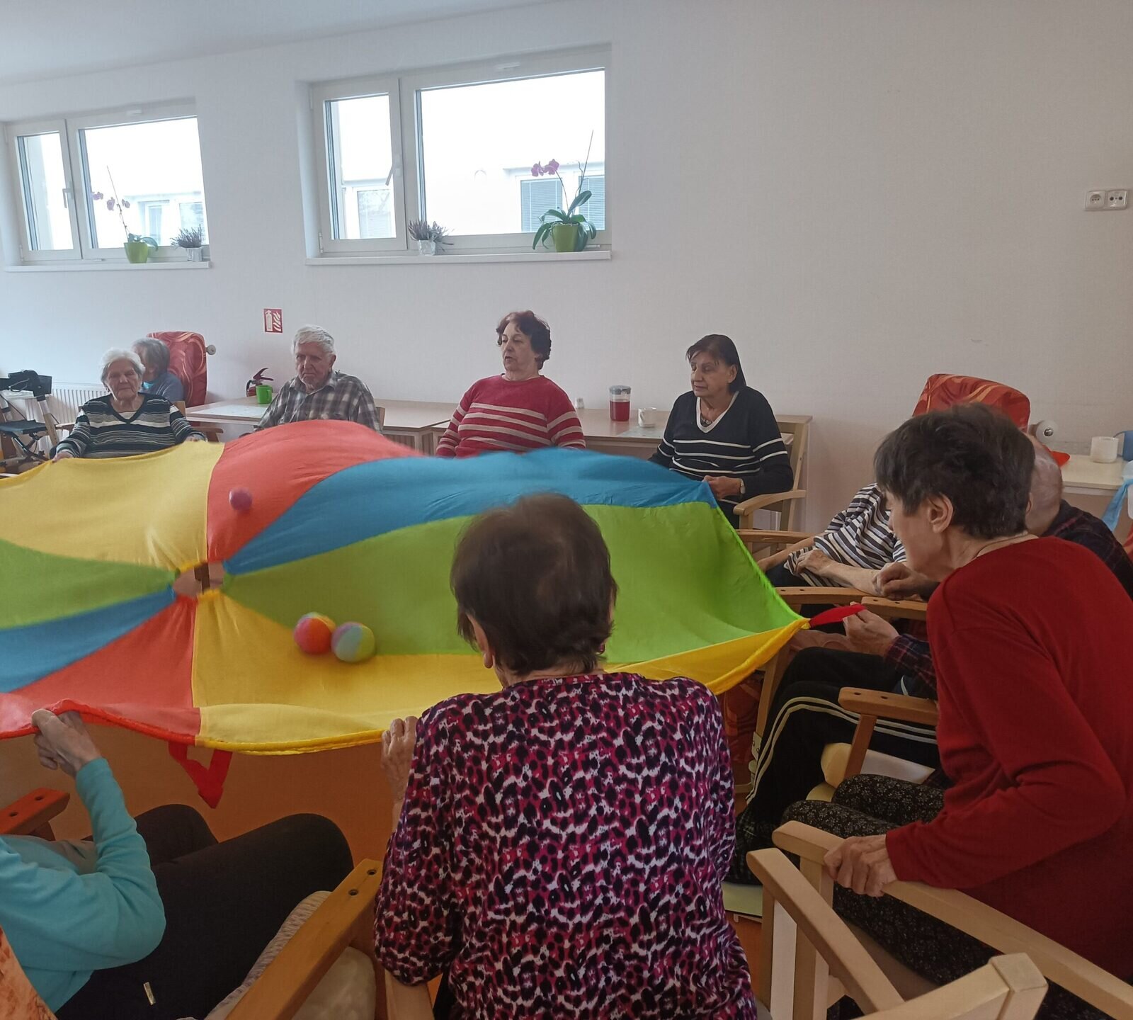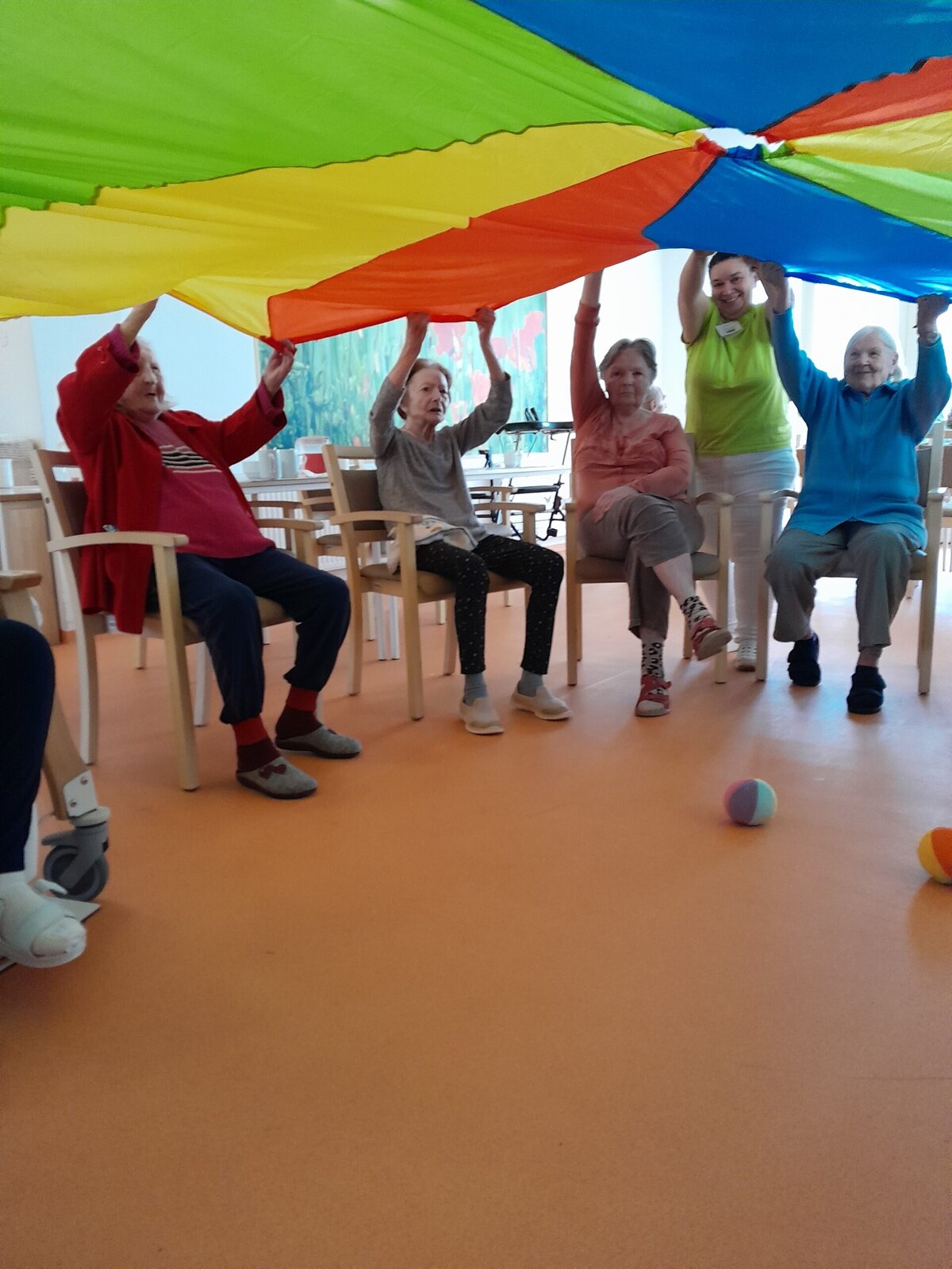 Cvičení s padákem vypadá jednoduše jako hra, avšak je to také dobré posílení rukou a horní části těla. Zvedáním padáku nám míč pobíhal po barevných vlnách, sotva jsme ho někdy stačili sledovat. V Senevida Zlín jsme si s ním dobře zacvičili.