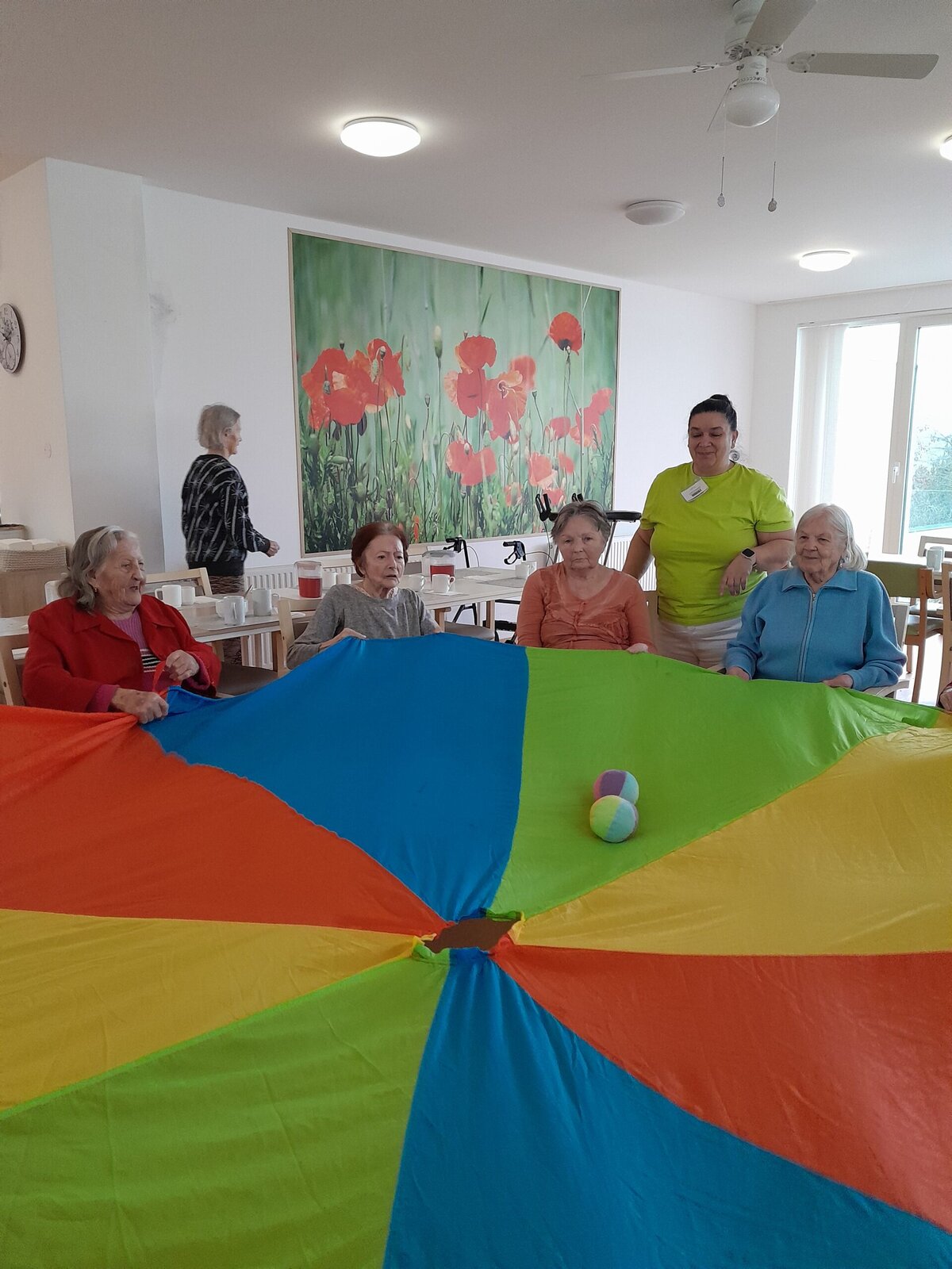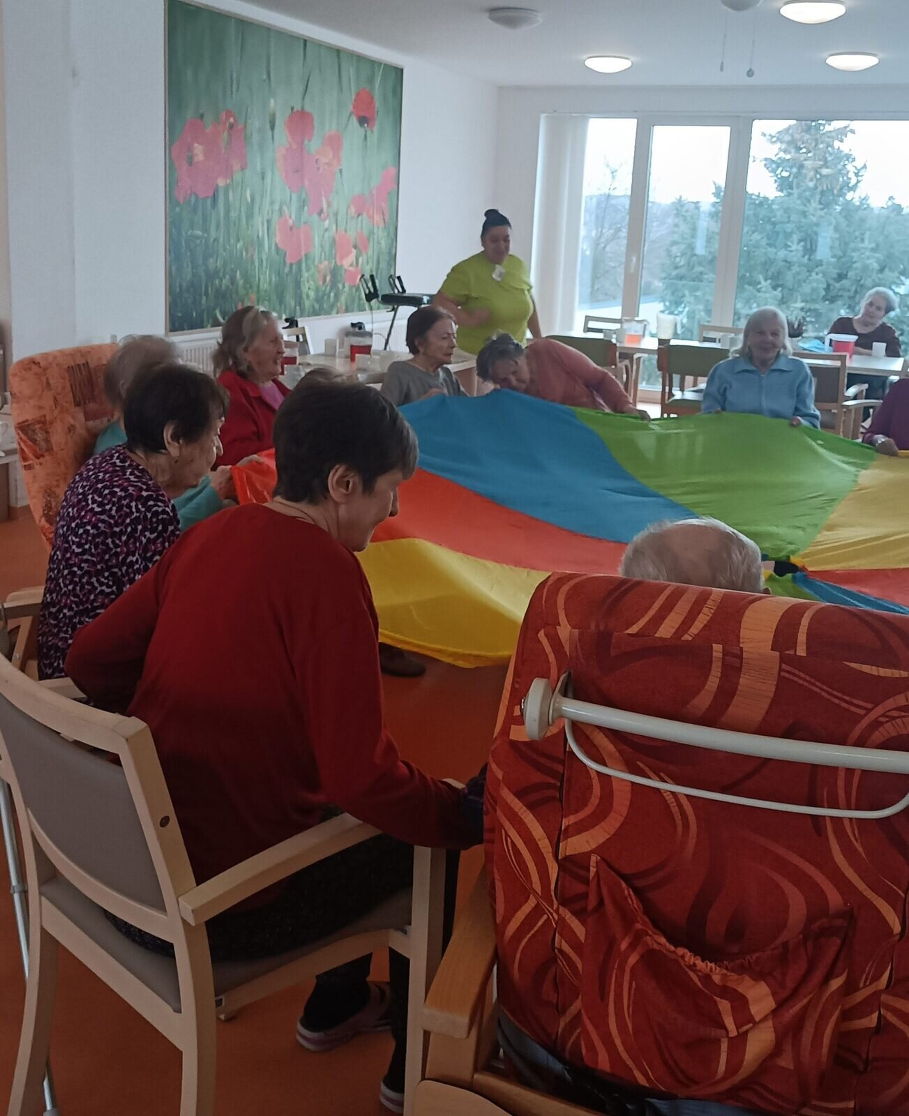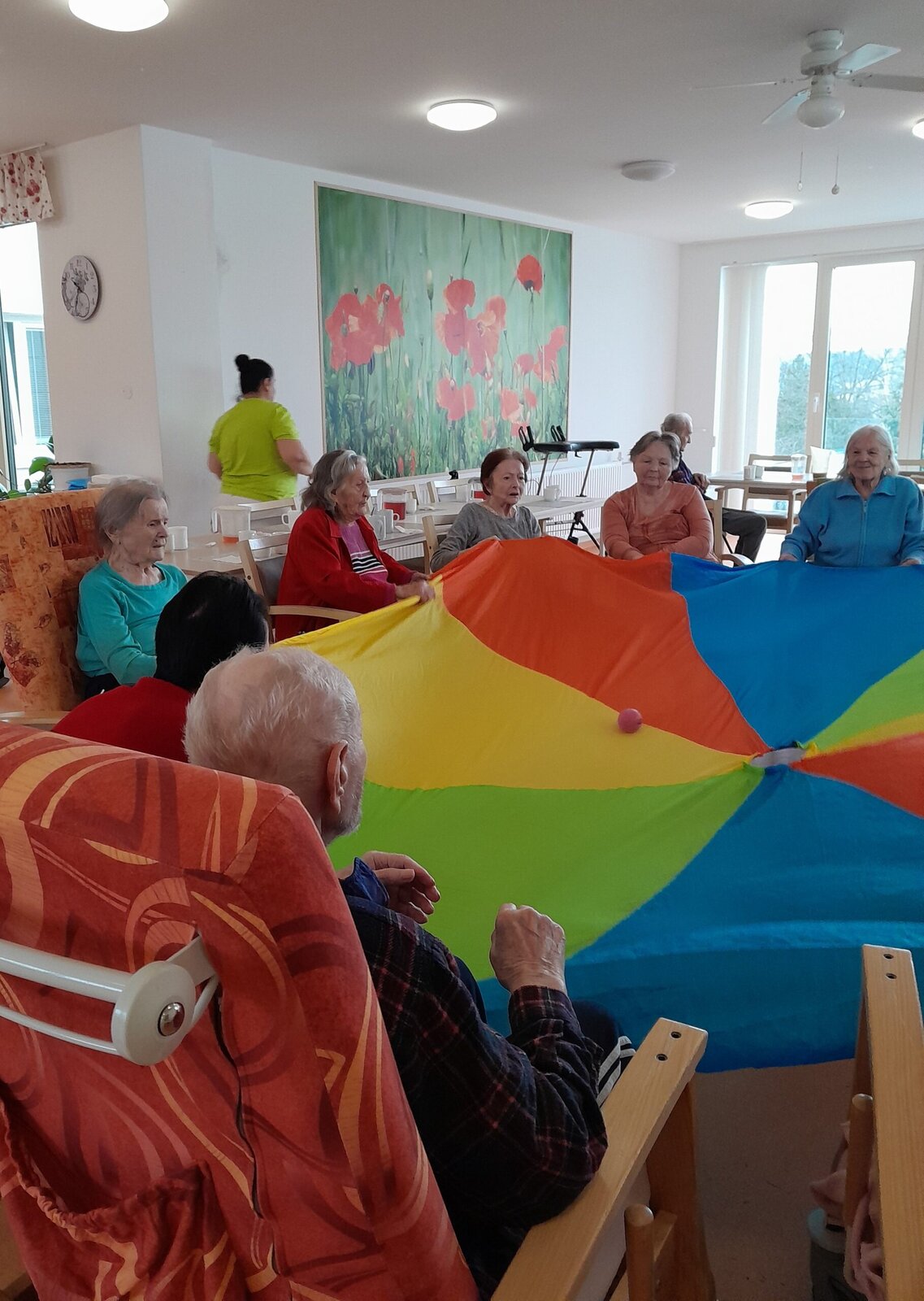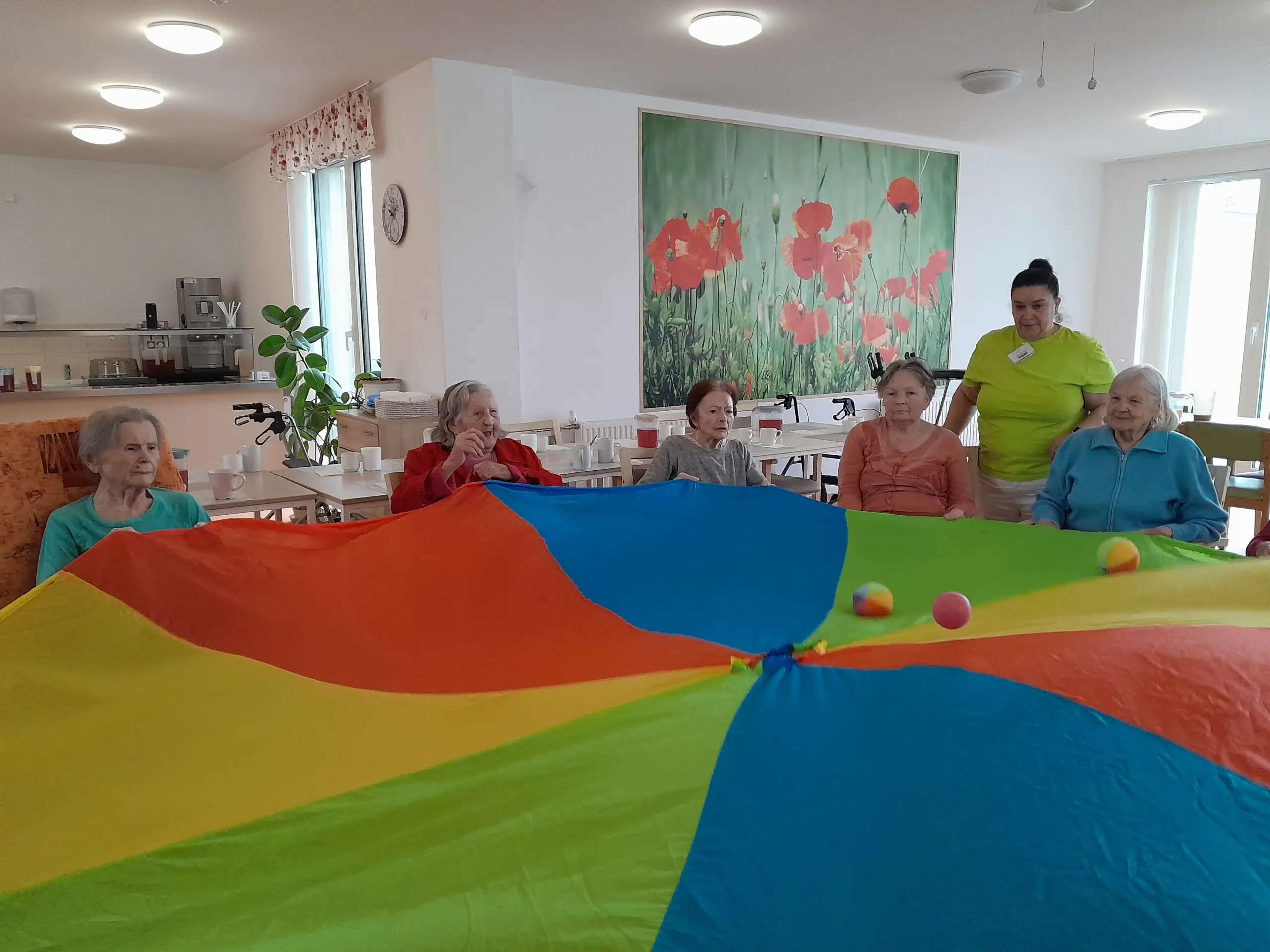 Cvičení s padákem vypadá jednoduše jako hra, avšak je to také dobré posílení rukou a horní části těla. Zvedáním padáku nám míč pobíhal po barevných vlnách, sotva jsme ho někdy stačili sledovat. V Senevida Zlín jsme si s ním dobře zacvičili.