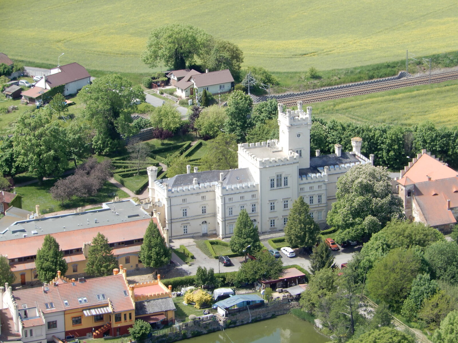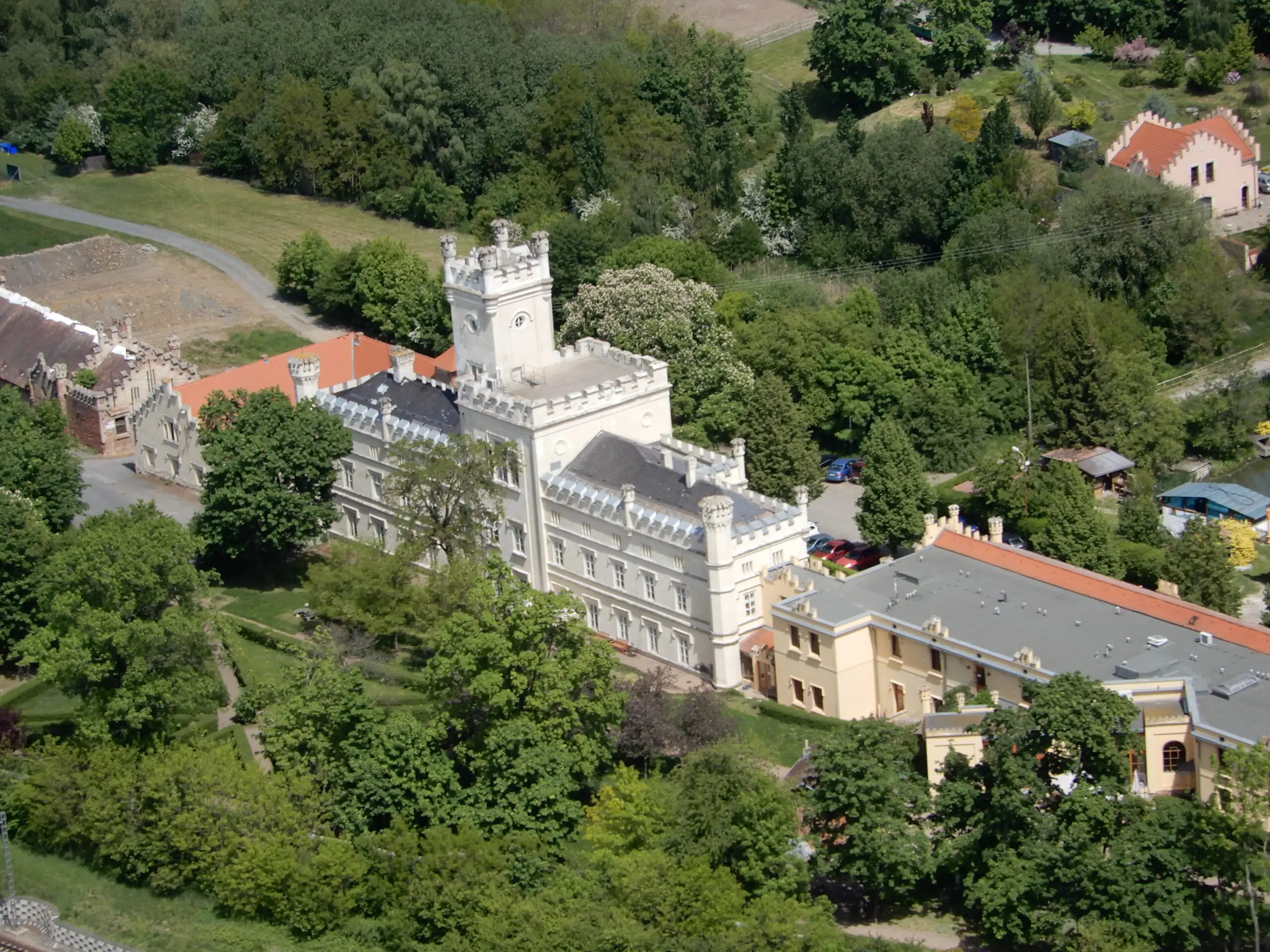 Na snímku je náš novorenezanční zámek s charakteristickými věžemi zachycen ze všech úhlů, a to včetně zámecké zahrady, pokračujícího parku a přilehlého okolí.