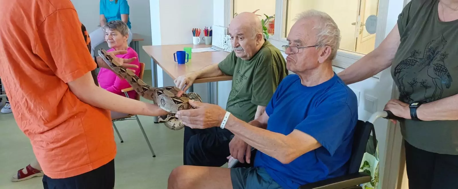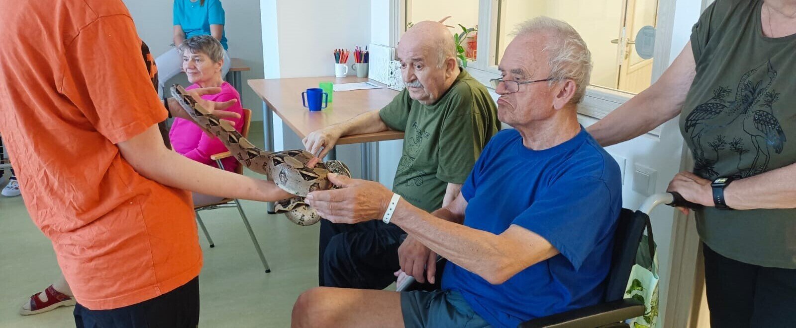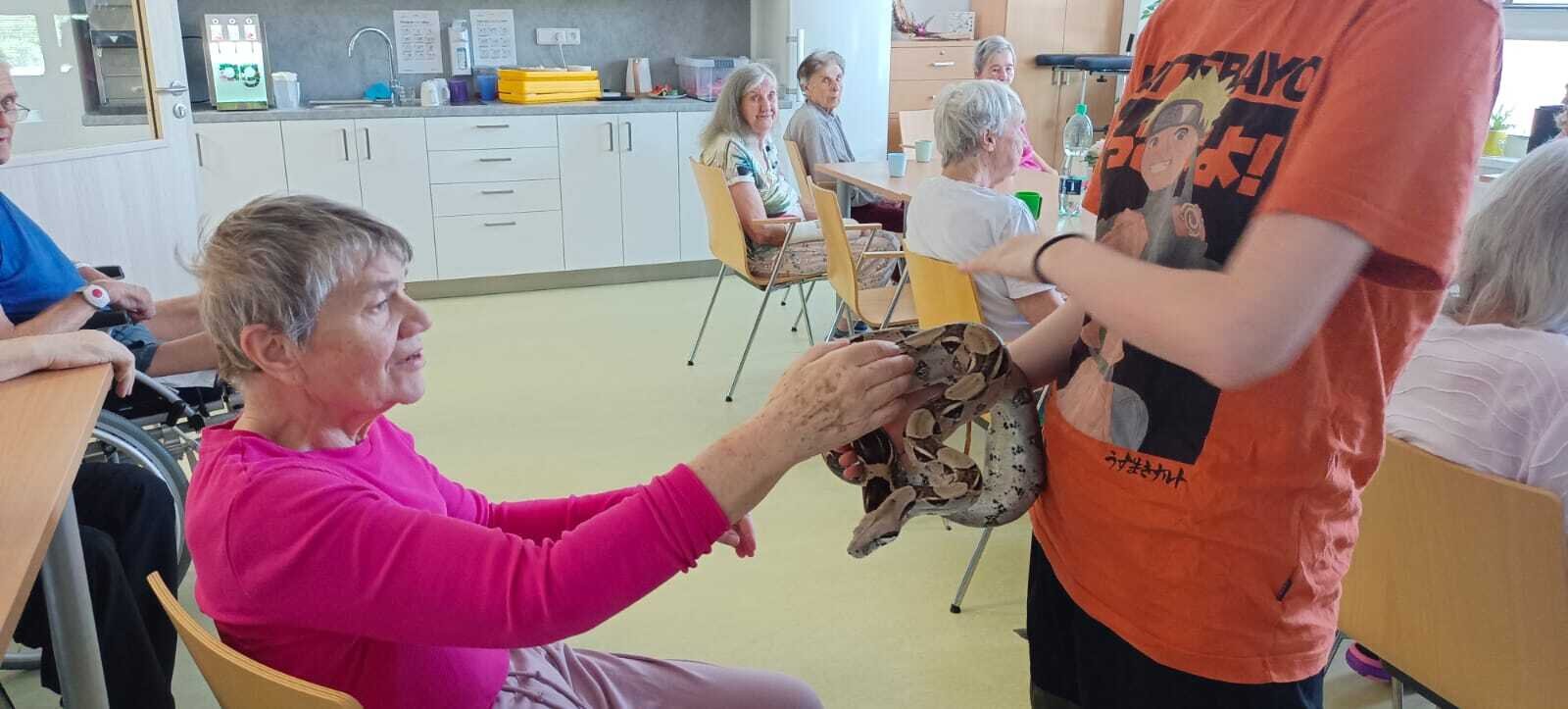 Již podruhé nás navštívila Smith animals. Naši klienti v Senevida Nepomuk měli možnost pohladit si želvu, ještěrku, ale i velkého hada. 🐍🦎 Měli jsme k tomu i výklad s informacemi čím se taková zvířata živý a jak žijí. Naše klienty návštěva vždy potěší 👍🍀.