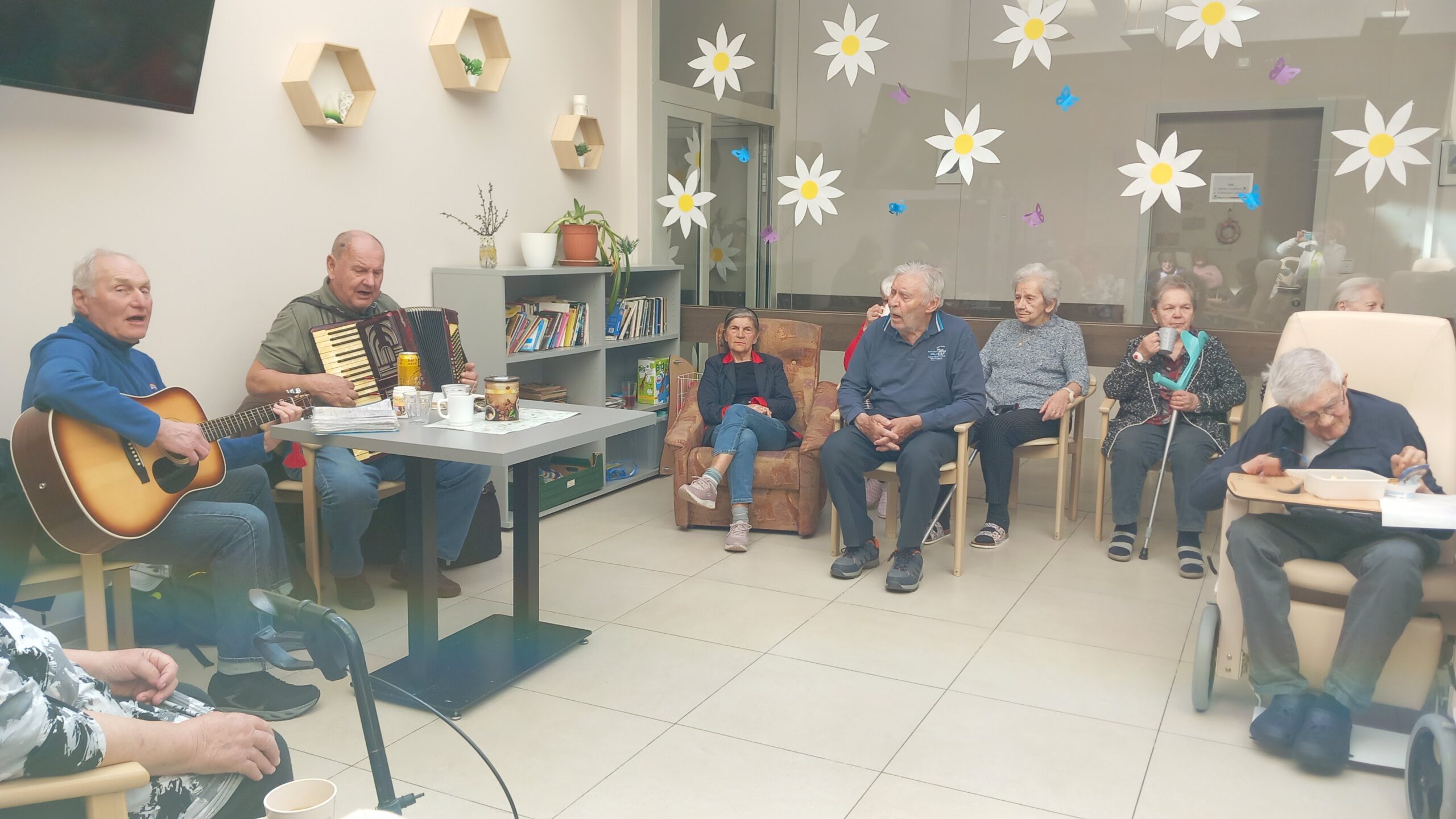 V našem zařízení zavládla atmosféra plná radosti, hudby a společných zážitků. Navštívili nás dva šikovní muzikanti s harmonikou a kytarou, kteří svým vystoupením potěšili všechny přítomné klienty.