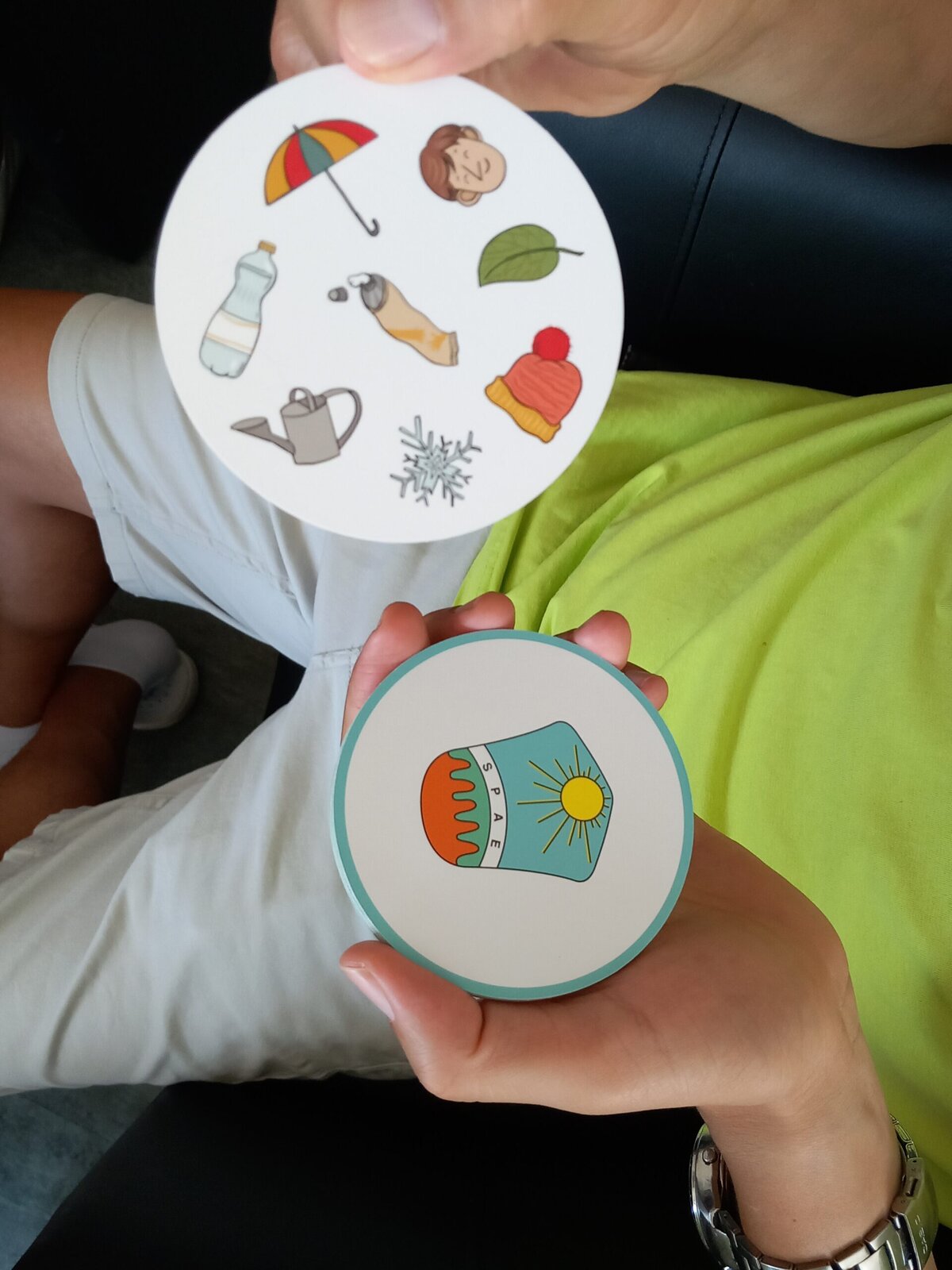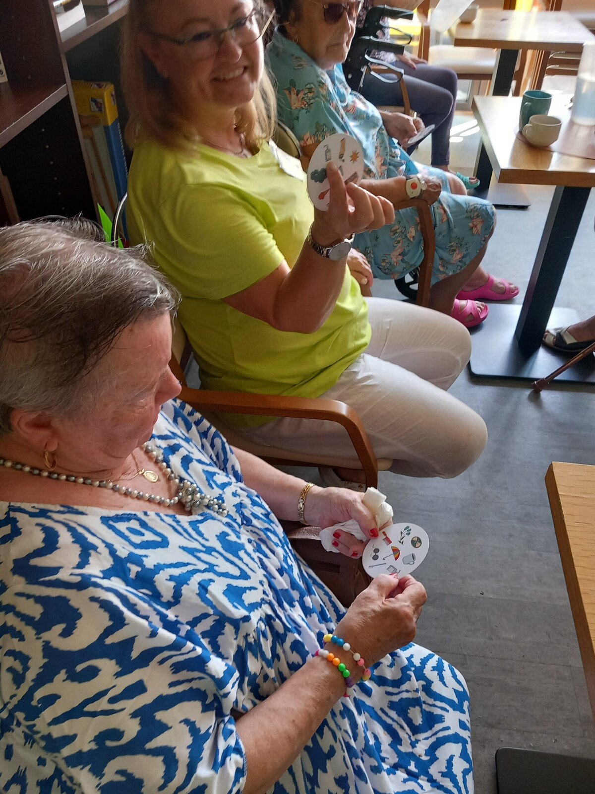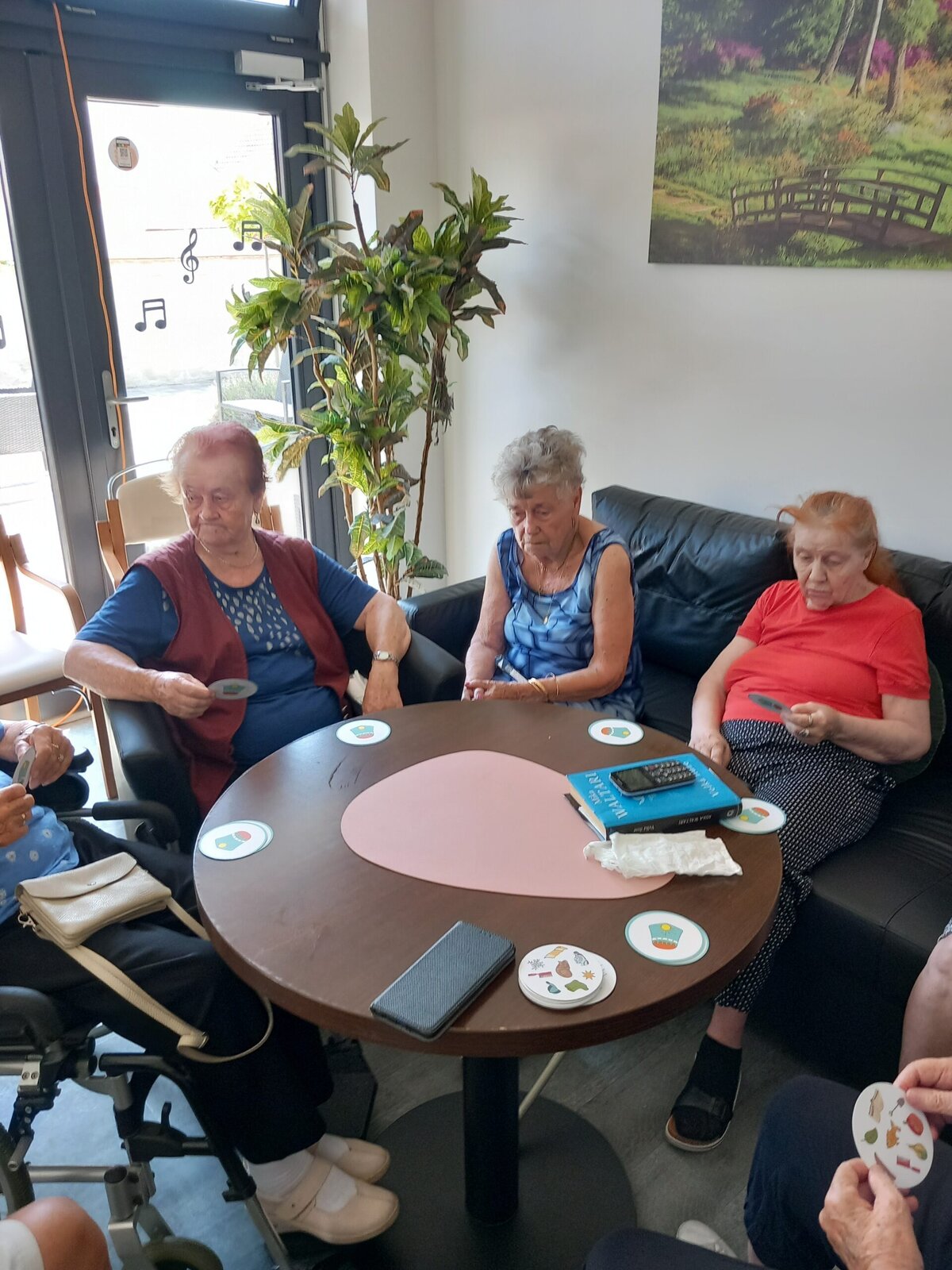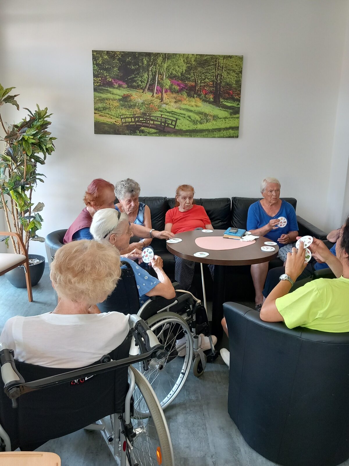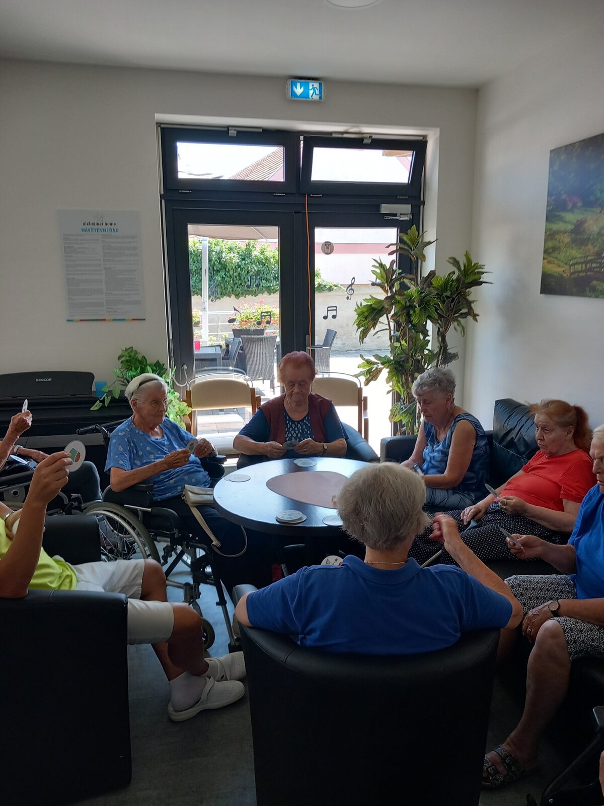 V Senevida Pitkovice jsme hráli karty, tzv. Postřeh. Hráči musí na své kartě a na kartě uprostřed najít stejný symbol, nahlas ho pojmenovat a poté kartu získávají. Vítězí ten, kdo jich má na konci nejvíce. U této hry procvičíme soustředěnost i pozornost. Klienti jsou soupeřiví a o to je hra zajímavější.