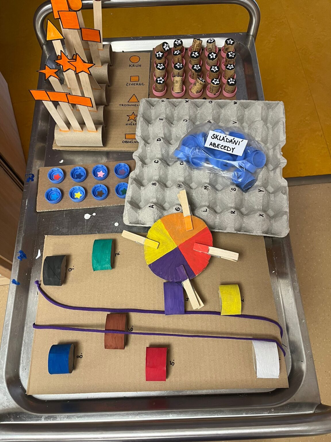 Kromě dřeva, látek a korálků využívá také plastová víčka, korky od vína, kartony od vajíček, tkaničky, kolíčky, ruličky od toaletního papíru a další materiály, které proměňuje v praktické pomůcky.