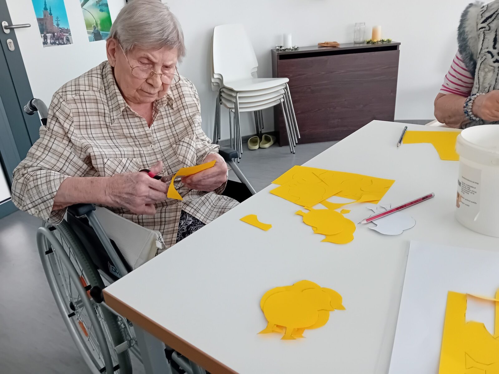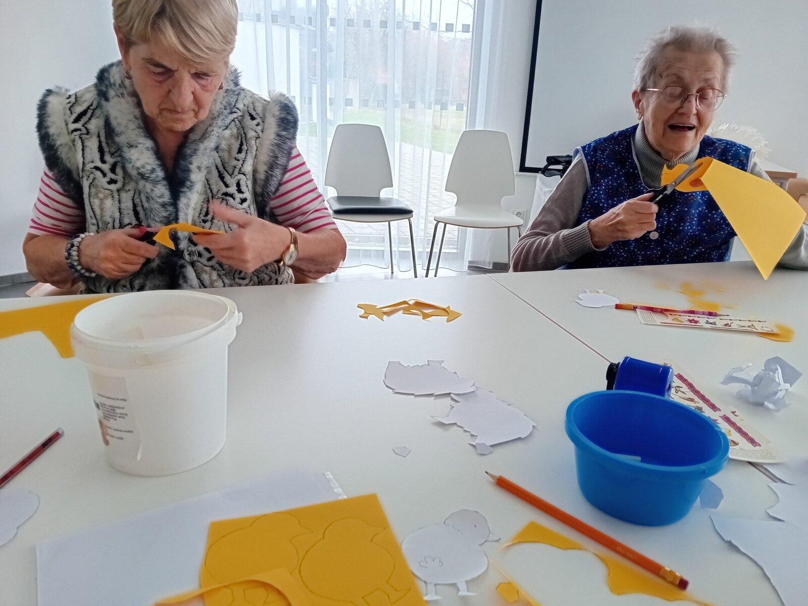 Jaro už nám klepe na dveře. Tak jsme si ho v Senevida SLAVKOV připomněli veselými kuřátky. U vyrábění jsme procvičili jemnou motoriku, obkreslování tvarů. Hlavně, ale představivost a kreativitu. Klientky zvolily každá jiné dotvoření kuřátka – někdo se snažil napodobit předlohu, někdo si tvořil podle vlastní fantazie. Kuřátka jsme se svolením klientek použili k ozdobení nástěnek v našem zařízení.