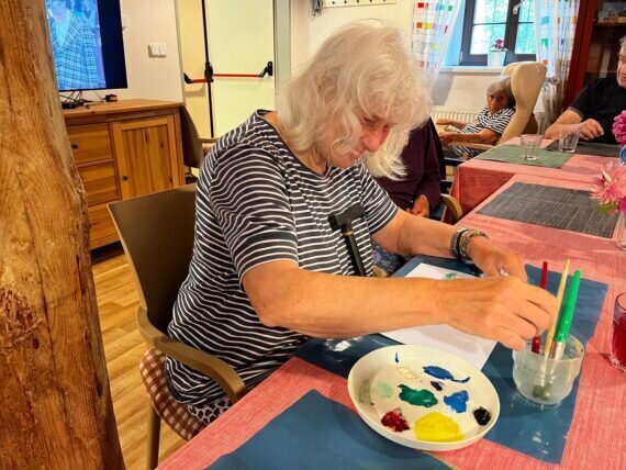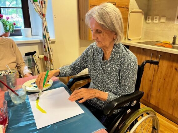 Když v Pyšelech zrovna slunce nesvítí, nevěšíme hlavu a vytvoříme si ho alespoň na papíře. Práce s barvami a štětci klienty v Senevida Pyšely velmi baví.
