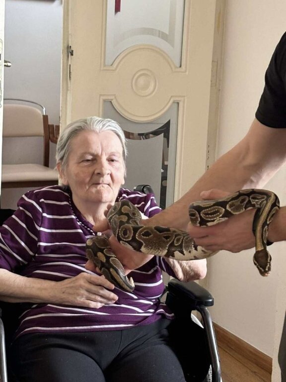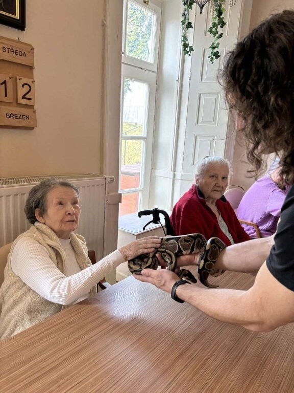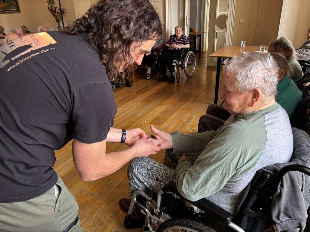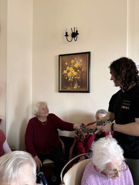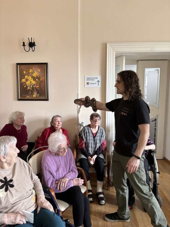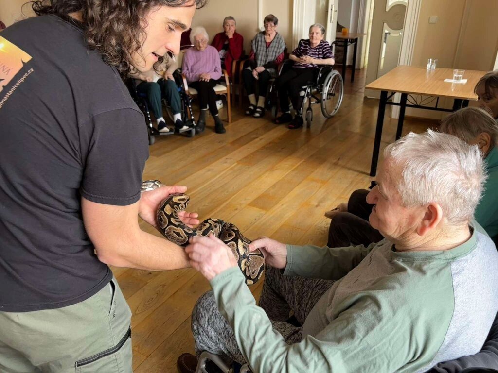 Ukázat se nám přijel třeba ježek Honzík, netopýr rezavý Hugo, potkan Dášenka, poštolka Mája, sova pálená Scotty, švábi Fanda a Vanda, a nakonec jsme žasli nad krajtou královskou Jonášem.