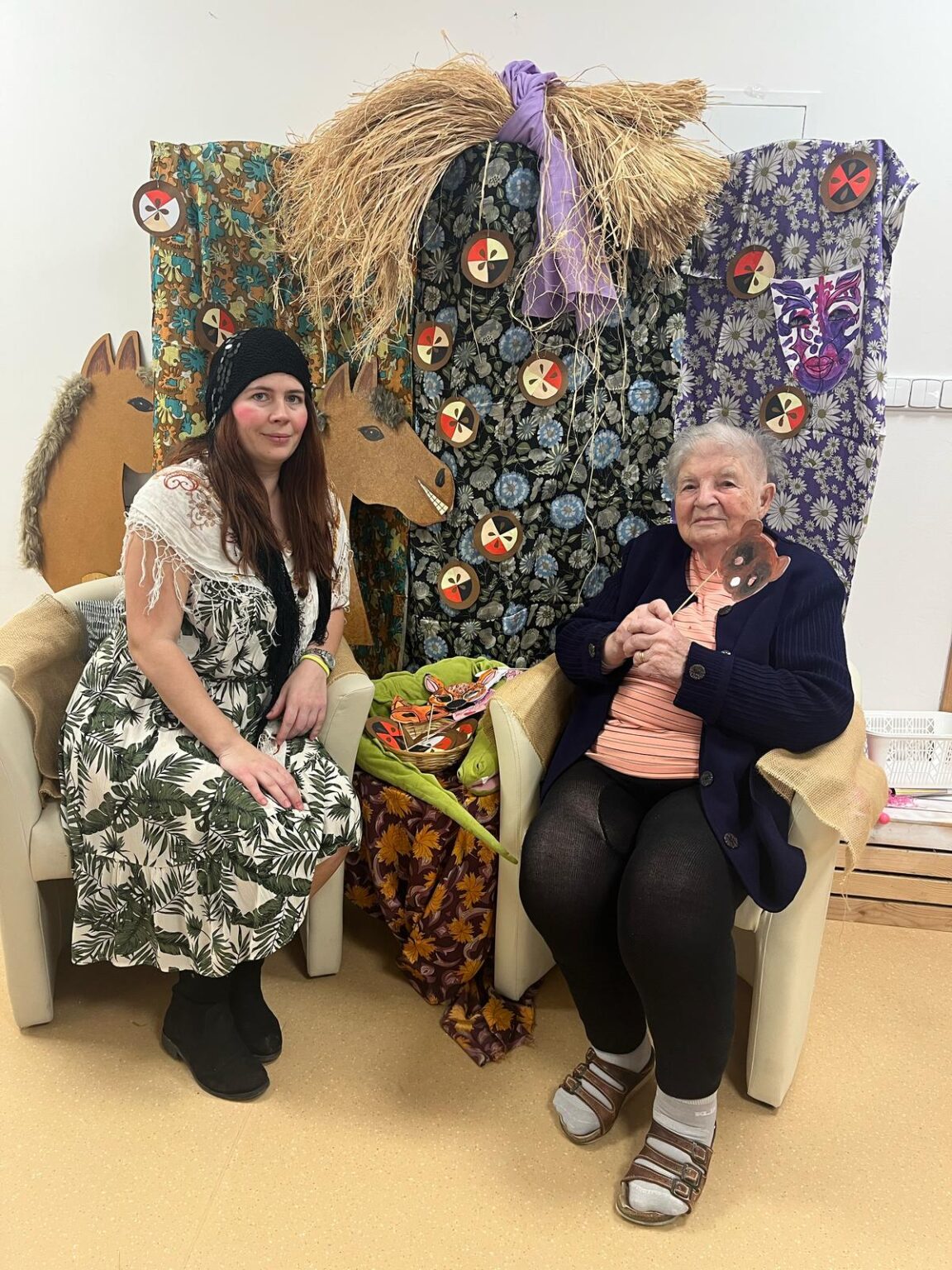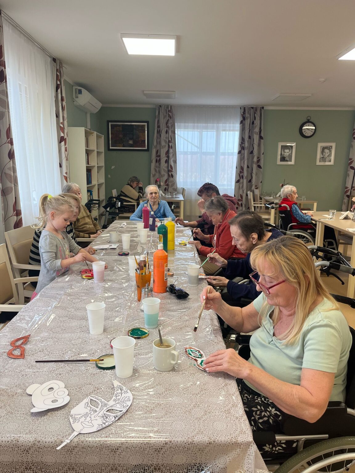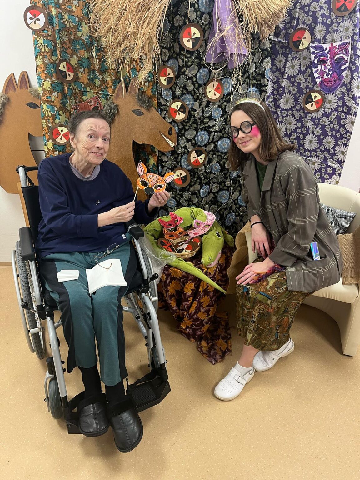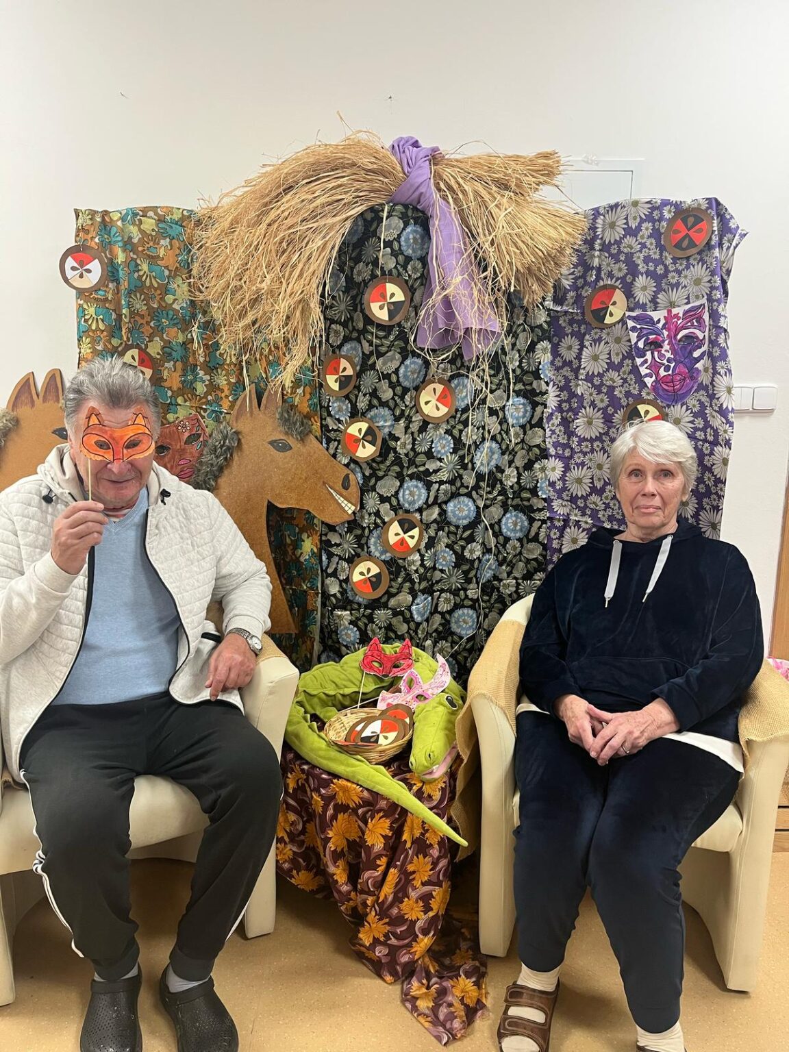 Ve tvořivých aktivitách jsme se pustili do výroby škrabošek a dekorací do fotokoutku, který jsme poté využili při vyvrcholení celého týdne – masopustní narozeninové oslavě. Ta byla opravdu velkolepá! Atmosféru nám zpříjemnil náš oblíbený pan harmonikář, jehož písně vždy rozveselí nejednoho z nás. Nechybělo ani překvapení v podobě masopustního průvodu zaměstnanců, kteří se proměnili v pestré masky a přinesli tak ještě více radosti.