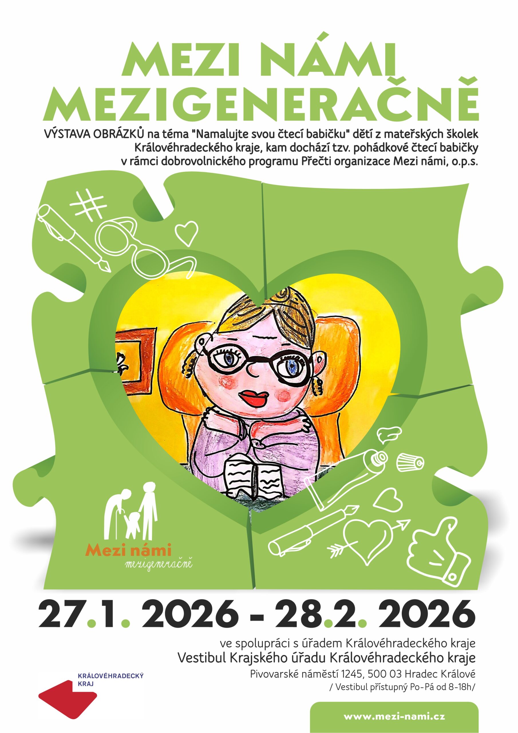 Od 27. 1. 2026 do 28. 2. 2026 probíhá ve vestibulu krajského úřadu Královehradeckého kraje výstava obrazů na téma: Namalujte svou čtecí babičku.