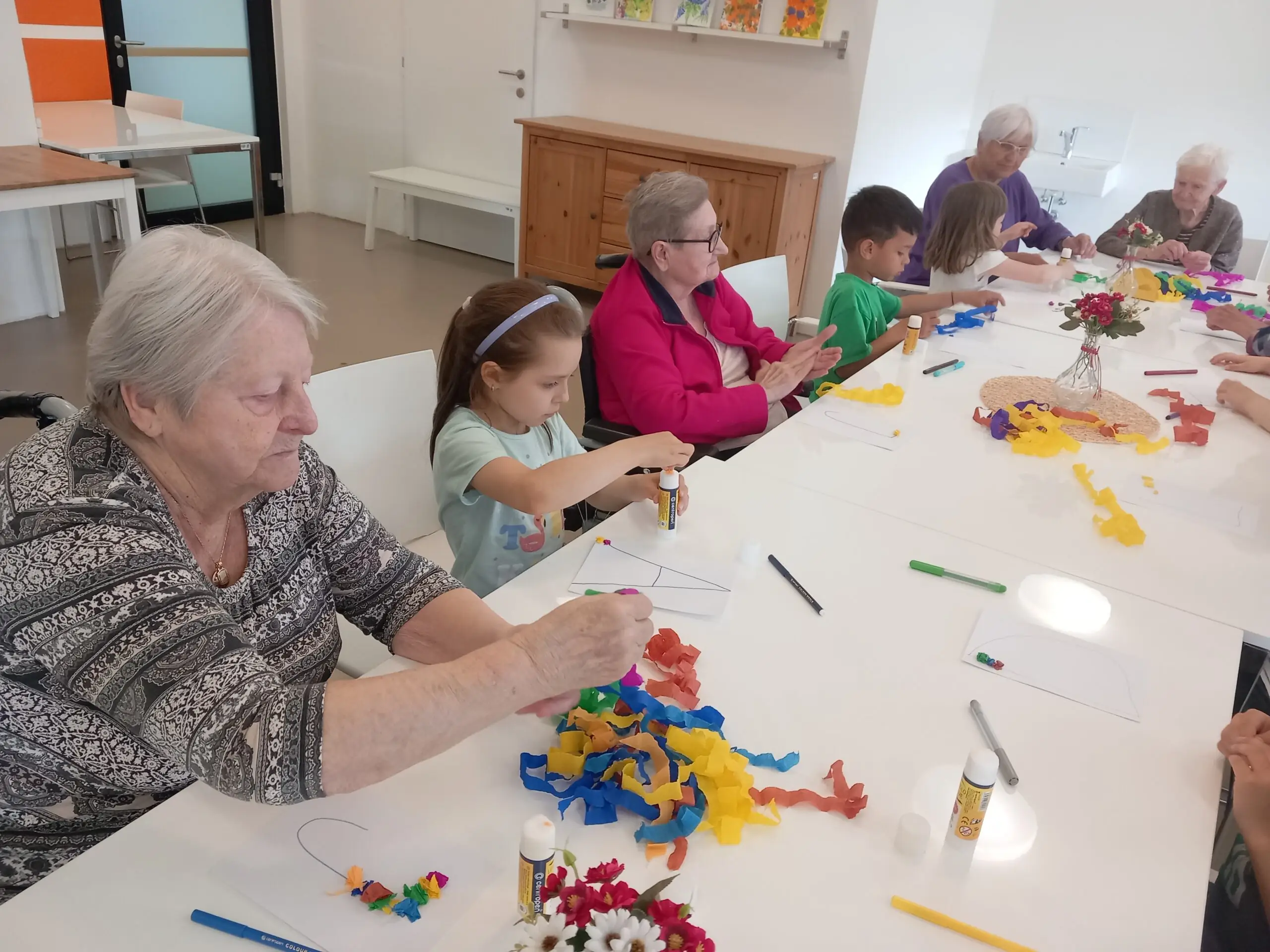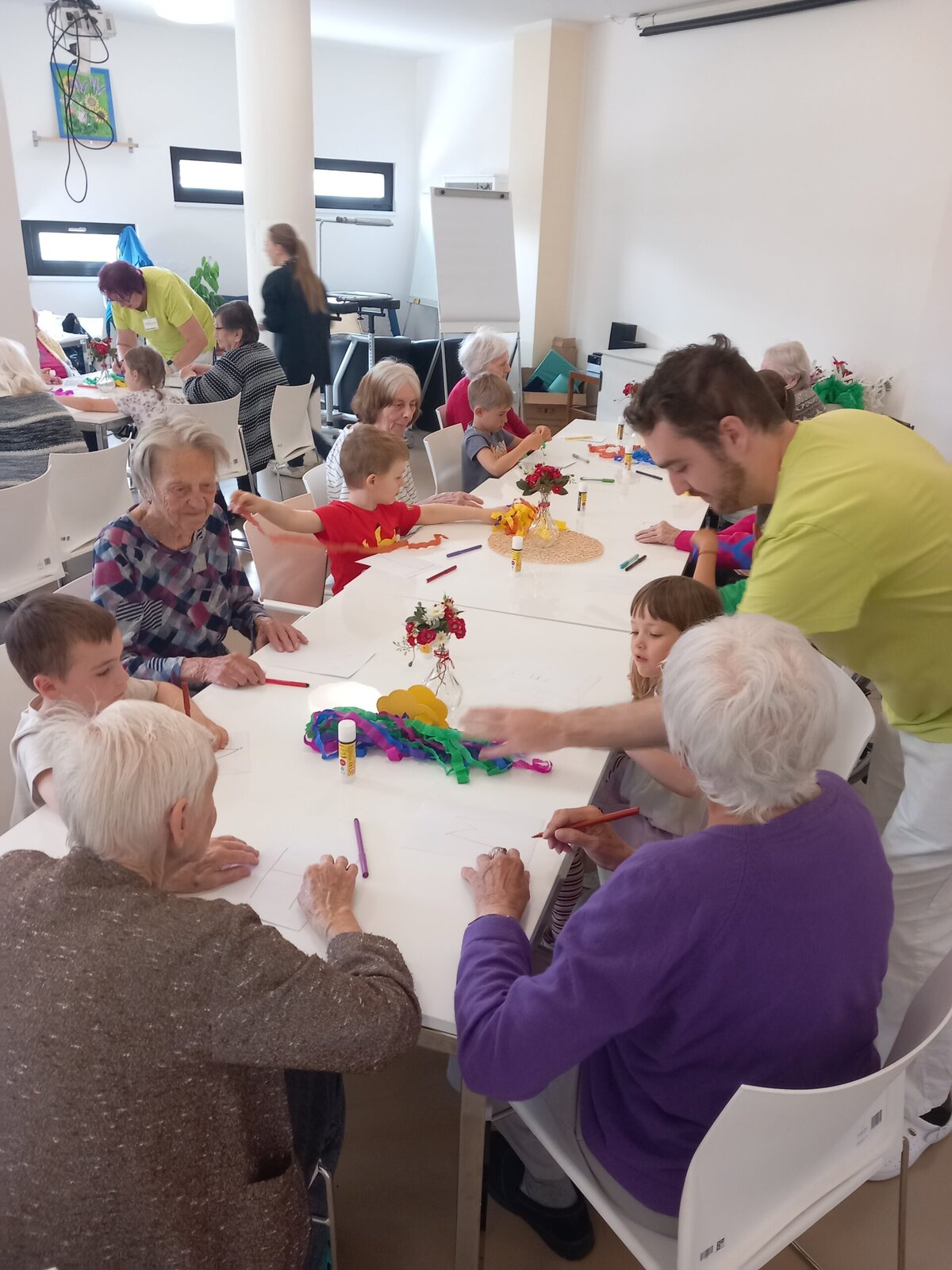 Spolupráce s organizací Mezi námi, o.p.s. je pro naše klienty z Senevida Zátiší vždy příjemným zpestřením. Tentokrát nás navštívily děti z mateřské školy, které si připravily hudební vystoupení plné veselých písniček. Po kulturním programu následovalo kreativní tvoření. Společně jsme vyráběli barevná písmena z krepového papíru, což přineslo radost nejen dětem, ale i klientům. Takové mezigenerační setkání podporuje vzájemné porozumění a propojení dvou světů.