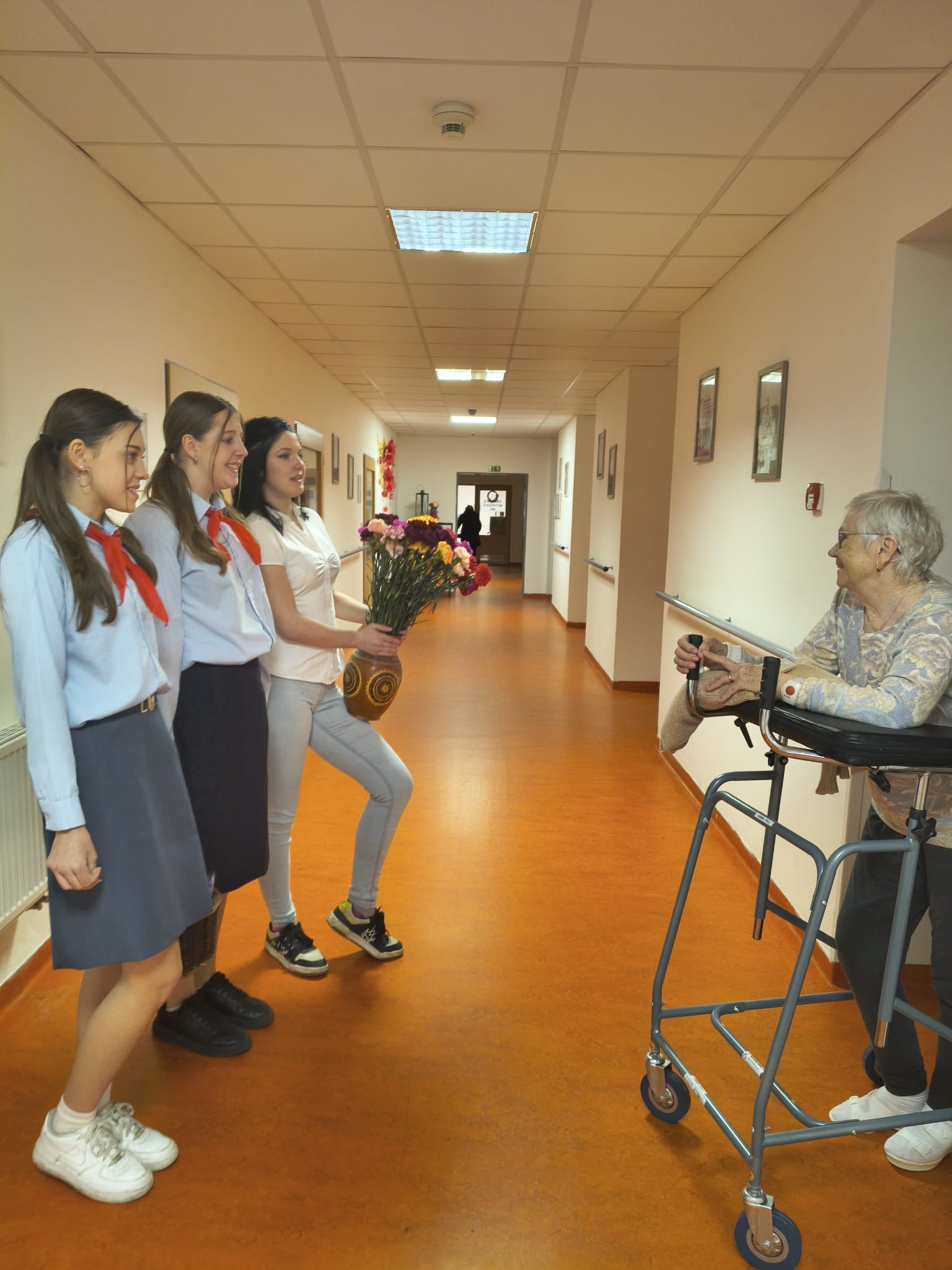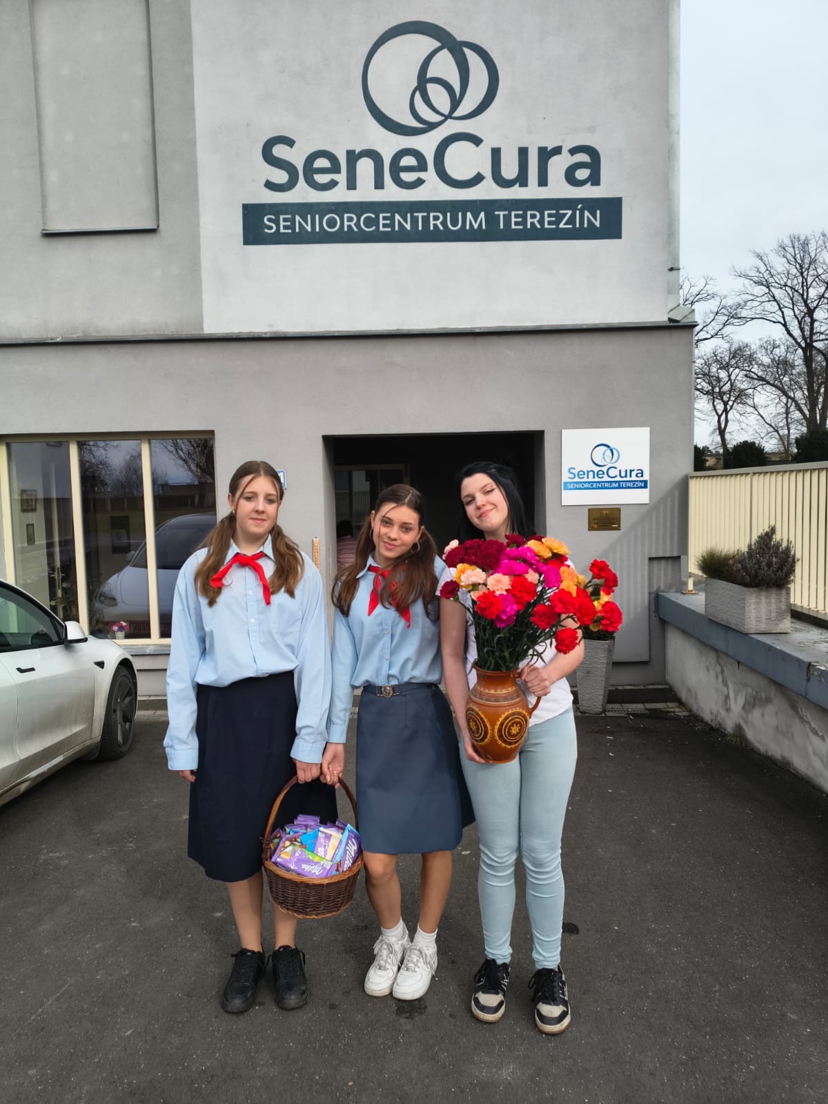O dva dny později, v neděli 8. března, pak naše klienty potěšila také trojice děvčat, která oblečená ve stylu někdejších pionýrů mnohým klientům připomněla jejich mládí a vyvolala milé vzpomínky na dobu, kdy se tento svátek slavil velmi slavnostně.