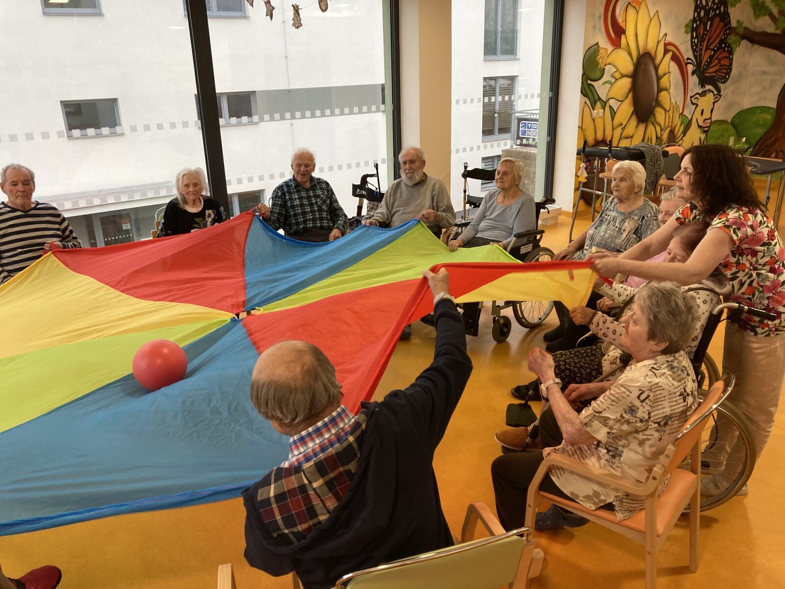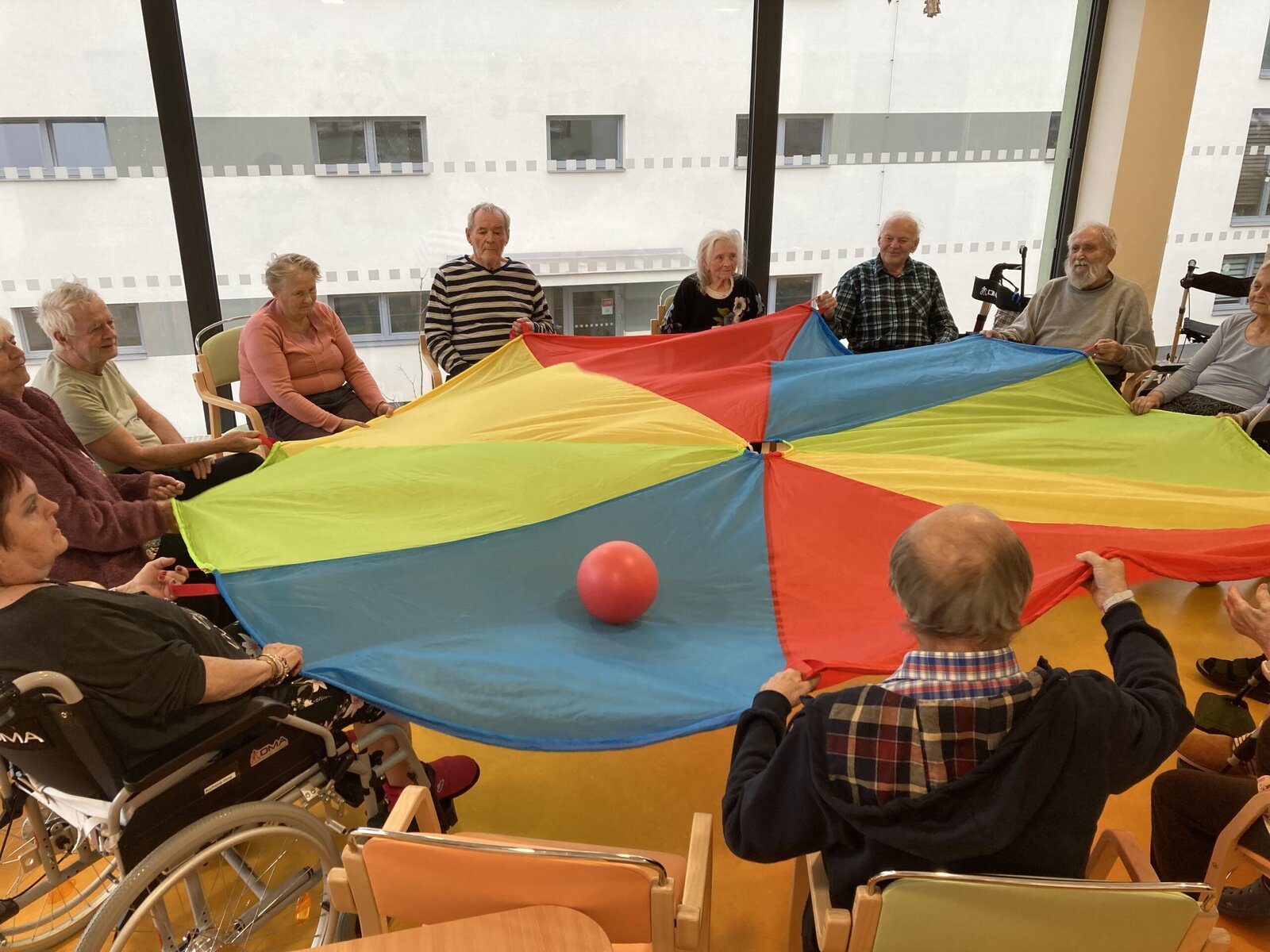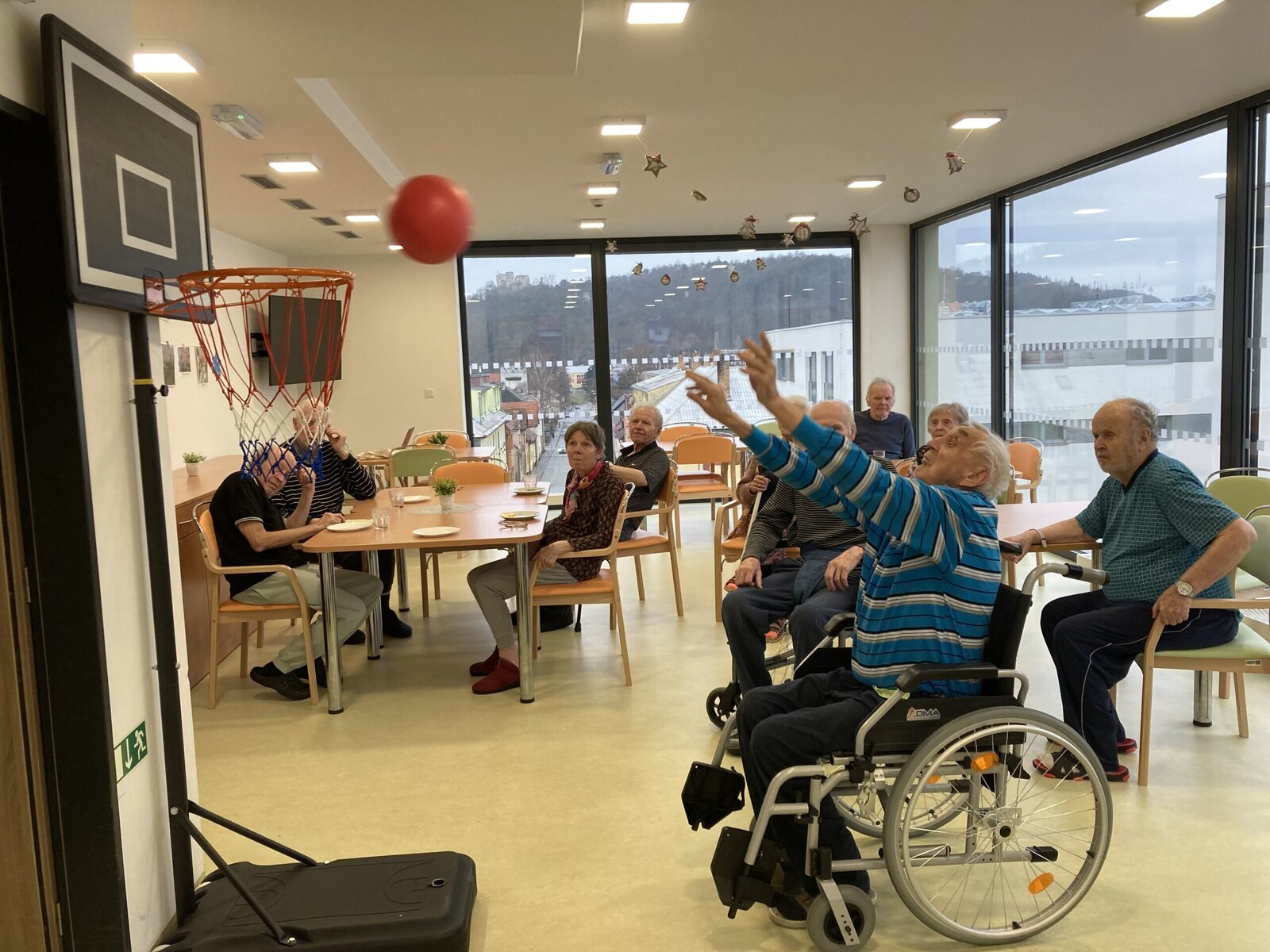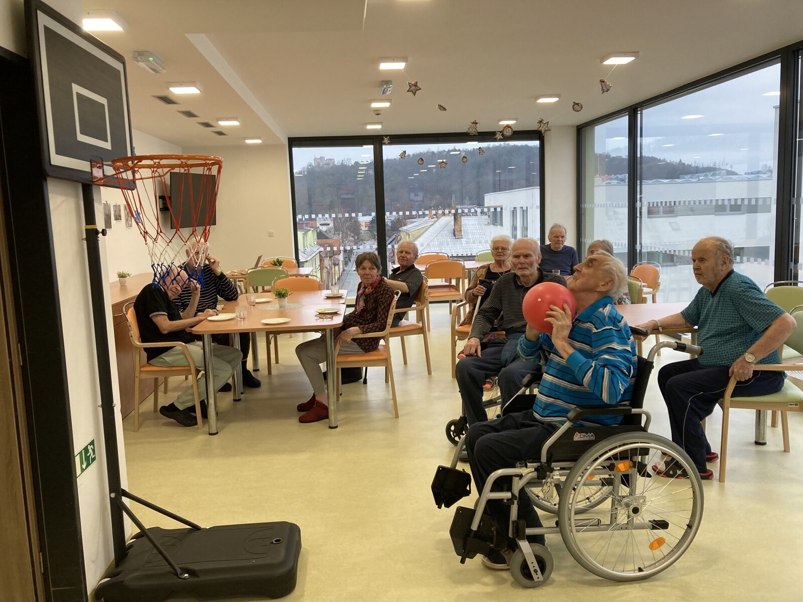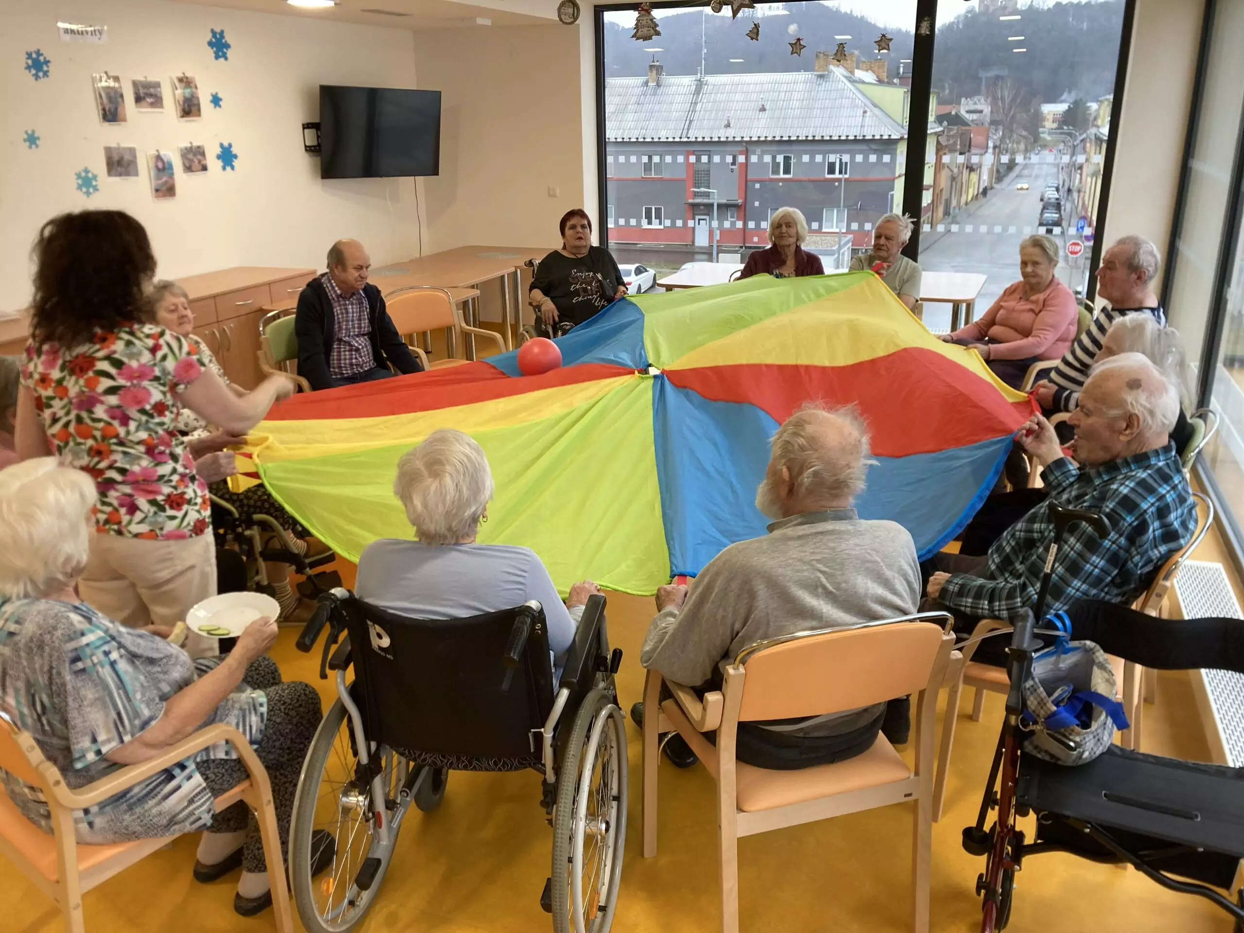 Každý pátek hrají naši klienti různé míčové hry! Dnes jsme si vyzkoušeli nový basketbalový koš, který klienti dostali díky projektu Ježíškova vnoučata. A druhá skupina klientů procvičovala psychomotoriku pomocí barevného padáku. Tyto sportovní aktivity jsou u klientů velmi oblíbené hlavně v zimních měsících, kdy nemají možnost trávit čas na naší zahradě.