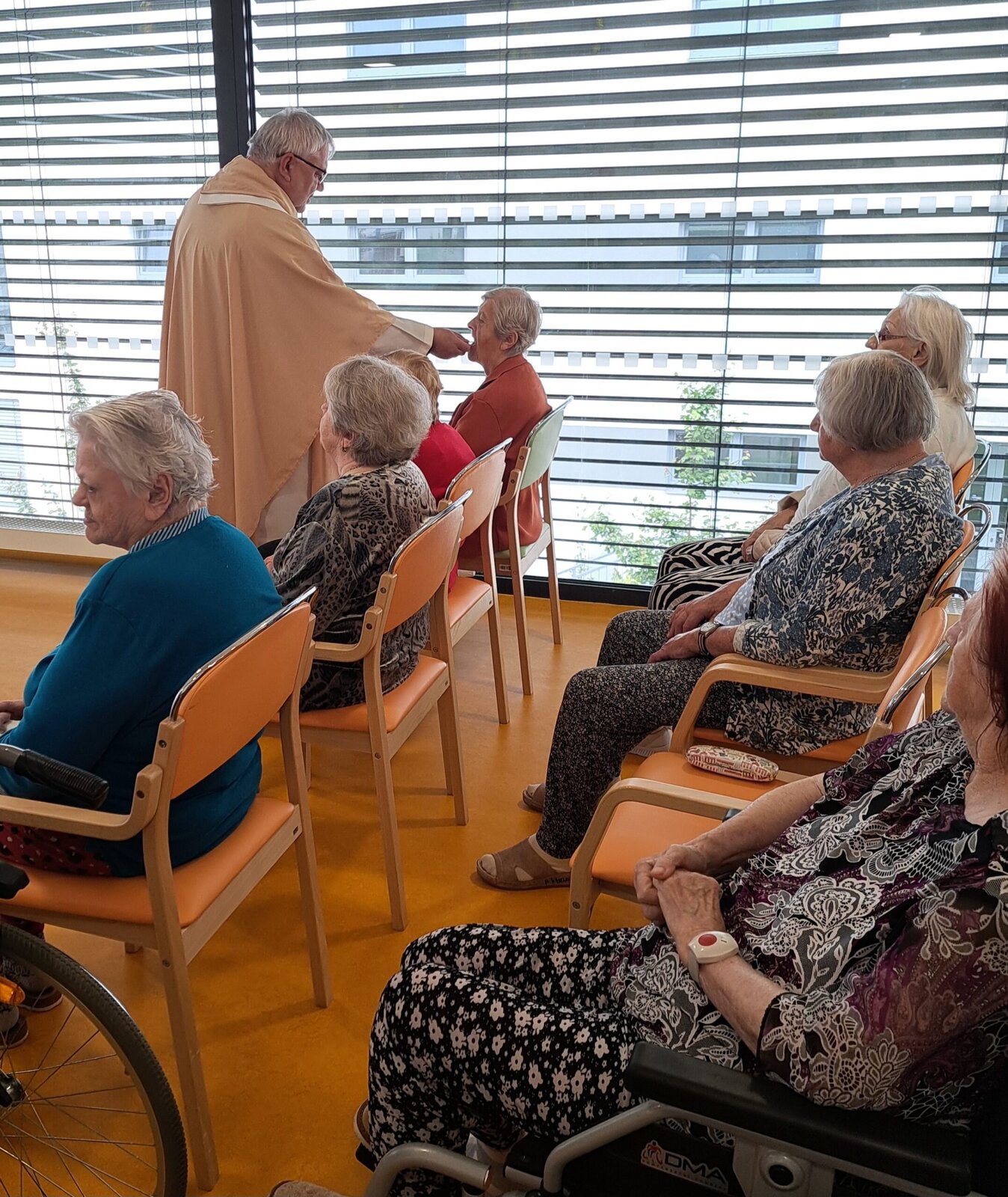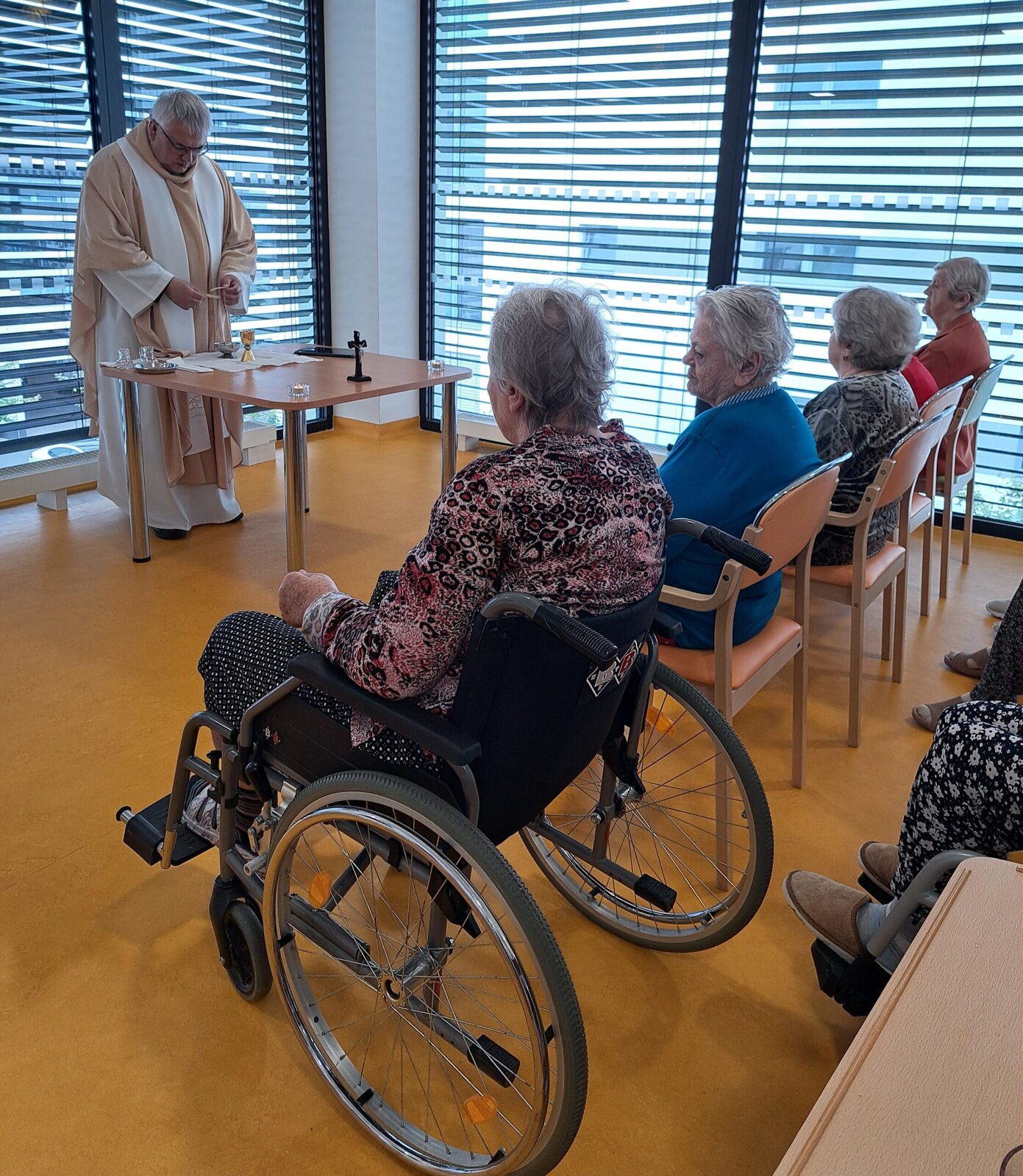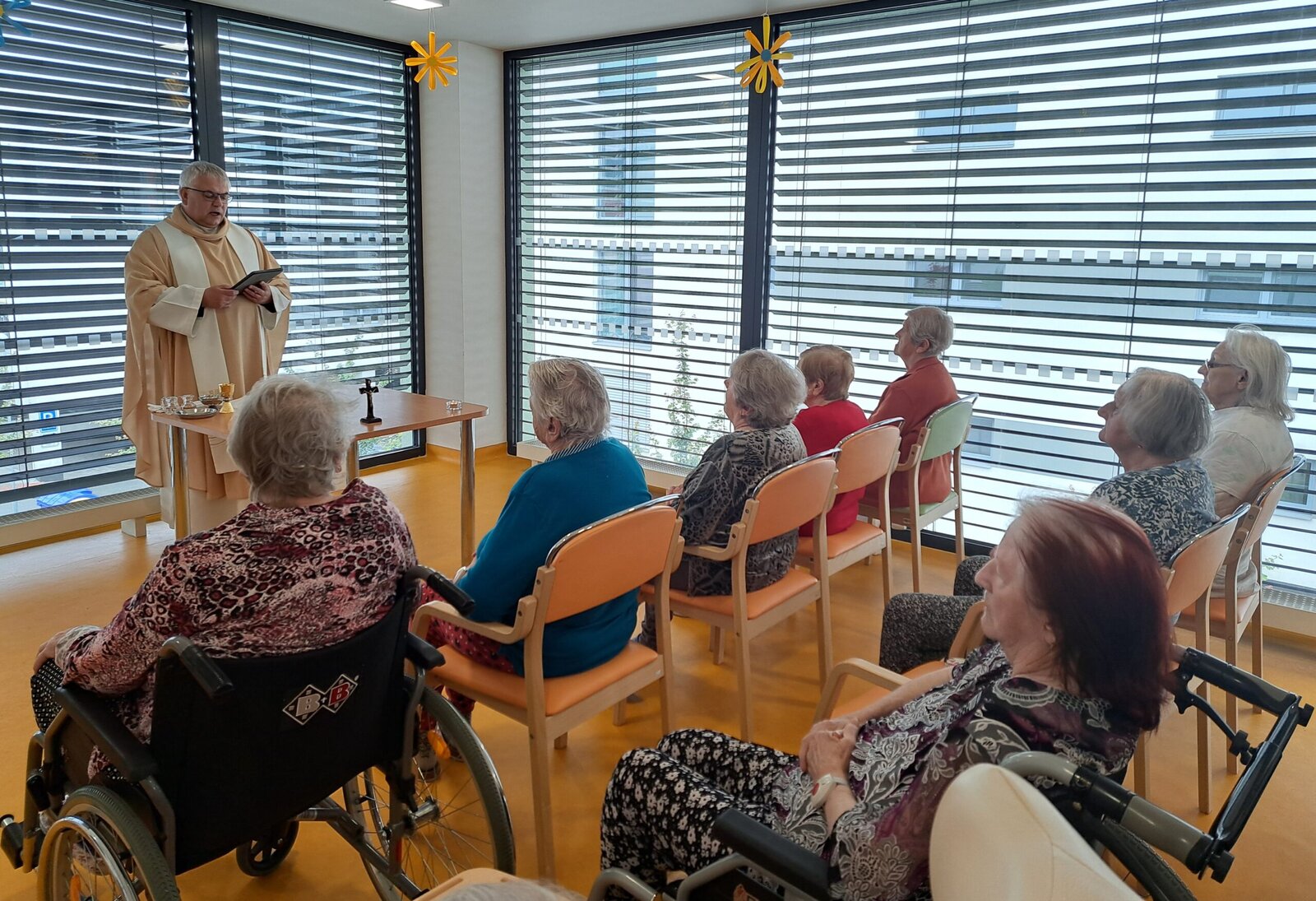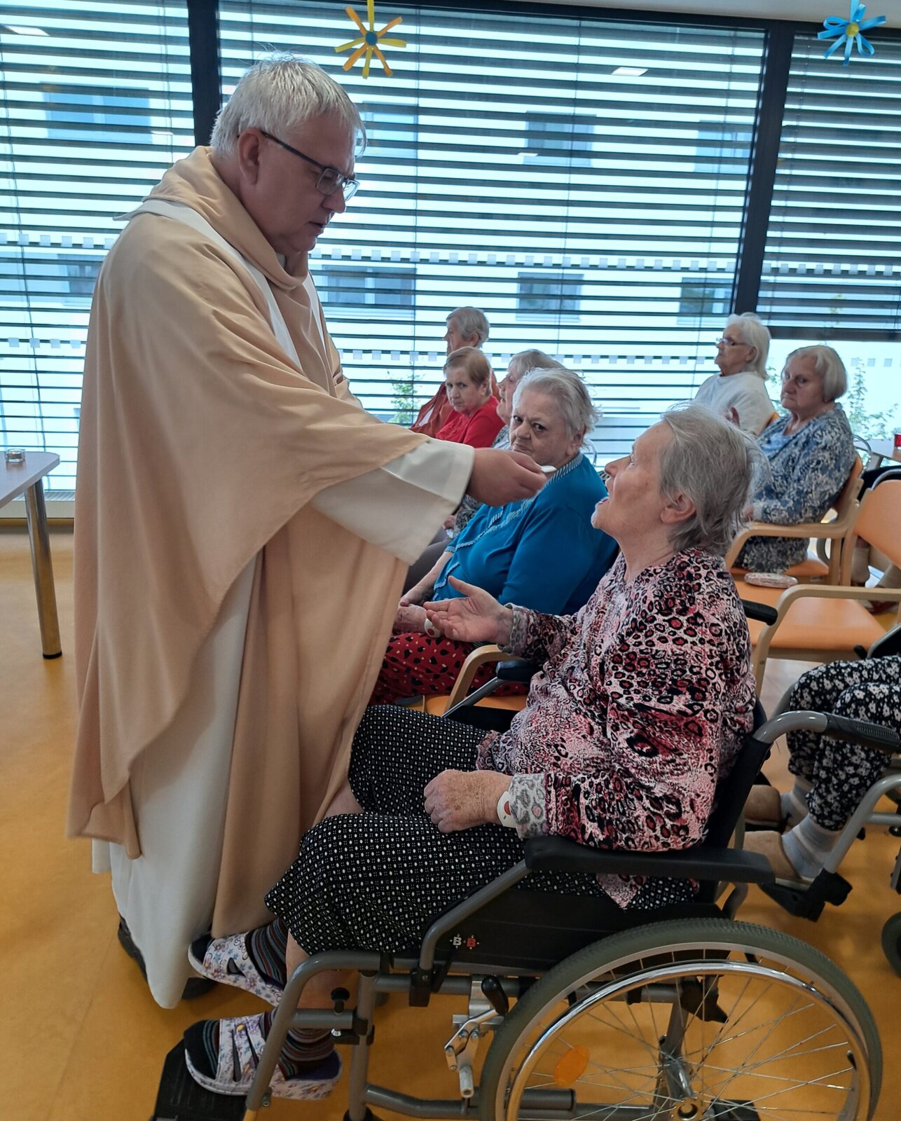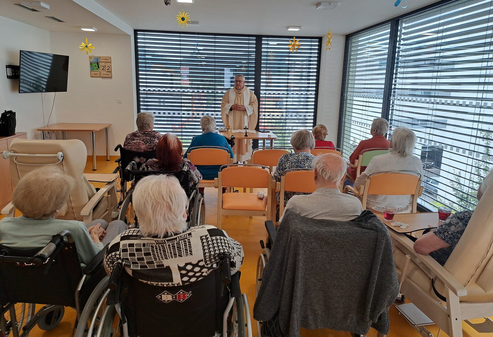 Náš domov Senevida Boskovice opět navštívil pan farář, který pro naše klienty sloužil mši svatou. Tato duchovní událost byla pro mnohé z nich hlubokým a radostným zážitkem. Pán farář také individuálně navštívil některé klienty přímo na jejich pokojích, aby jim poskytl duchovní posilu a slovo útěchy. Velmi si vážíme jeho laskavého přístupu a času, který nám věnoval. 😊