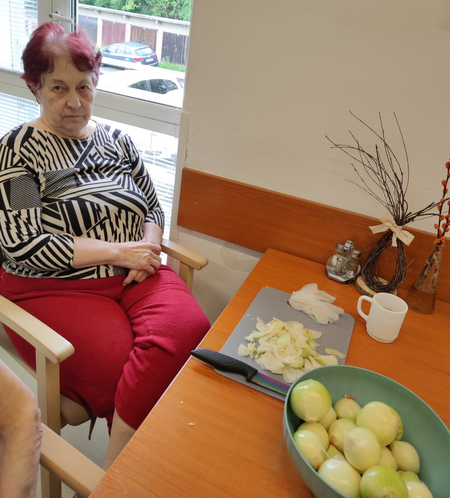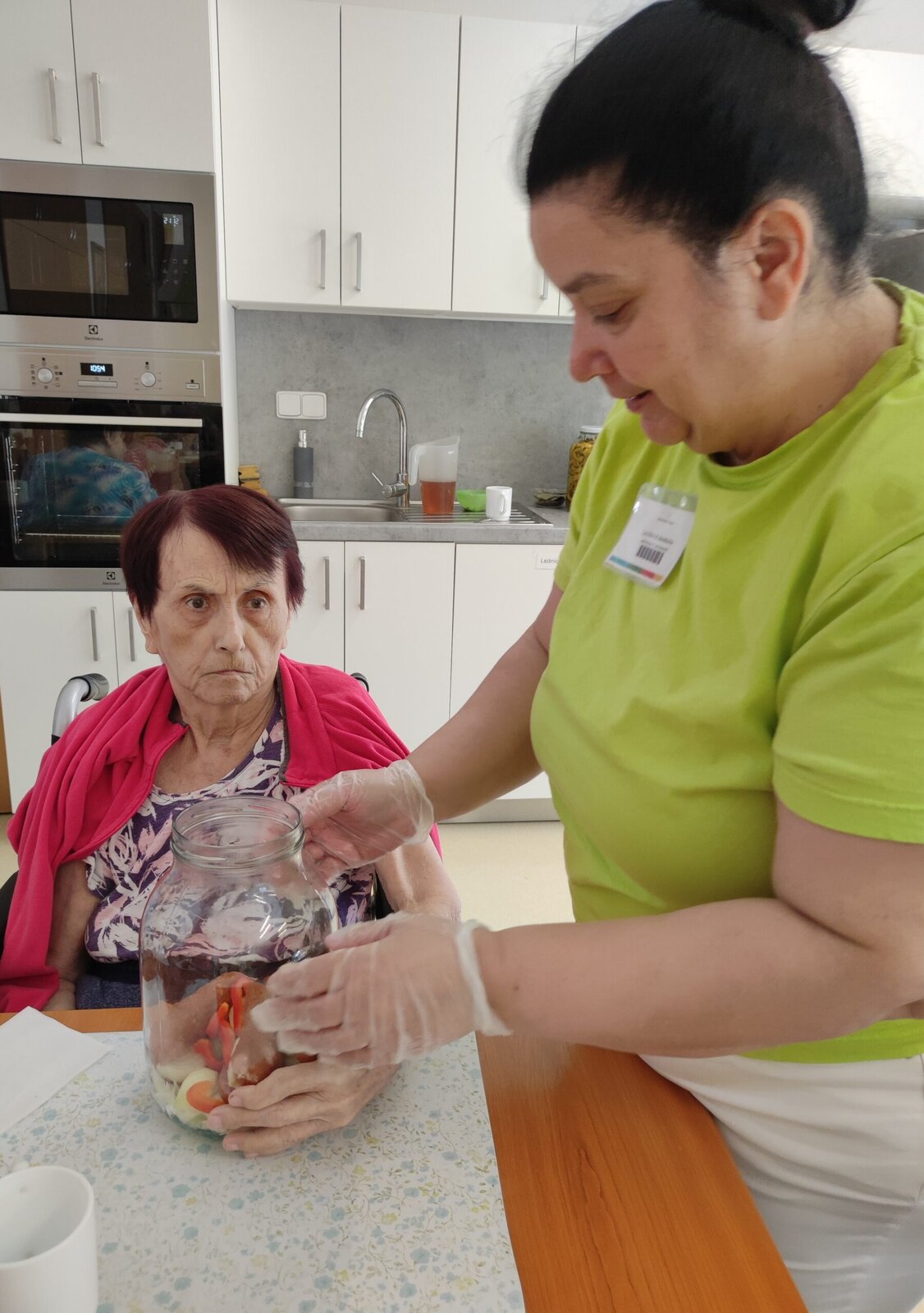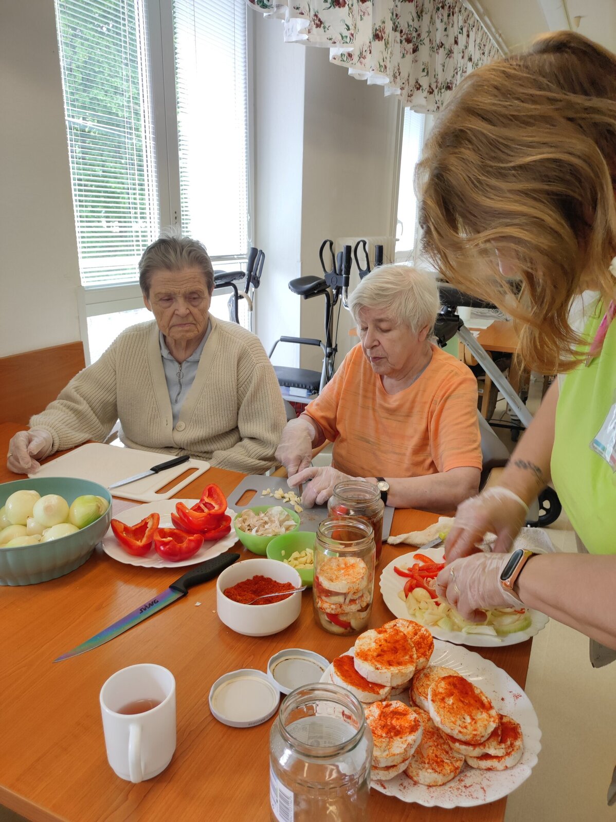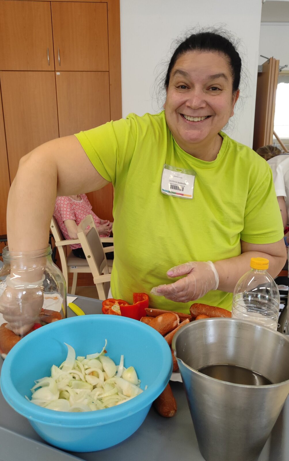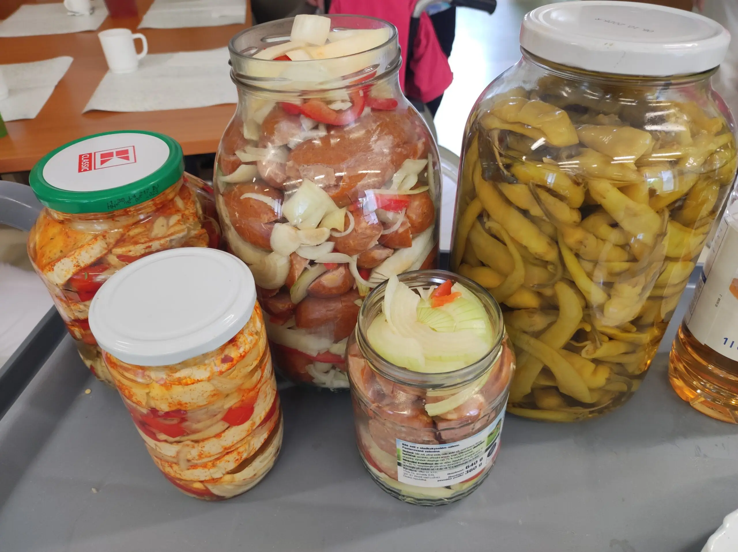 S našimi klienty jsme připravili výbornou pochoutku - utopence a nakládaný hermelín. Nejprve jsme si připravili suroviny - cibuli, papriku, feferonky a koření. Každý si našel svoji roli. Někdo krájel, jiný skládal do sklenic nebo pomáhal s přípravou nálevu.