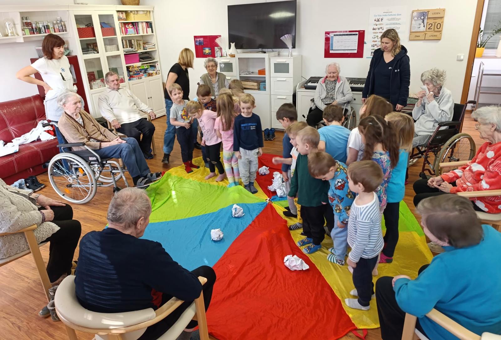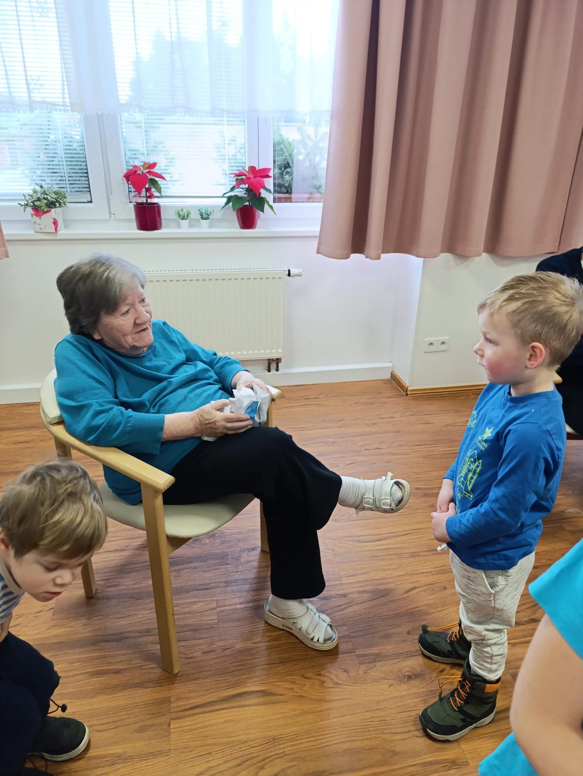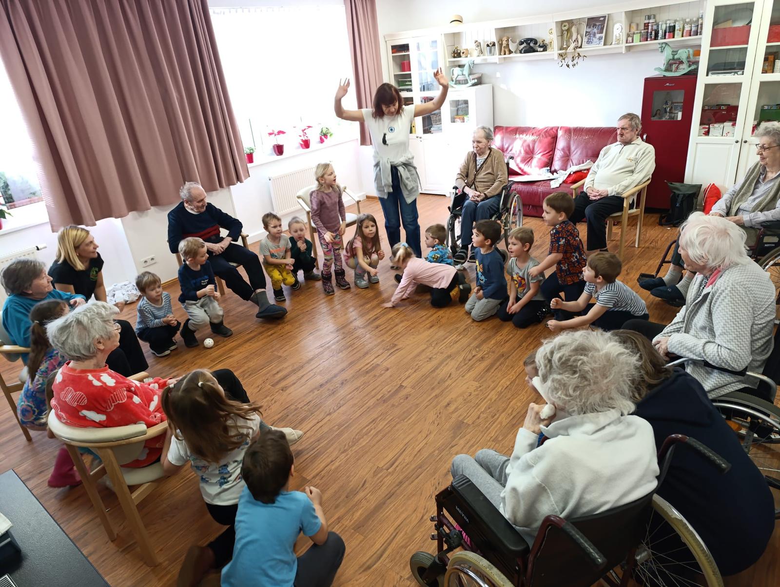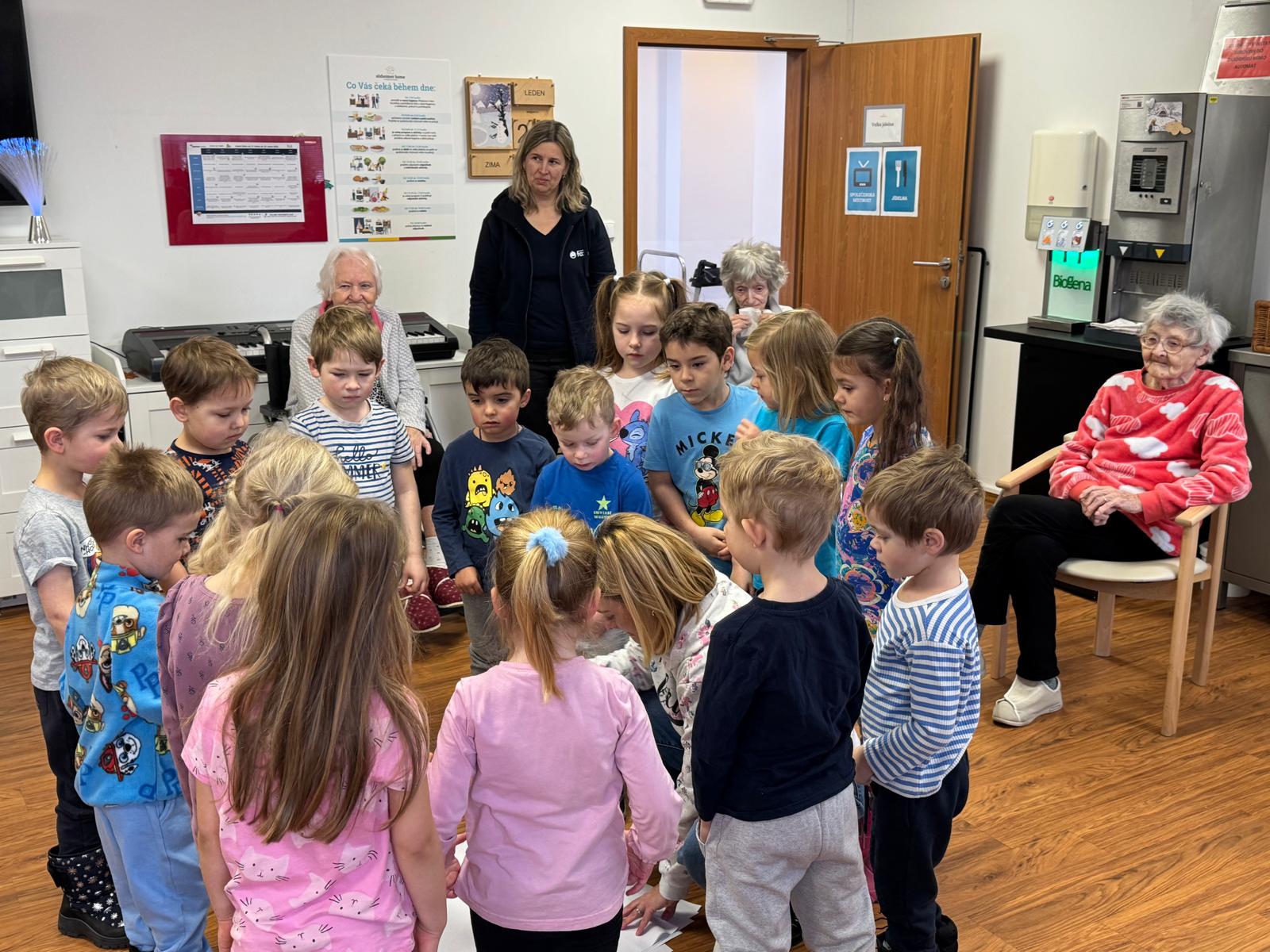 V našem domově tento týden proběhlo mezigenerační setkání s dětmi z M.Š. Fazole - Montessori. Setkání se neslo v příjemné a přátelské atmosféře. Děti se s klienty zapojily do společného povídání, her a jednoduchých aktivit, které podporovaly vzájemnou komunikaci, radost a sdílení zkušeností. Klienti reagovali velmi pozitivně, setkání jim přineslo radost, oživení vzpomínek a pocit sounáležitosti. Akce splnila svůj účel - propojit generace a vytvořit prostor pro smysluplné setkání.