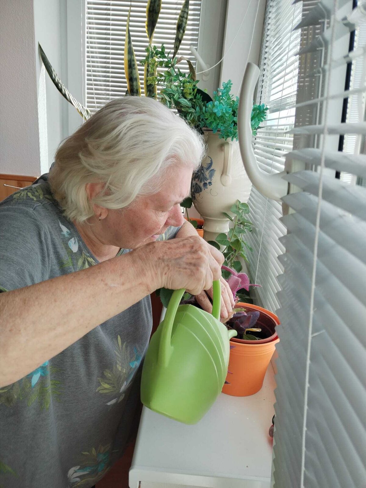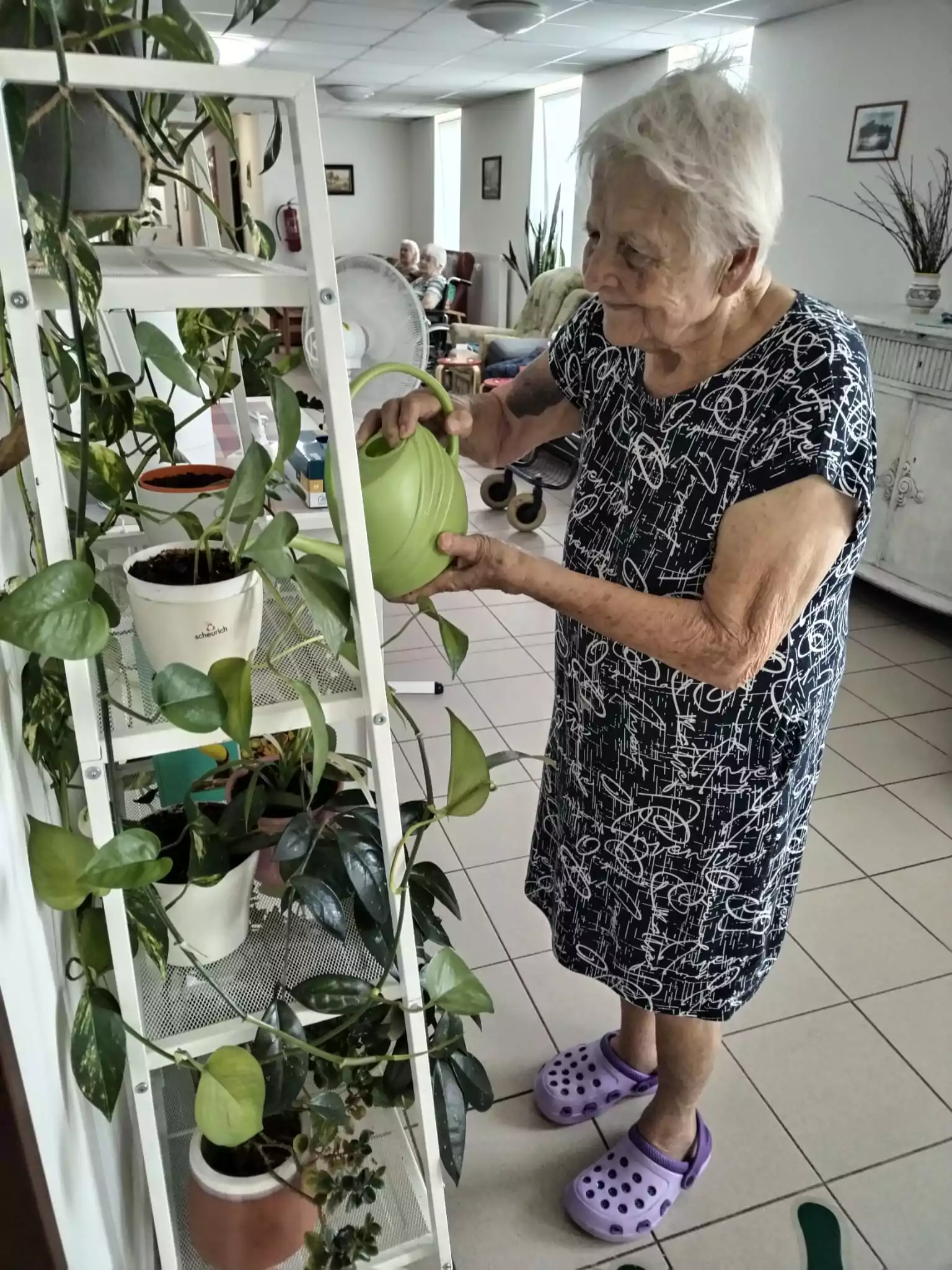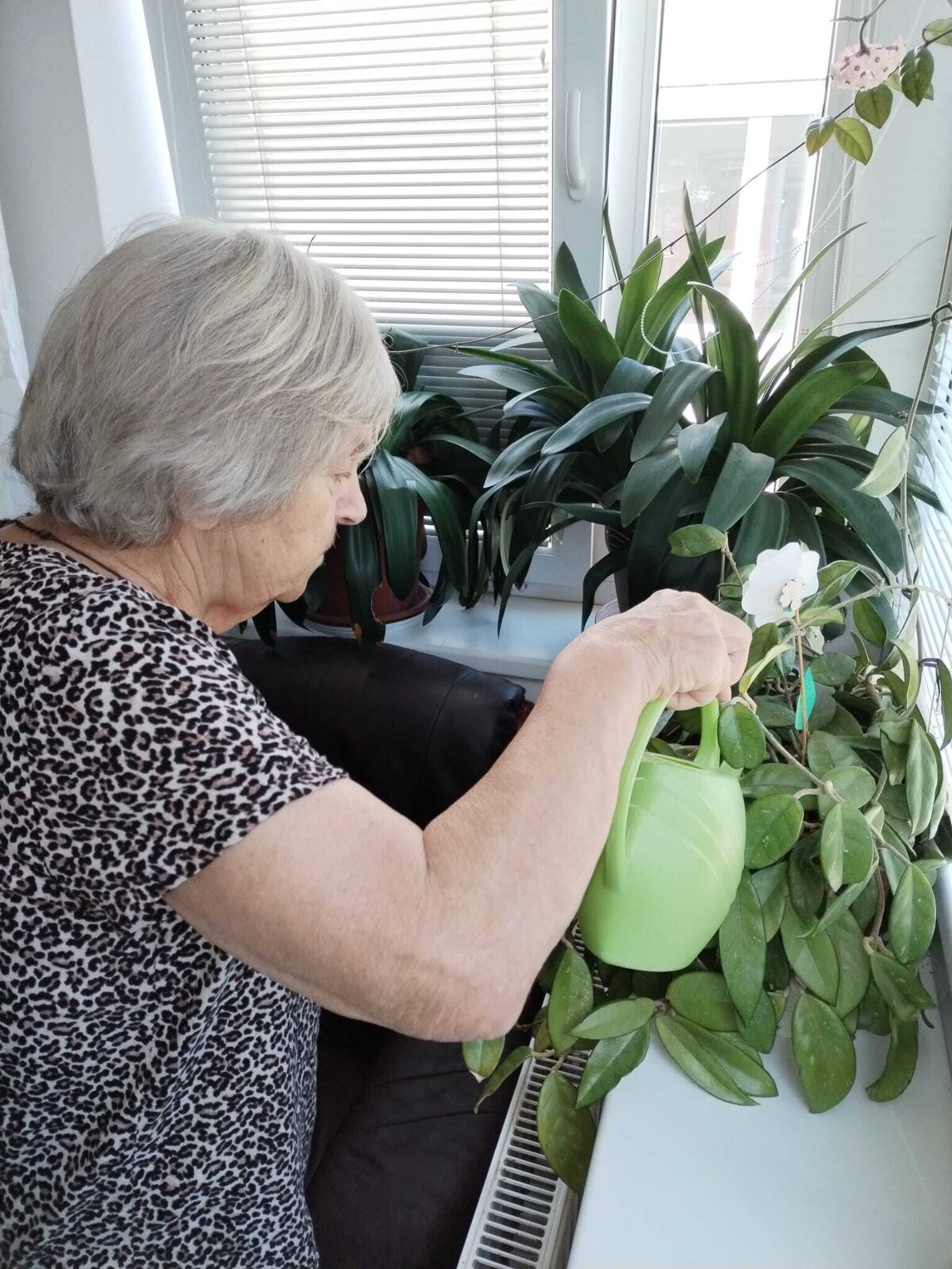 Určitě jste si všimli, že se to u nás v Domově zelení jen hýří. Aby byla stále zdravá a lahodila oku, je potřeba o ni pečovat. Úplně nejlépe s láskou. Proto pravidelně zaléváme květiny nejen uvnitř, ale také venku.
