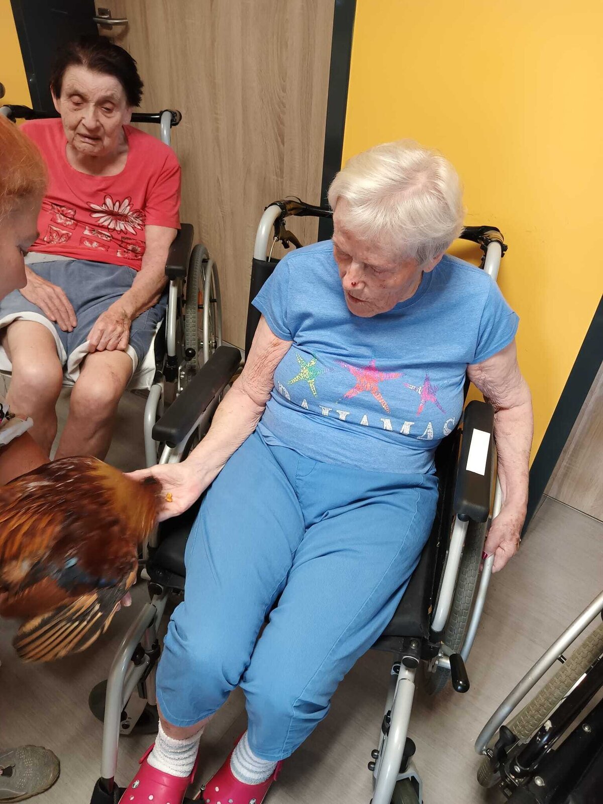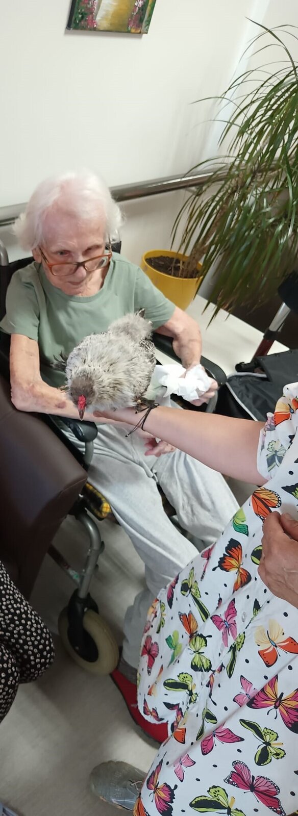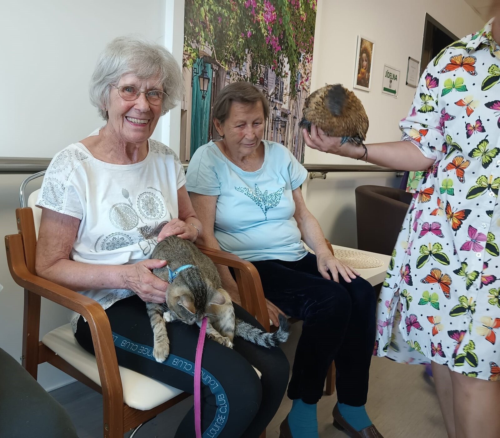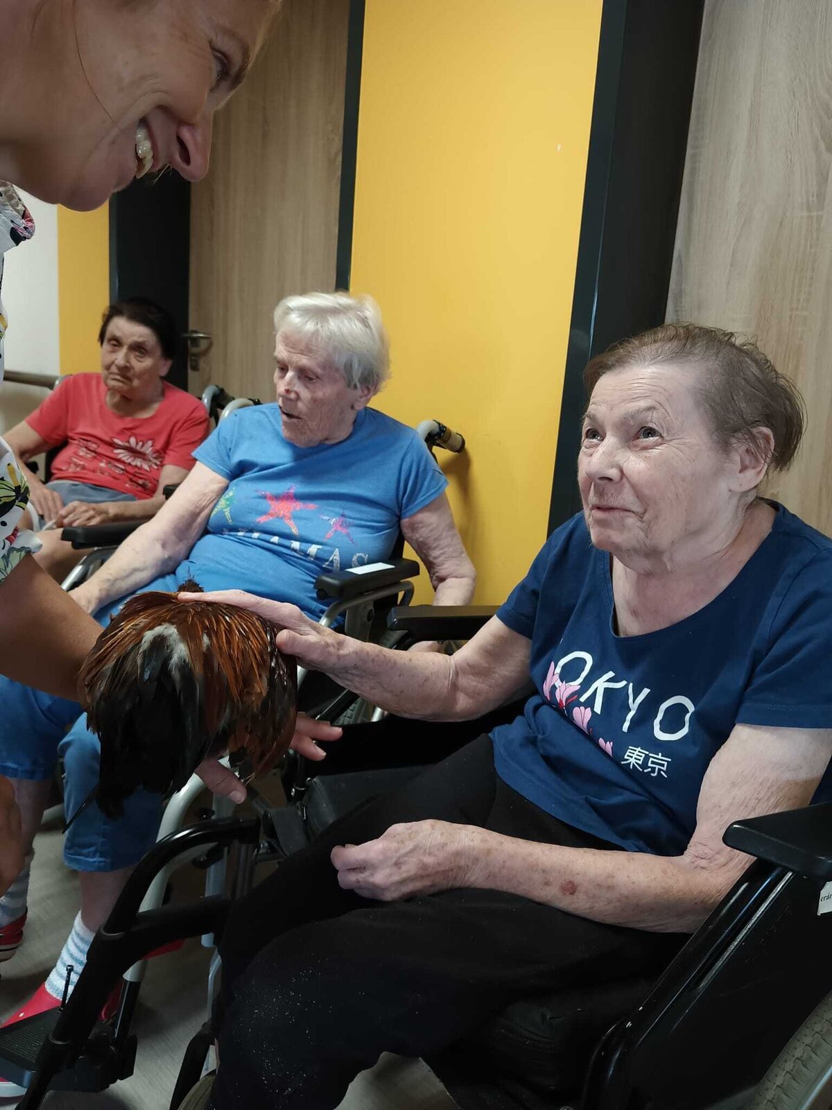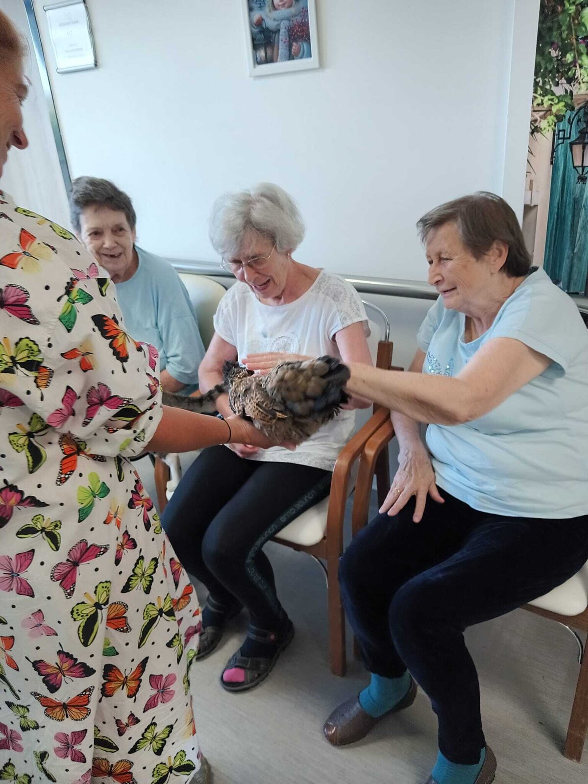 Ve čtvrtek odpoledne nás znovu navštívila zvířata z Boušic s majitelkou Evou. Kvůli vysokým teplotám jsme raději zvolili návštěvu klientů na pokojích. Náš zvířecí tým se skládal ze psů, slepic, kohouta, kocoura a králíka. O zábavu bylo opět postaráno. 😀🩵
