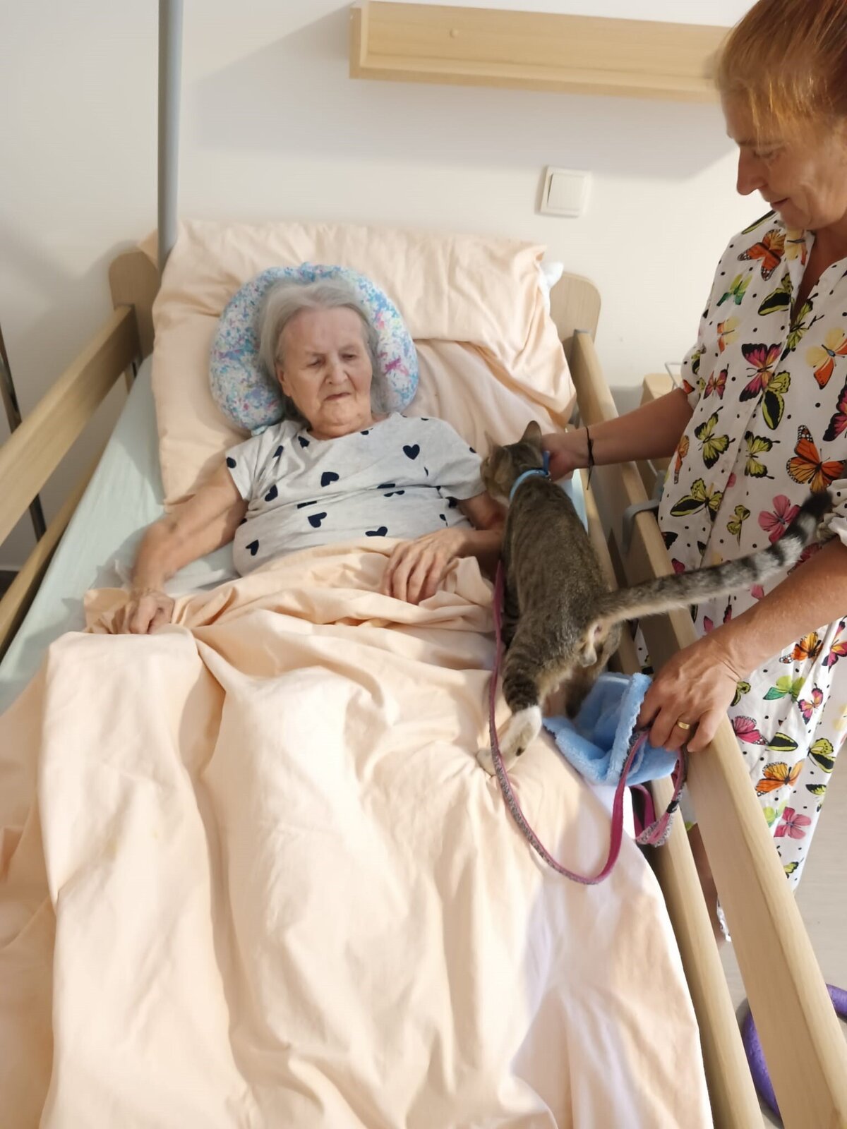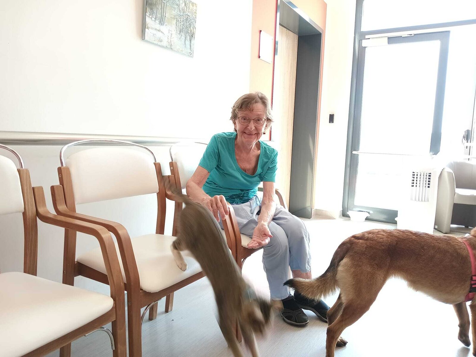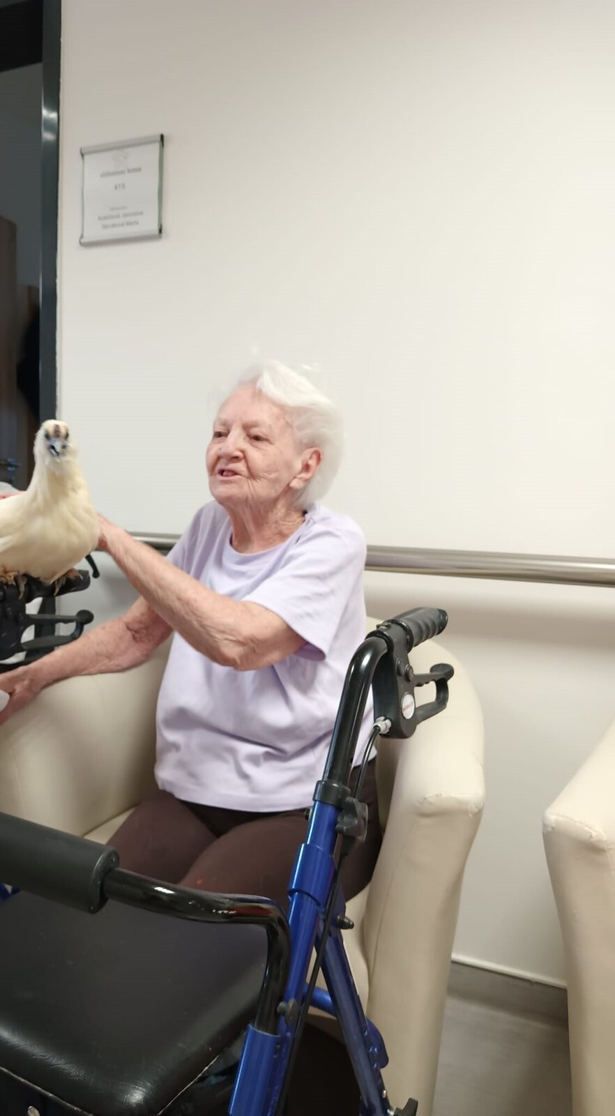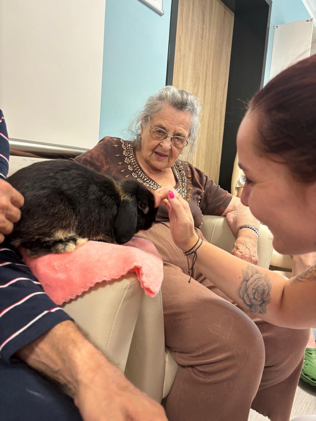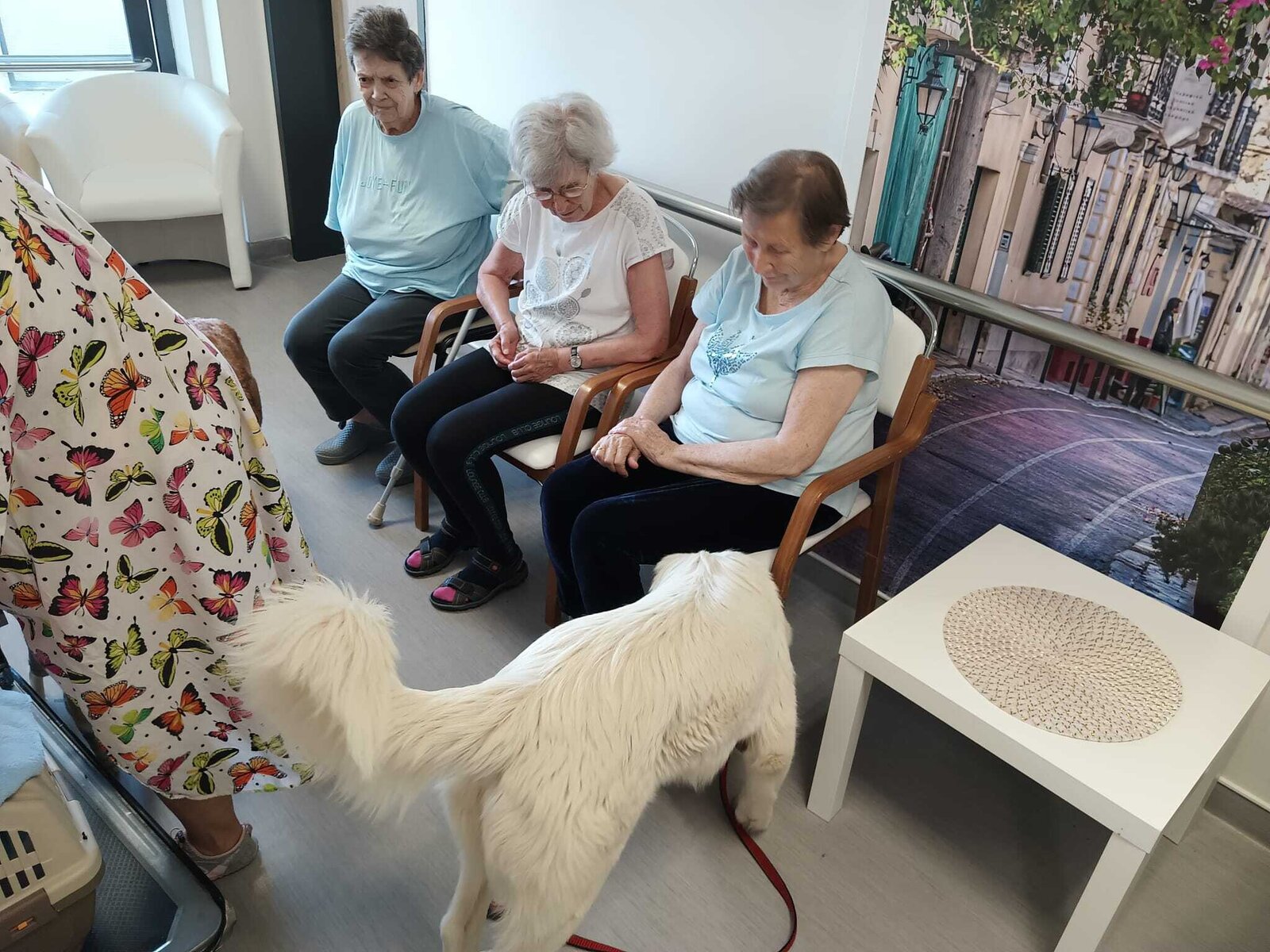 Ve čtvrtek odpoledne nás znovu navštívila zvířata z Boušic s majitelkou Evou. Kvůli vysokým teplotám jsme raději zvolili návštěvu klientů na pokojích. Náš zvířecí tým se skládal ze psů, slepic, kohouta, kocoura a králíka. O zábavu bylo opět postaráno. 😀🩵