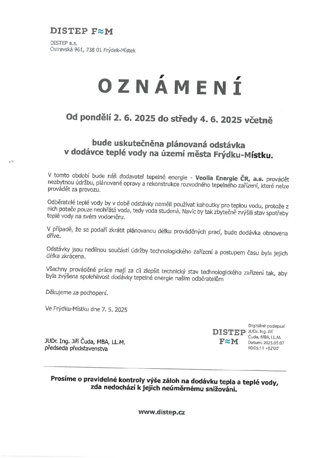 rádi bychom Vás informovali, že plánovaná odstávka v dodávce teplé vody na území Frýdku-Místku se dotkne také našeho Domova.