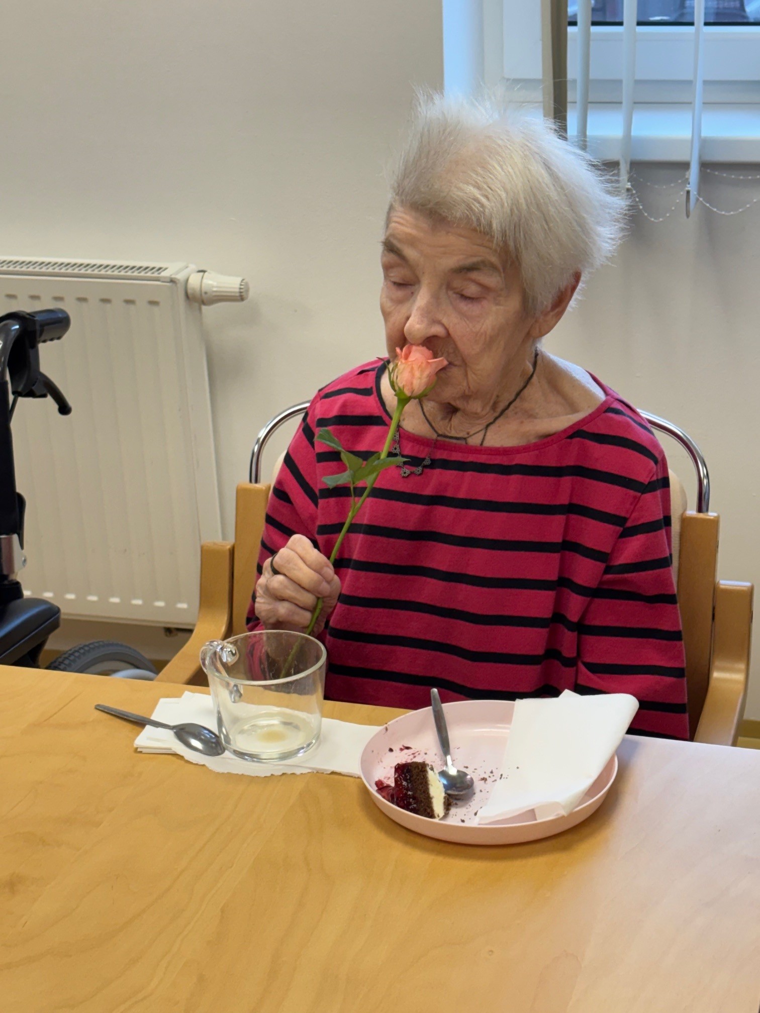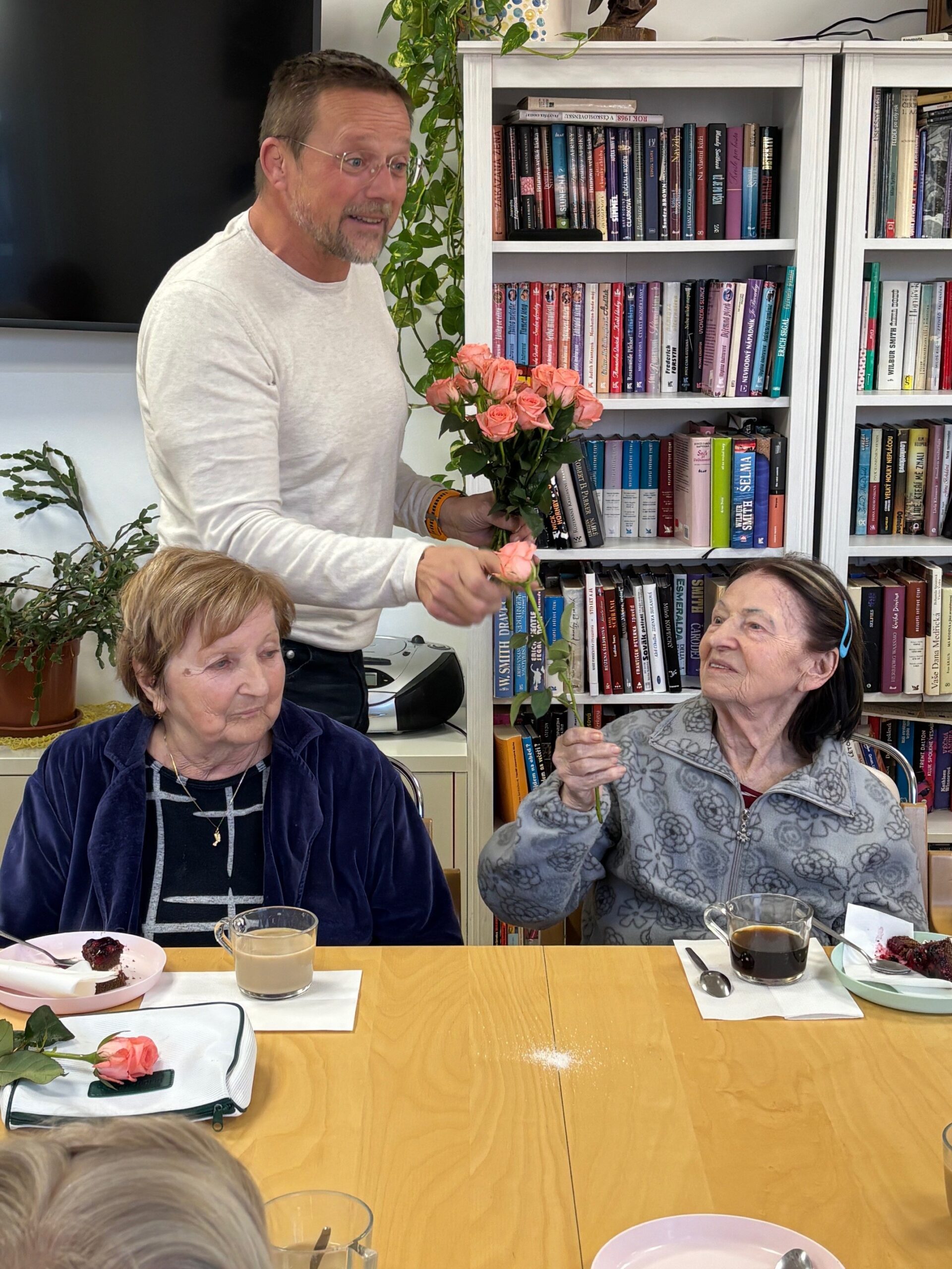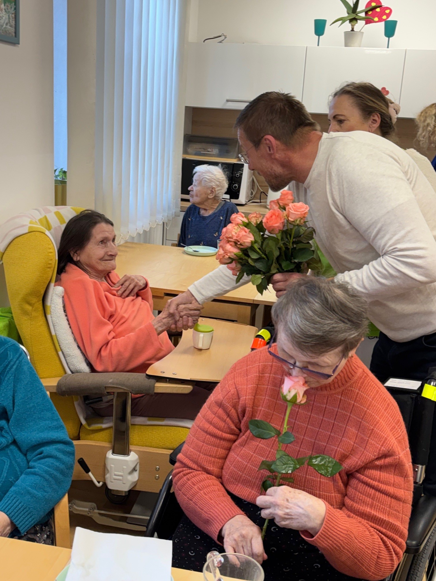 Všechny ženy, žijící a nebo pracující v domově, byly osobně ředitelem domova obdarovány růží s gratulací. K dortu a kávě zahrál na harmoniku všemi milovaný pečovatel František. Náladu měli všichni zúčastnění skvělou.