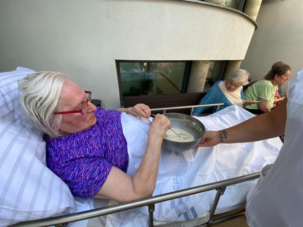 Společně s klienty jsme připravovali palačinky. Nachystali jsme si potřebné ingredience a jelikož nám počasí přálo, vyrazili jsme ven na zahradu. Klienti si mohli palačinku sami udělat a natřít různými druhy marmelád. Borůvková, jahodová, meruňková, všechny nám moc chutnaly.