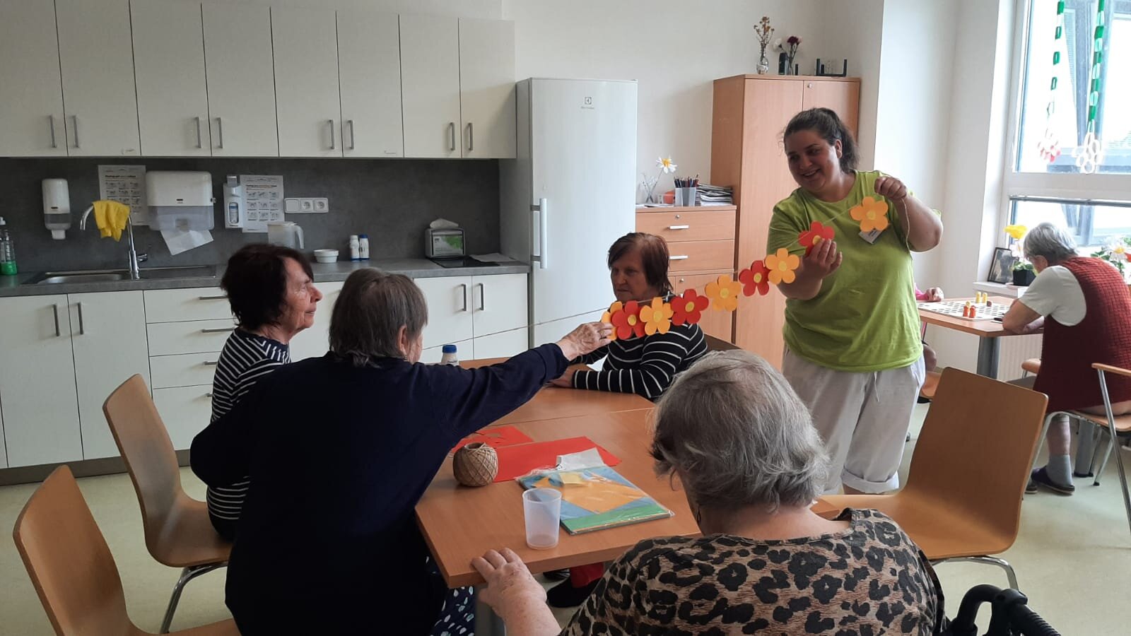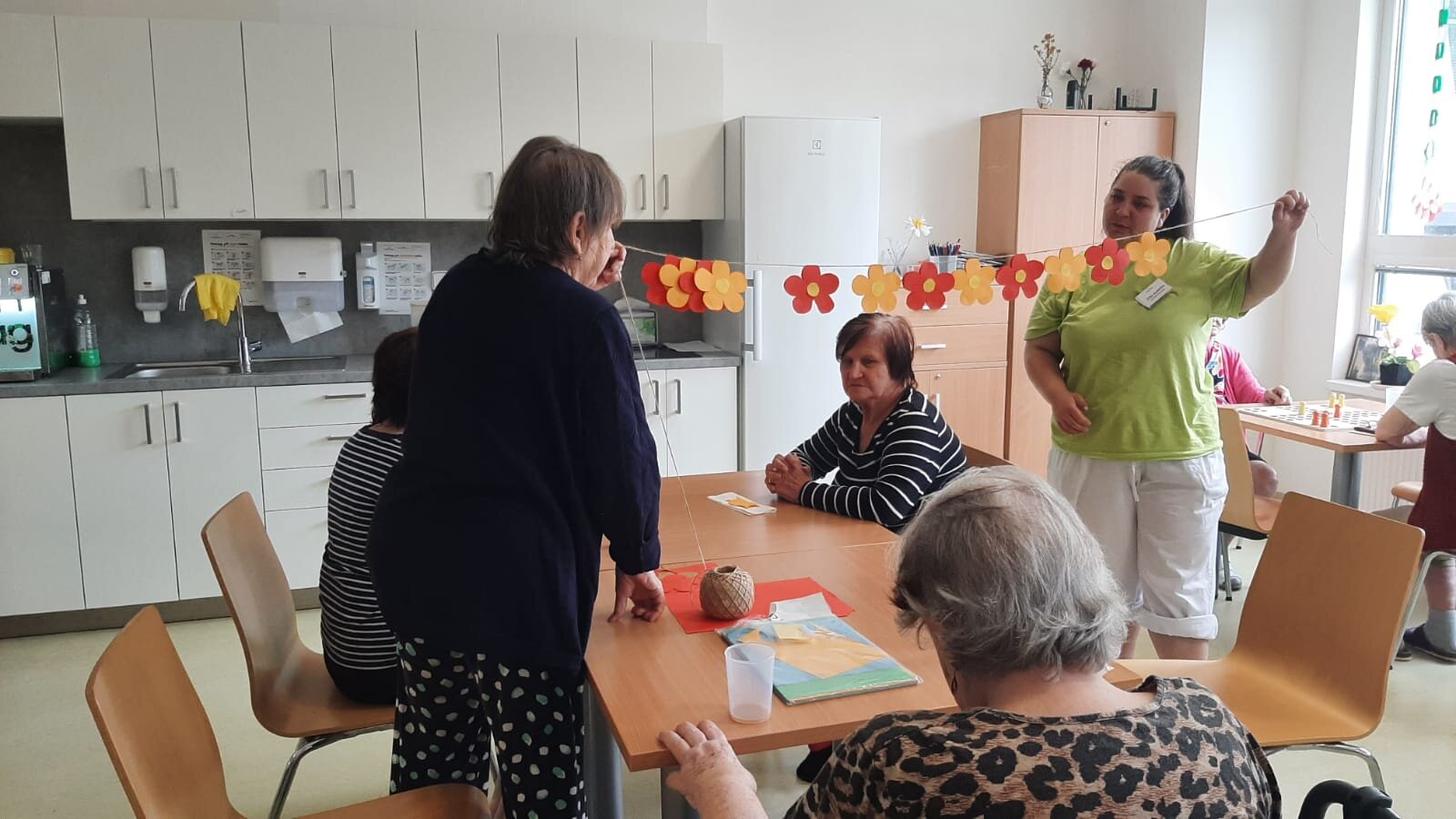 V Senevida Nepomuk naše tvořivé ruce nezahálely! ✂️🎨 S radostí jsme se pustili do výroby barevné papírové girlandy, která nám zkrášlí společné prostory. Klienti s nadšením stříhali, skládali a lepili jednotlivé dílky, čímž procvičovali jemnou motoriku a soustředění. Každý kousek přidal svůj osobitý dotek a dohromady vzniklo krásné a veselé dílo.