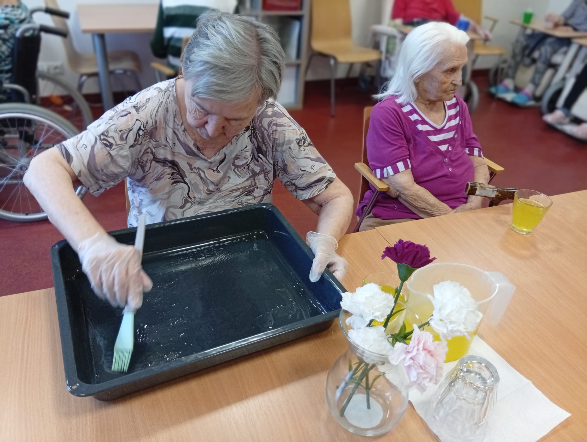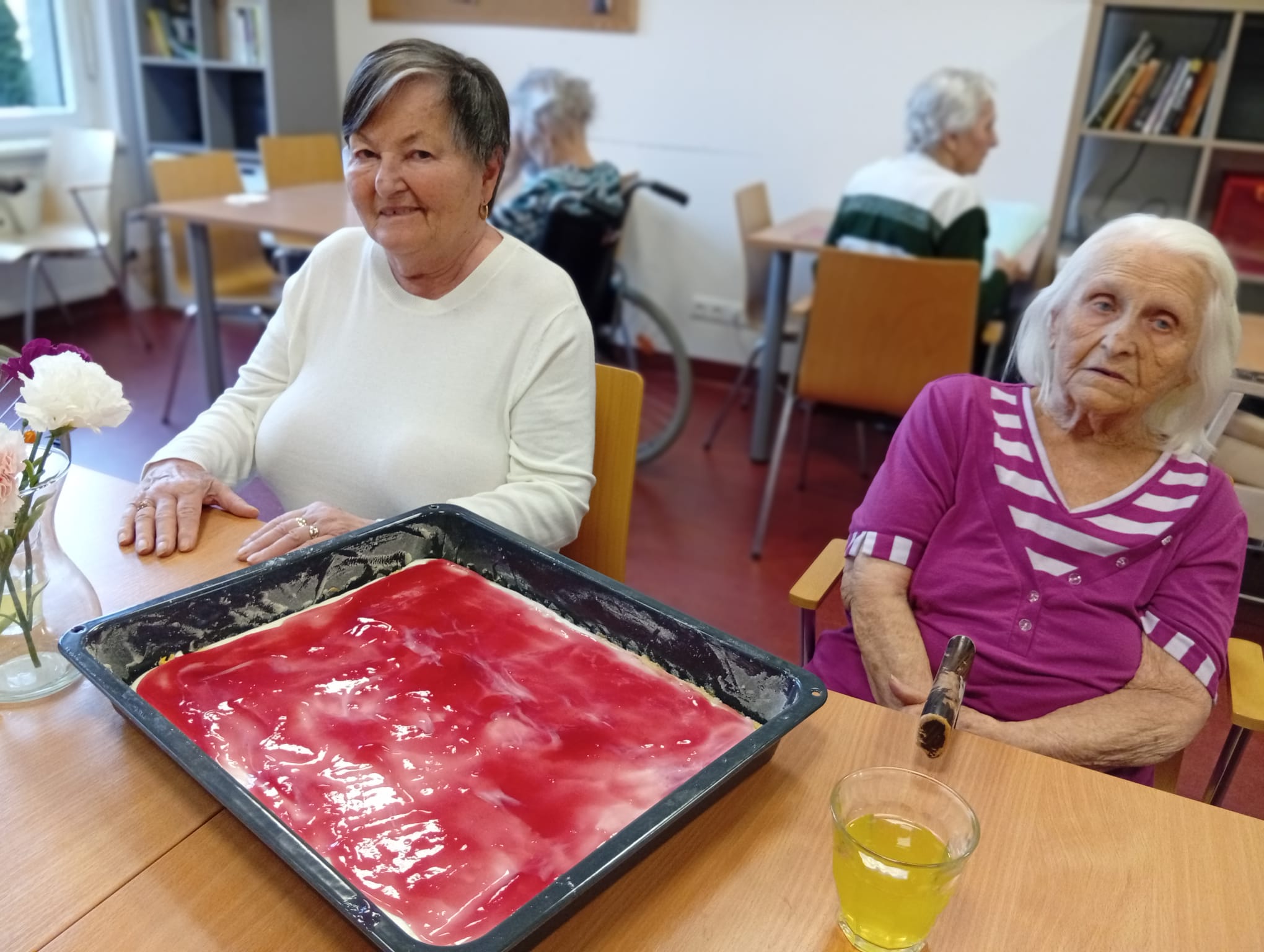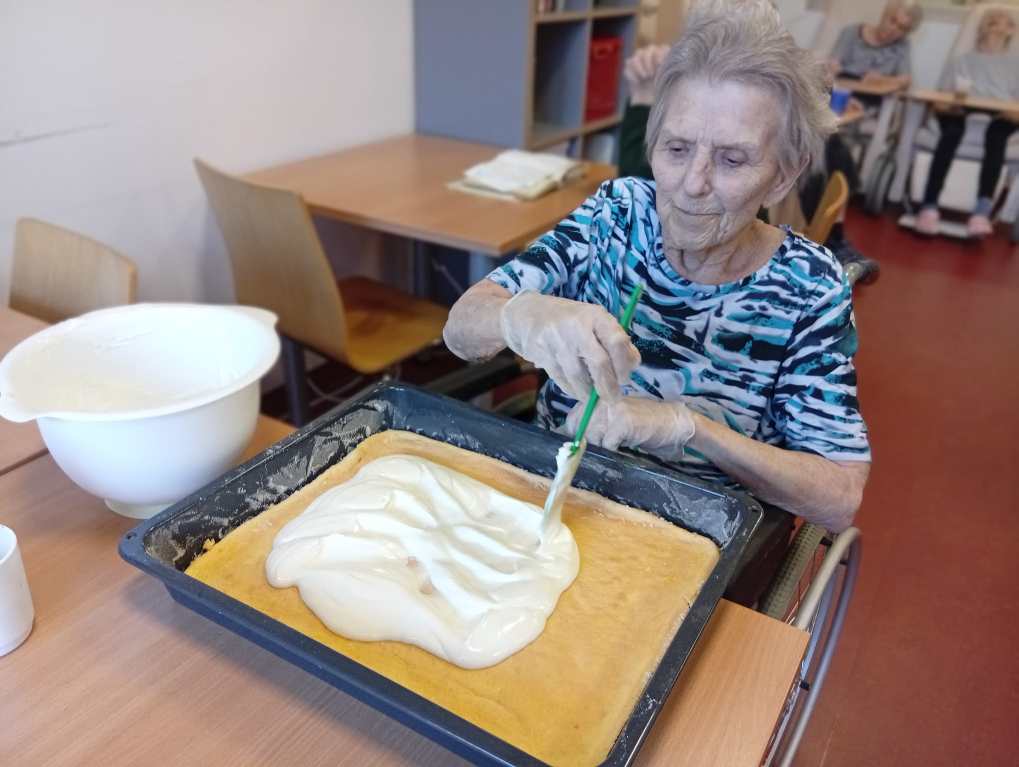 S klienty jsme dnes pekli buchtu na plech. Klienti se aktivně zapojili do přípravy těsta. Během pečení panovala dobrá nálada, doprovázena vzpomínkami na domácí pečení a sdíleným oblíbených receptů.