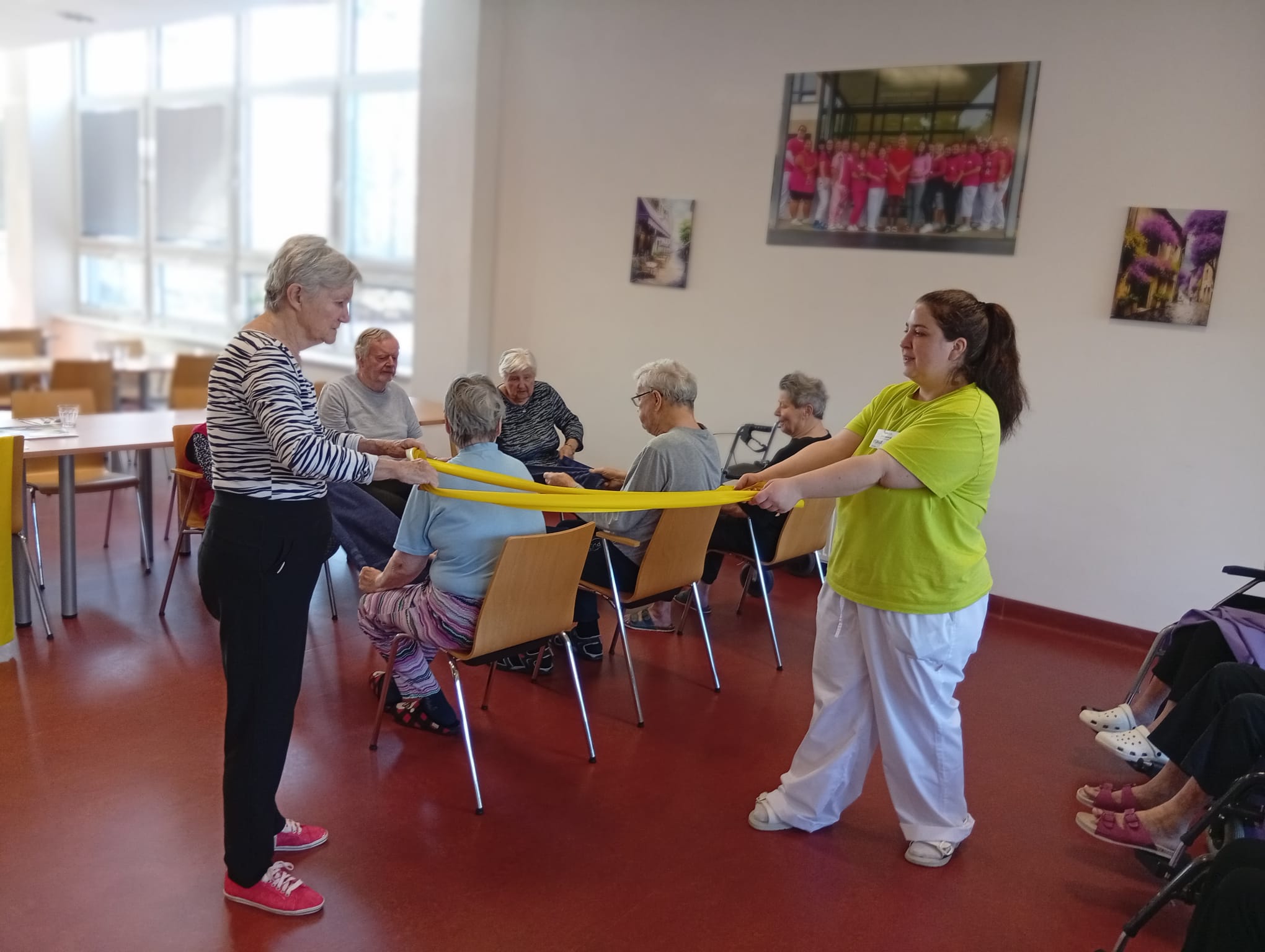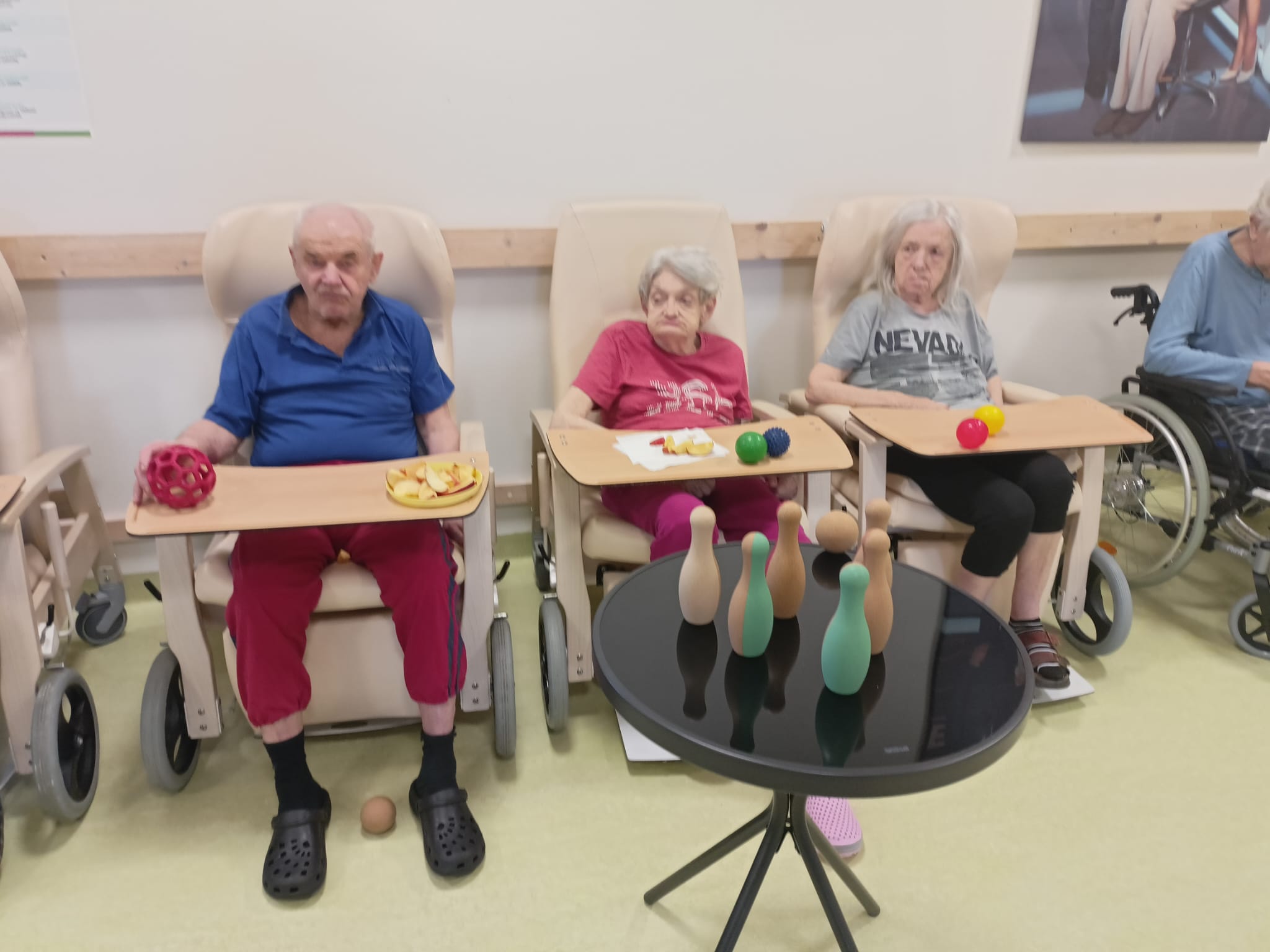 Dnešní pohybová aktivita byla zaměřena na cvičení s posilovacími gumami a kuželkami. Klienti procvičovali horní i dolní končetiny formou jednoduchých cviků.
