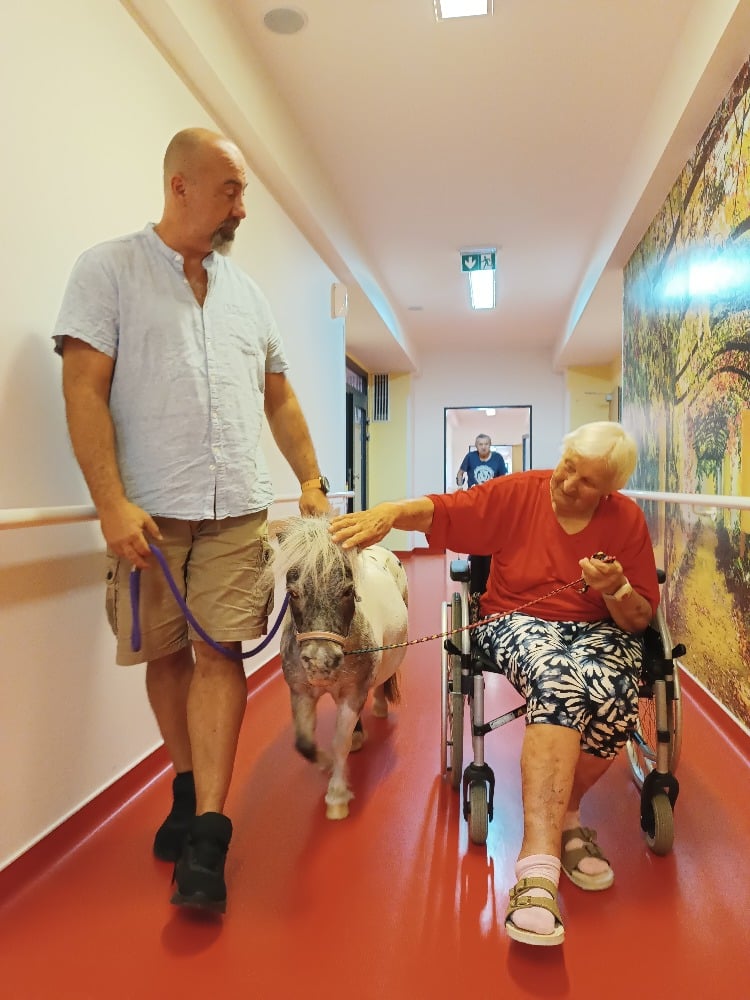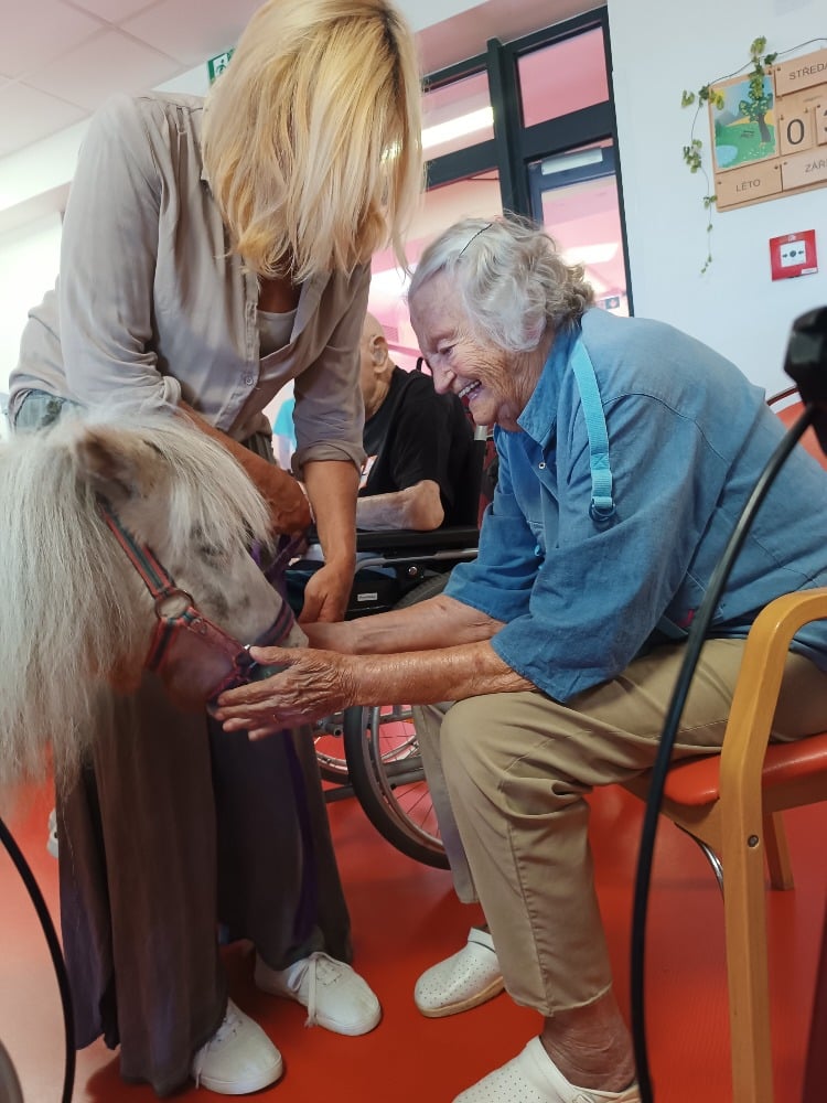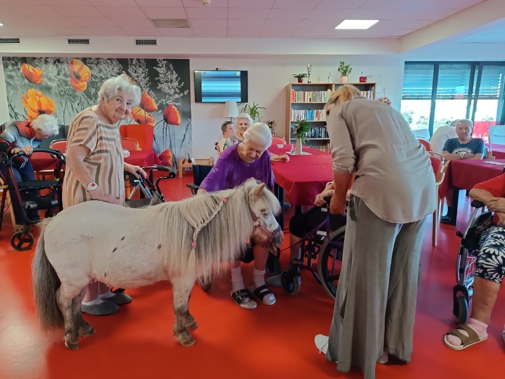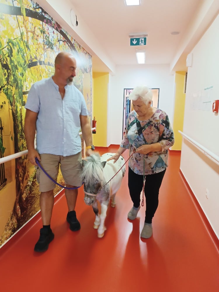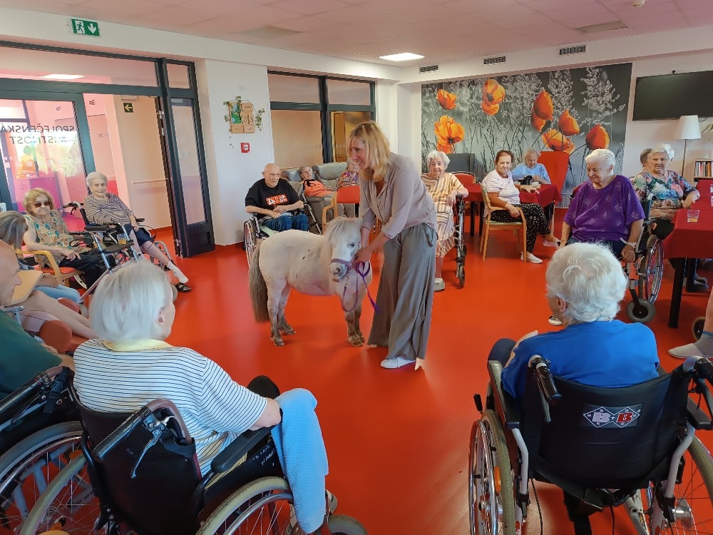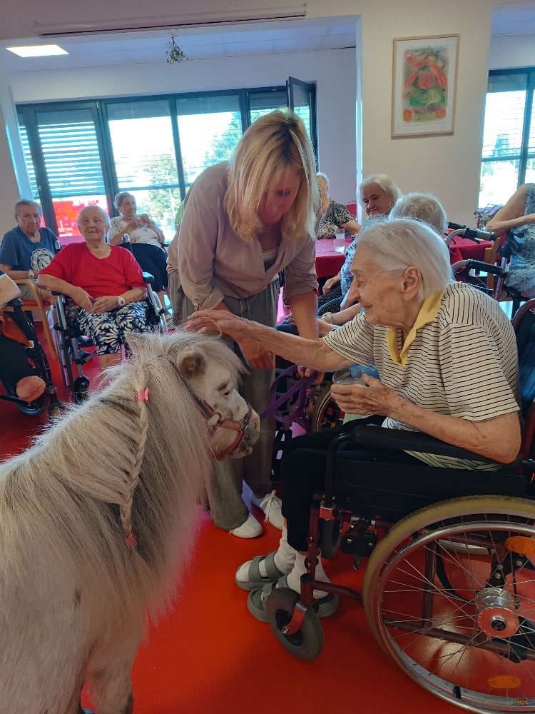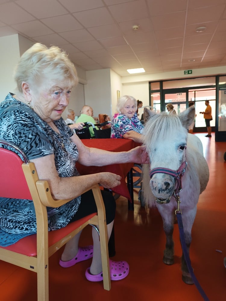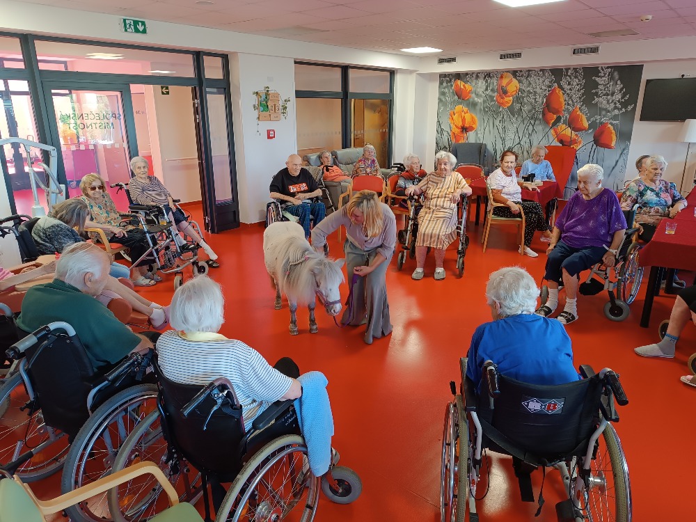 Tak jako každý rok k nám dorazily dvě výjimečné návštěvnice, poníci Dianka a Topinka. Tyto trpělivé a přátelské klisničky pravidelně přinášejí do našeho domova jedinečný zážitek v podobě tzv. ponyterapie, která se stala velmi oblíbenou aktivitou mezi klienty.