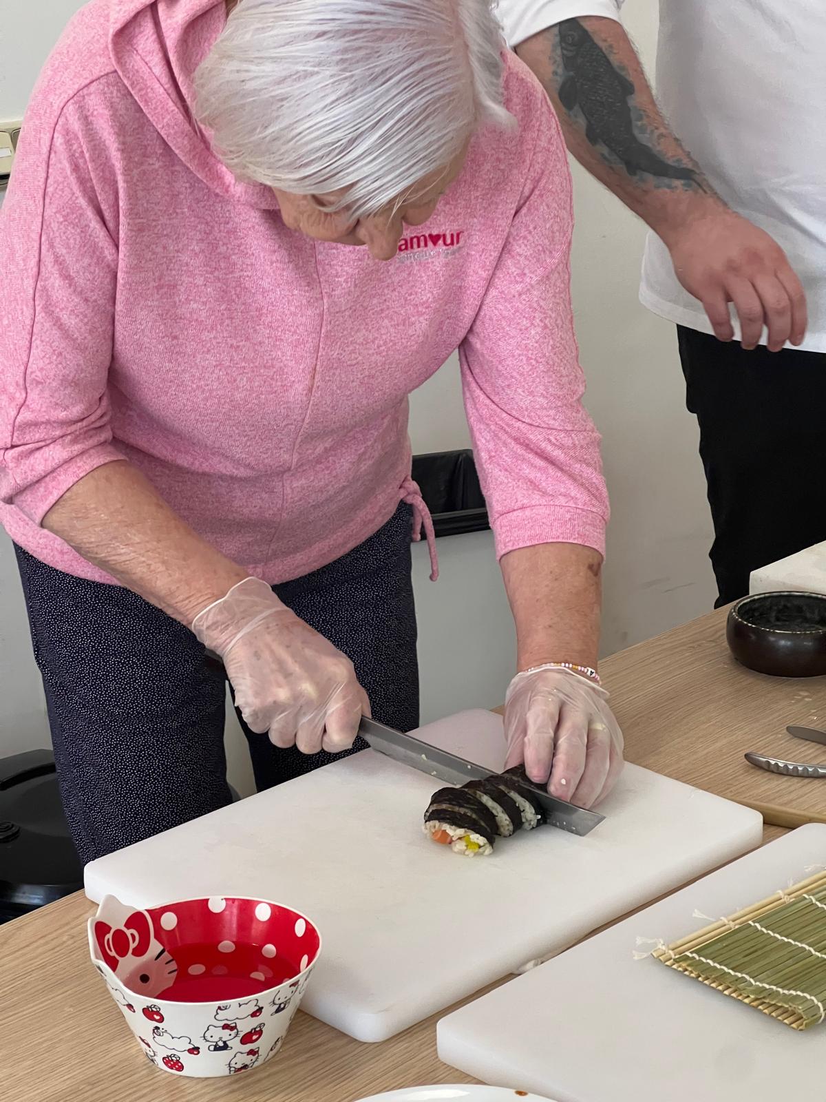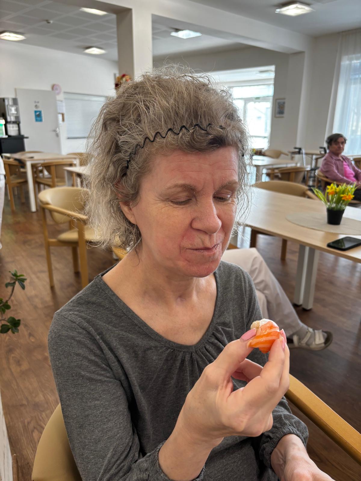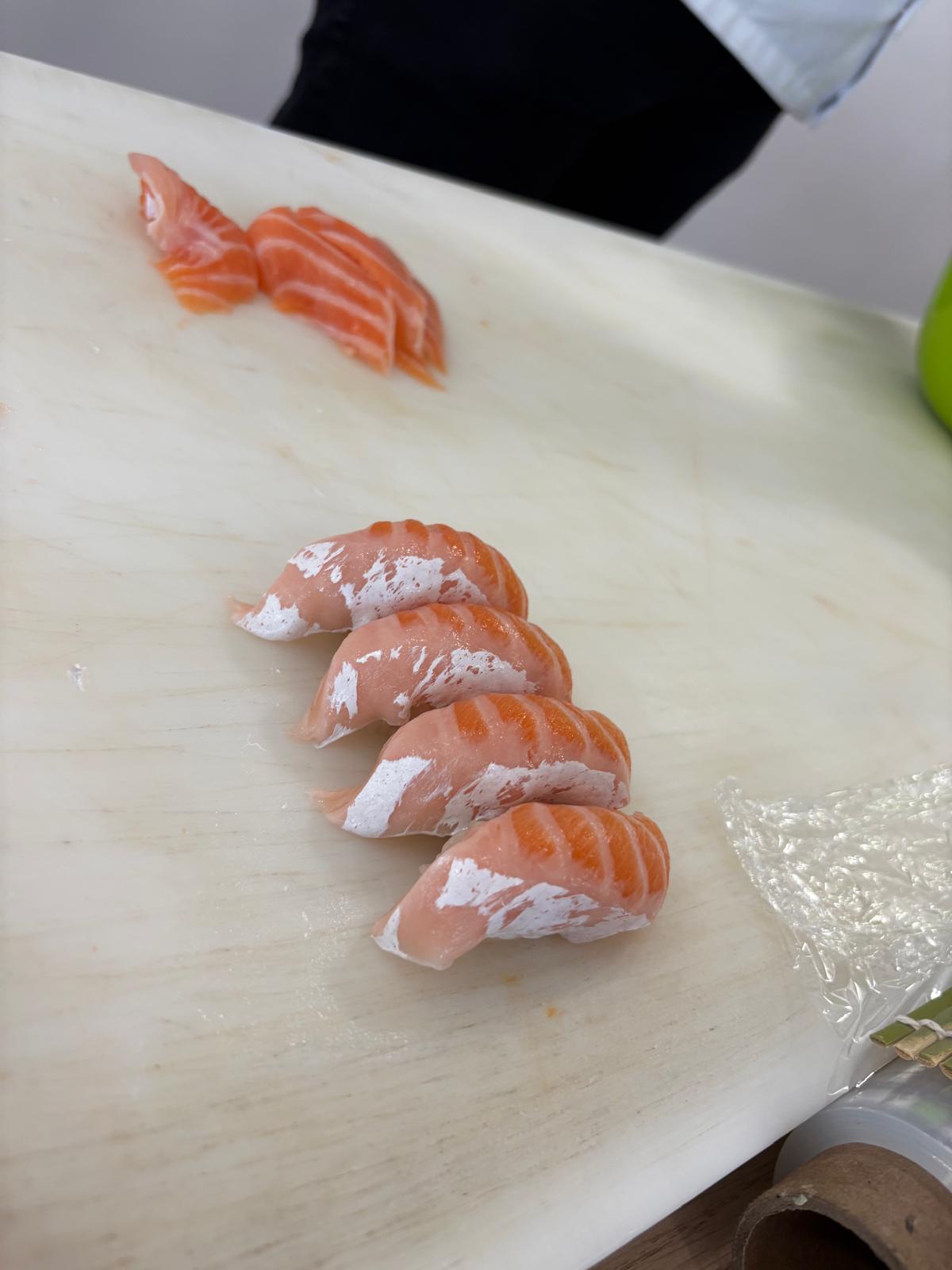 Ukázal nám, jak porcuje celého lososa, vysvětlil jaké ingredience používá, řekl nám i něco o historii sushi a naši klienti měli možnost si i sami rolování a krájení vyzkoušet. Samozřejmě bez následné ochutnávky se to neobešlo!