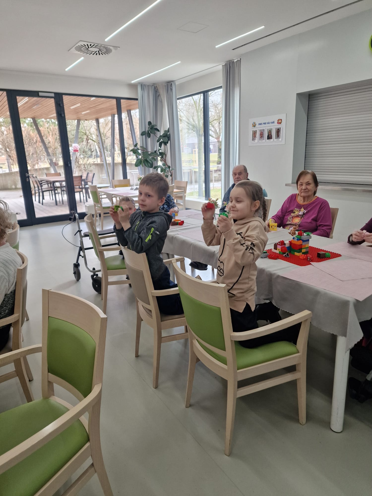 Děti společně se seniory z našeho domova měly splnit několik úkolů. První - postavit co nejvyšší maják a vyprávět dobrý skutek, který sami udělali nebo jehož byli svědkem. Druhý úkol byl postavit z kostiček stroj času a říct, kam by se strojem odcestovali.