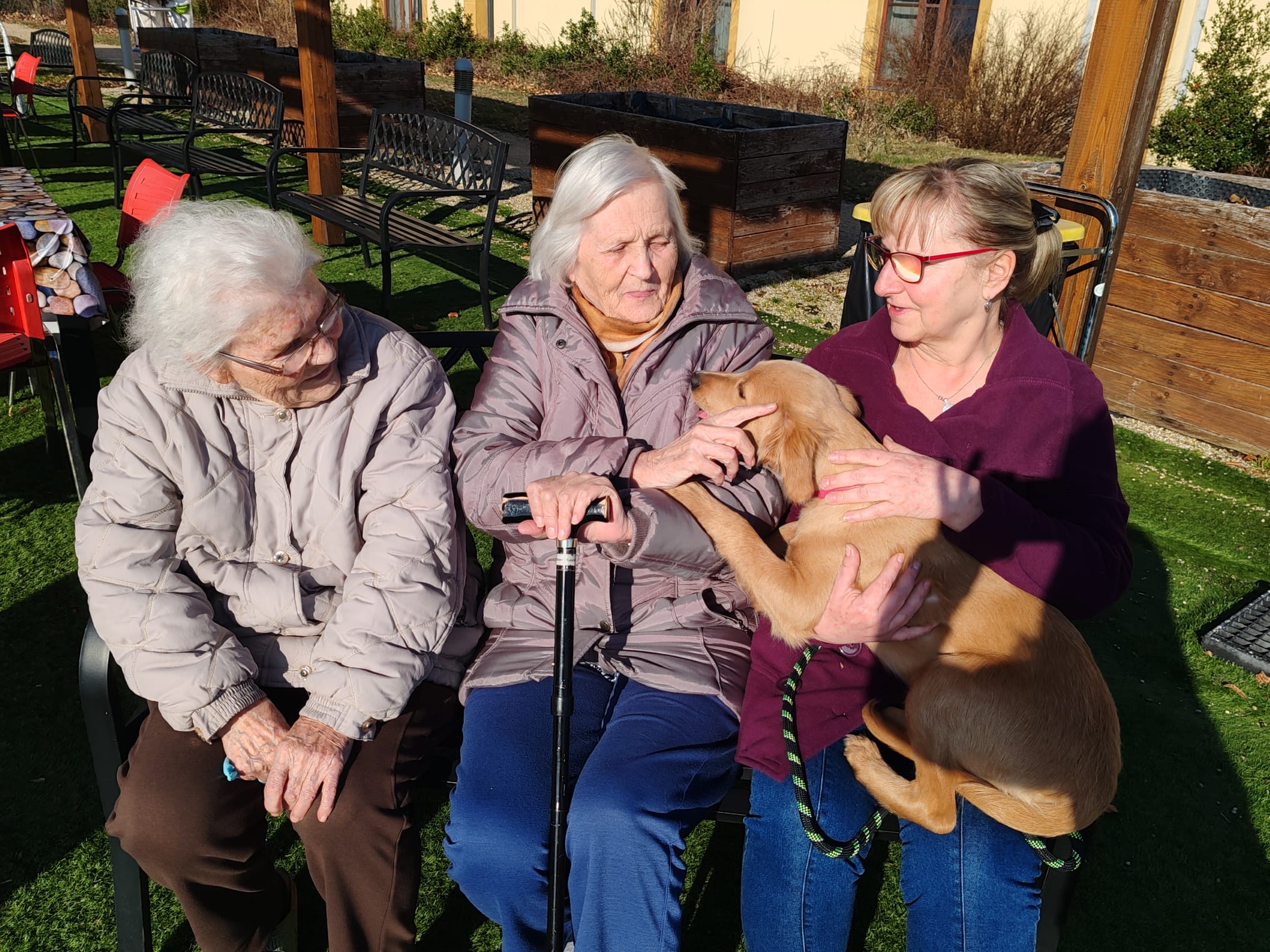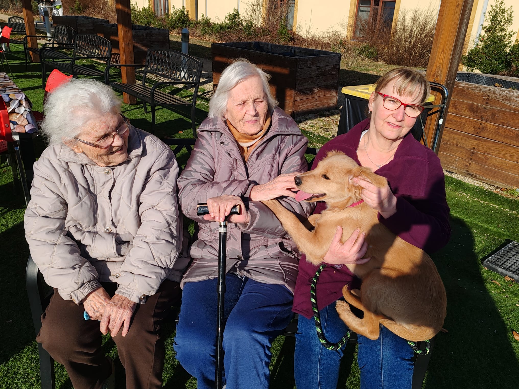 První slunce a odpoledne na naší zahradě s pejskem