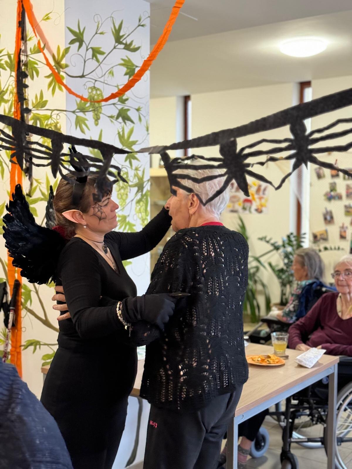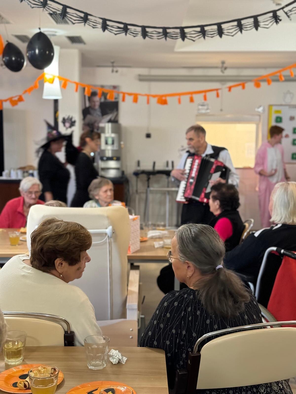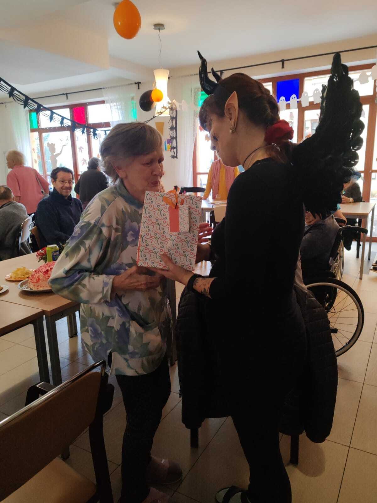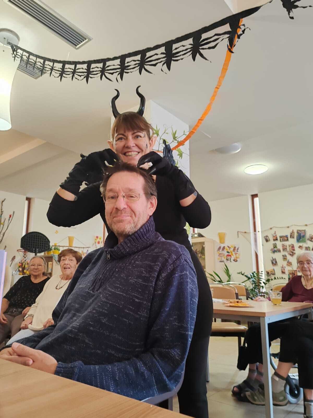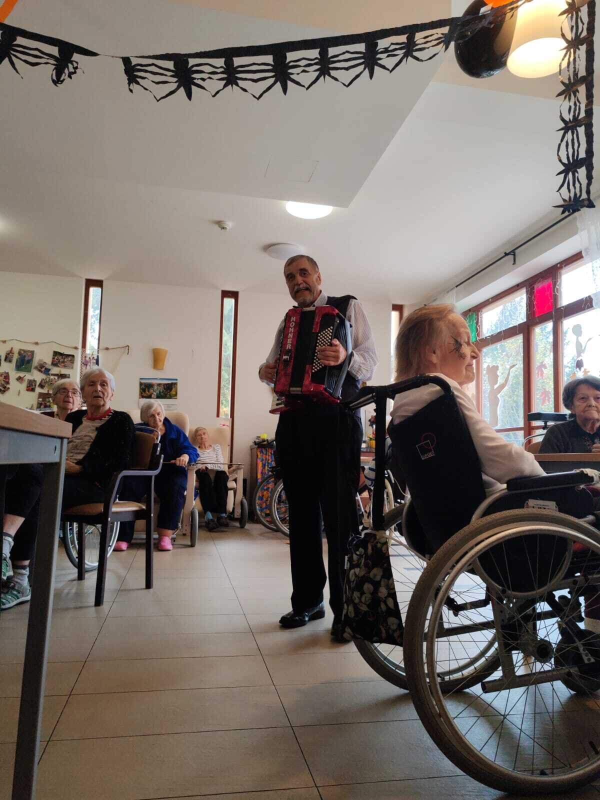 Ve čtvrtek 31.10. se tradičně konala oslava narozenin. Tentokrát nám oslava vyšla přesně na svátek Halloween, při kterém je zvykem převlékání do kostýmů a strašidelná výzdoba. V dopoledních hodinách tak klienti ve spolupráci s aktivizačními pracovnicemi vyzdobili jídelnu. Na odpoledne bylo připraveno pohoštění v podobě párků v rohlíku a naše aktivizační pracovnice Bětka dokonce upekla dort ve tvaru mozku! K poslechu nám po celé odpoledne hrál harmonikář pan Lehotai. Oslava se opravdu moc vydařila!