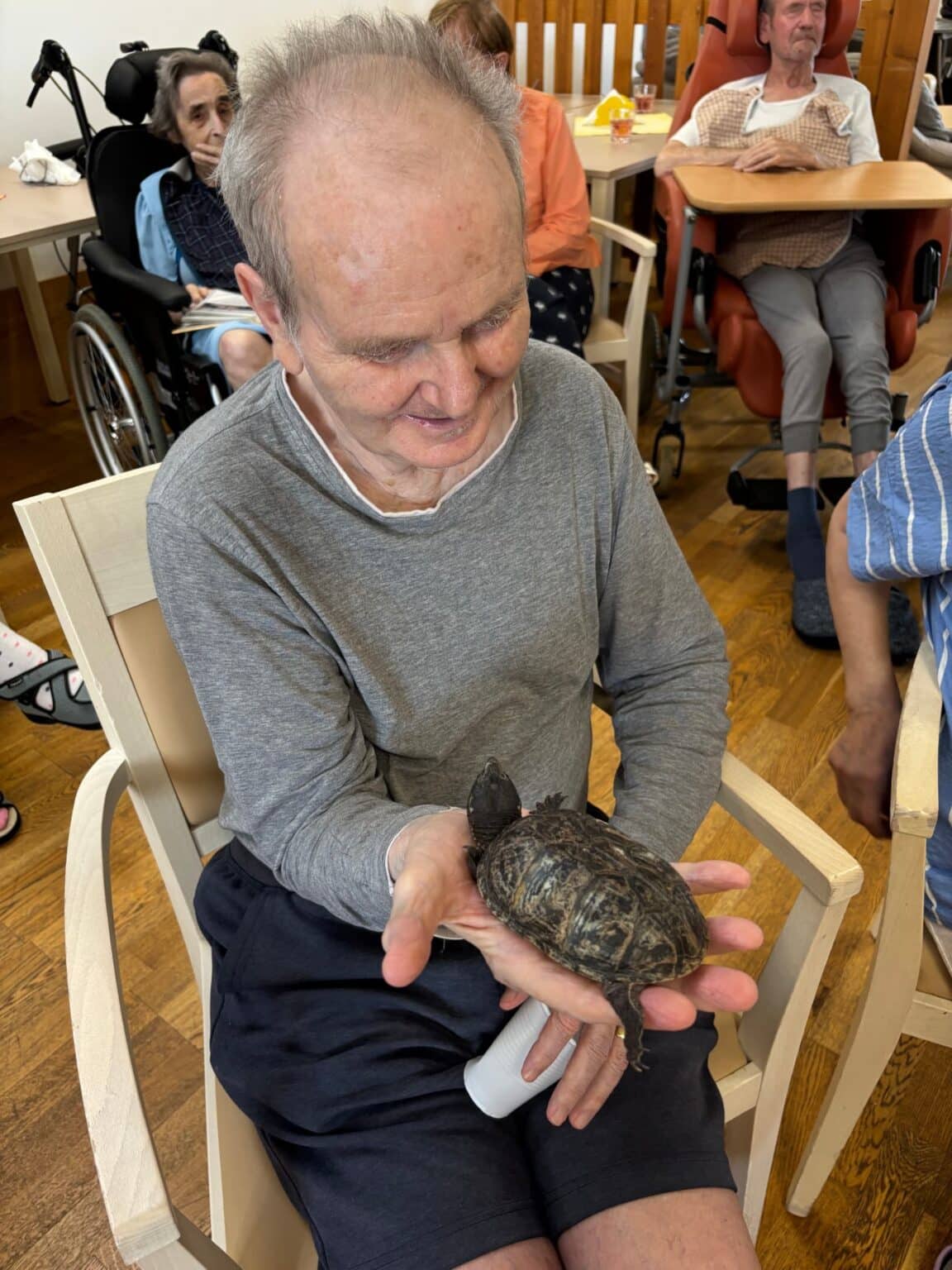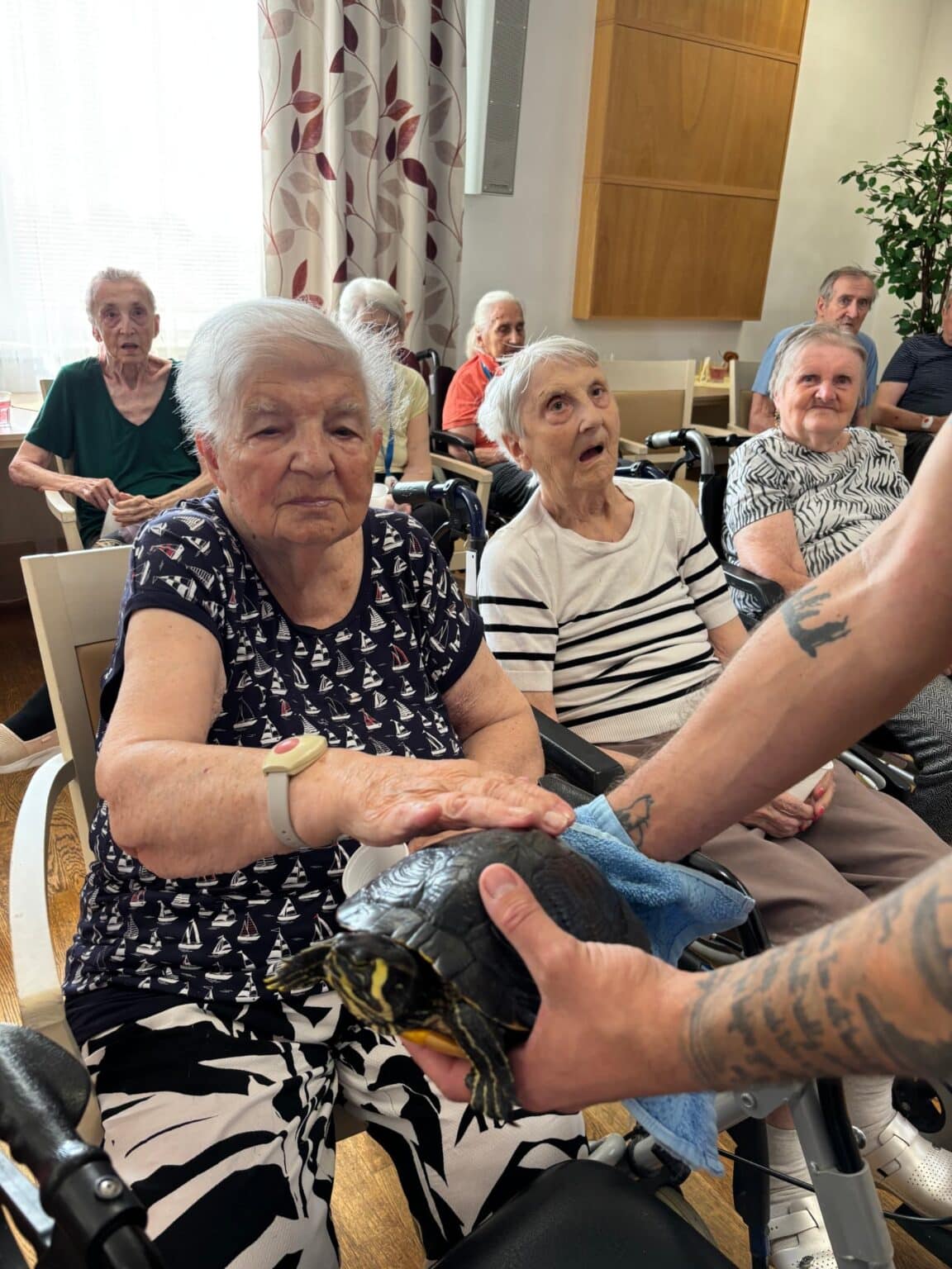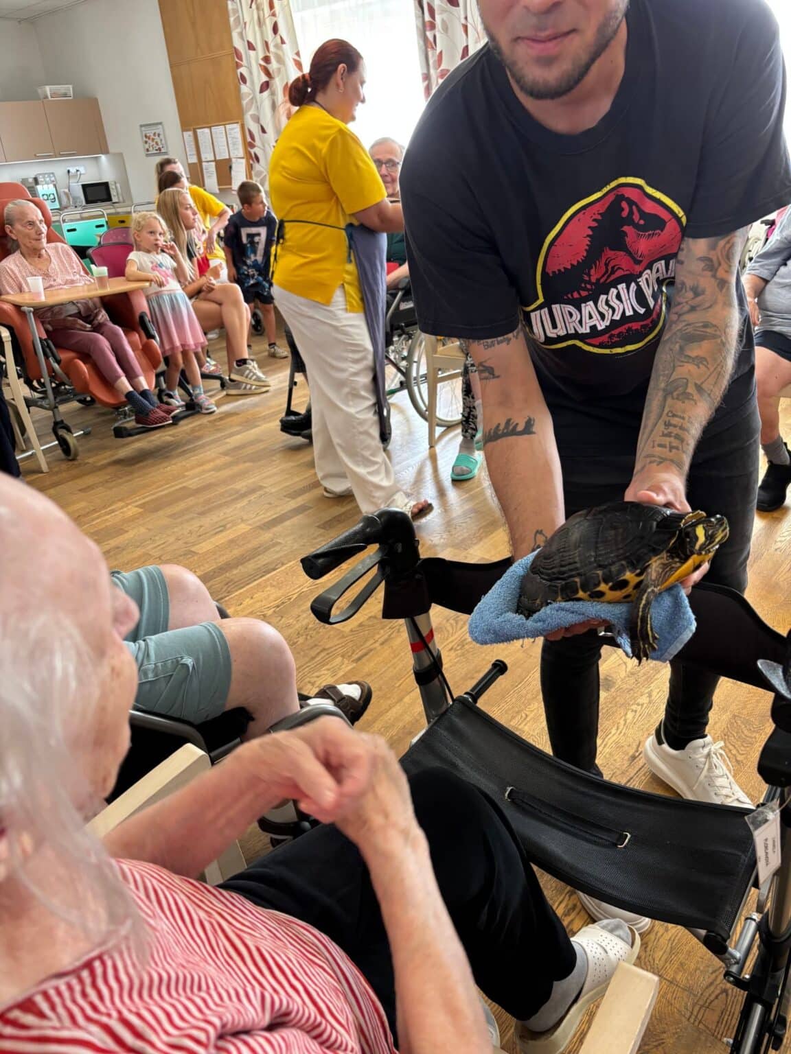 Atmosféra byla přátelská a plná zvědavosti. Klienti se s nadšením zapojili – hladili zvířata, kladli otázky a vzpomínali na své vlastní domácí mazlíčky z dřívějších let. Účast byla hojná a z ohlasů bylo zřejmé, že se akce velmi líbila. Děkujeme panu Filípkovi za jeho návštěvu a věříme, že se podobné setkání v budoucnu zopakuje.