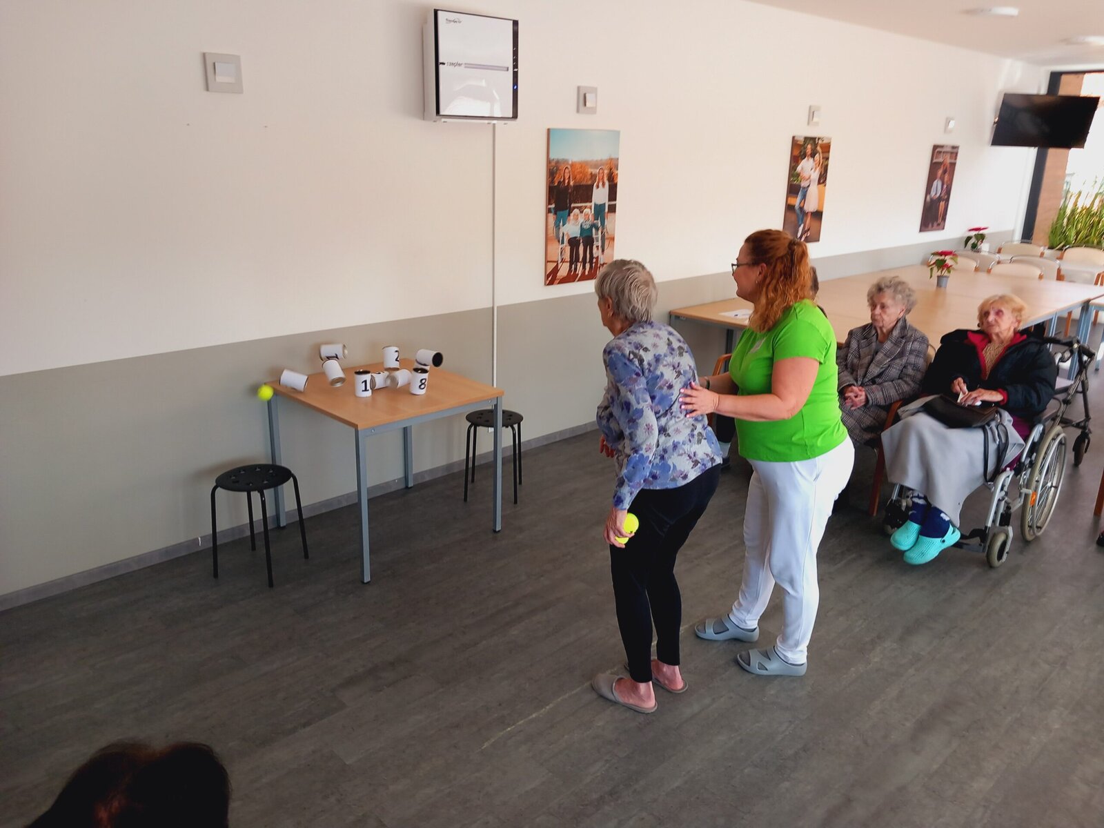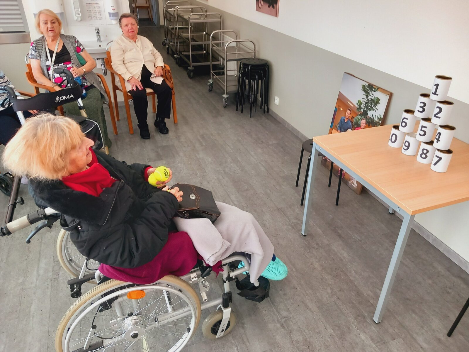 Shazování plechovek s čísly tenisovým míčkem je nejen zábavné, ale také skvělé pro podporu hrubé motoriky a zdravé soutěživosti mezi klienty – samozřejmě v tom nejlepším smyslu! Plechovky byly pečlivě očíslované a každý klient získával body podle toho, kolik plechovek se mu podařilo shodit.