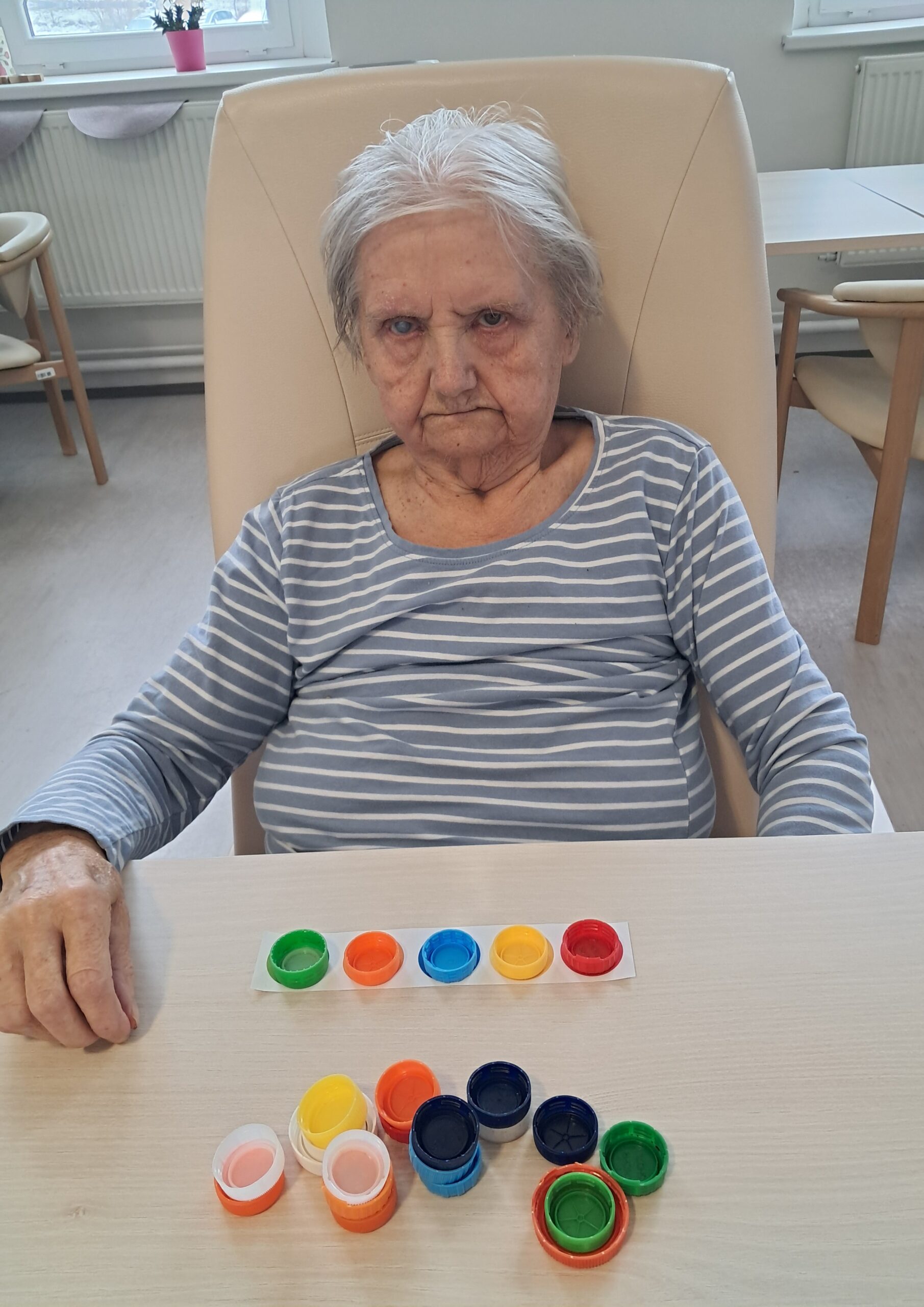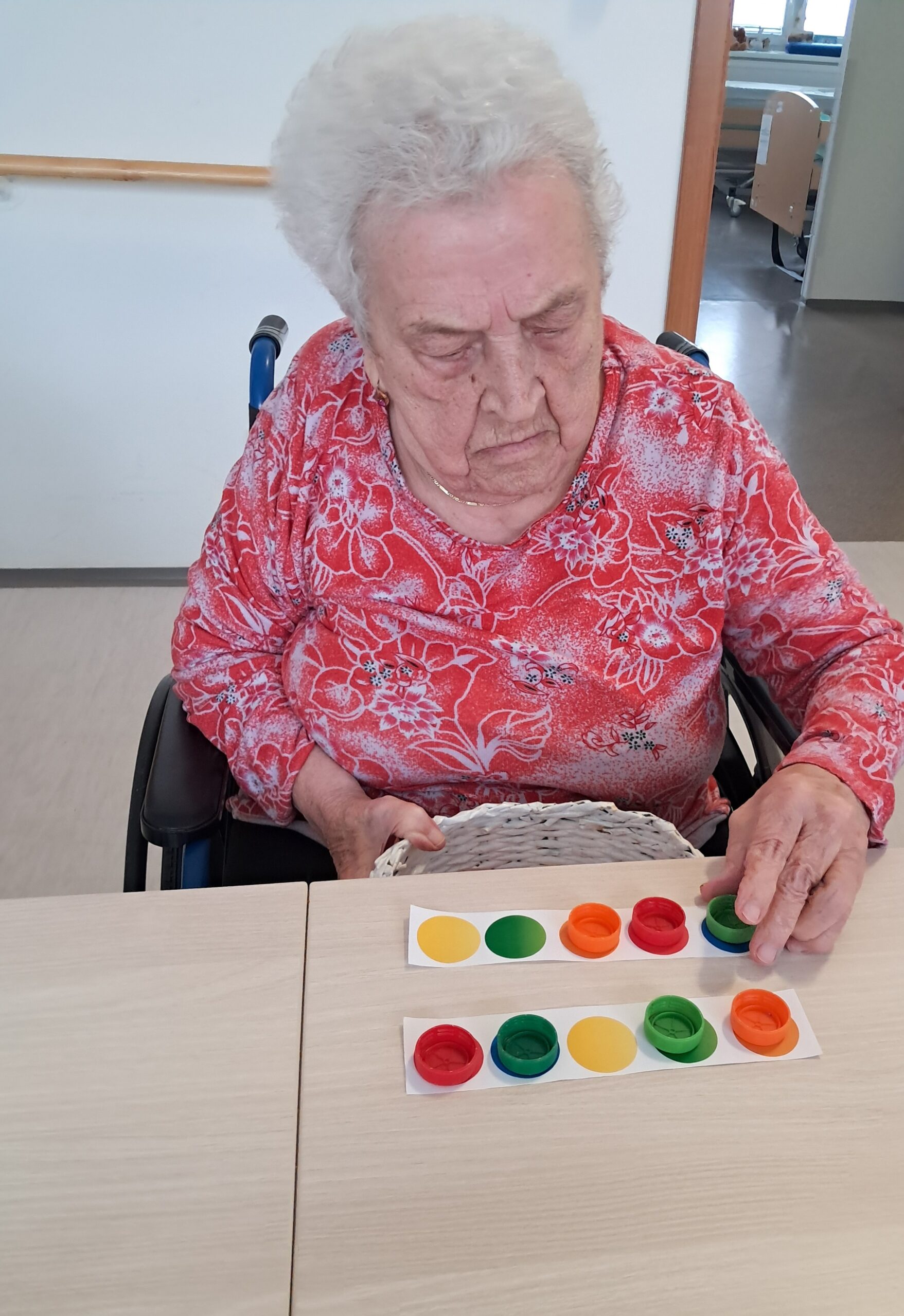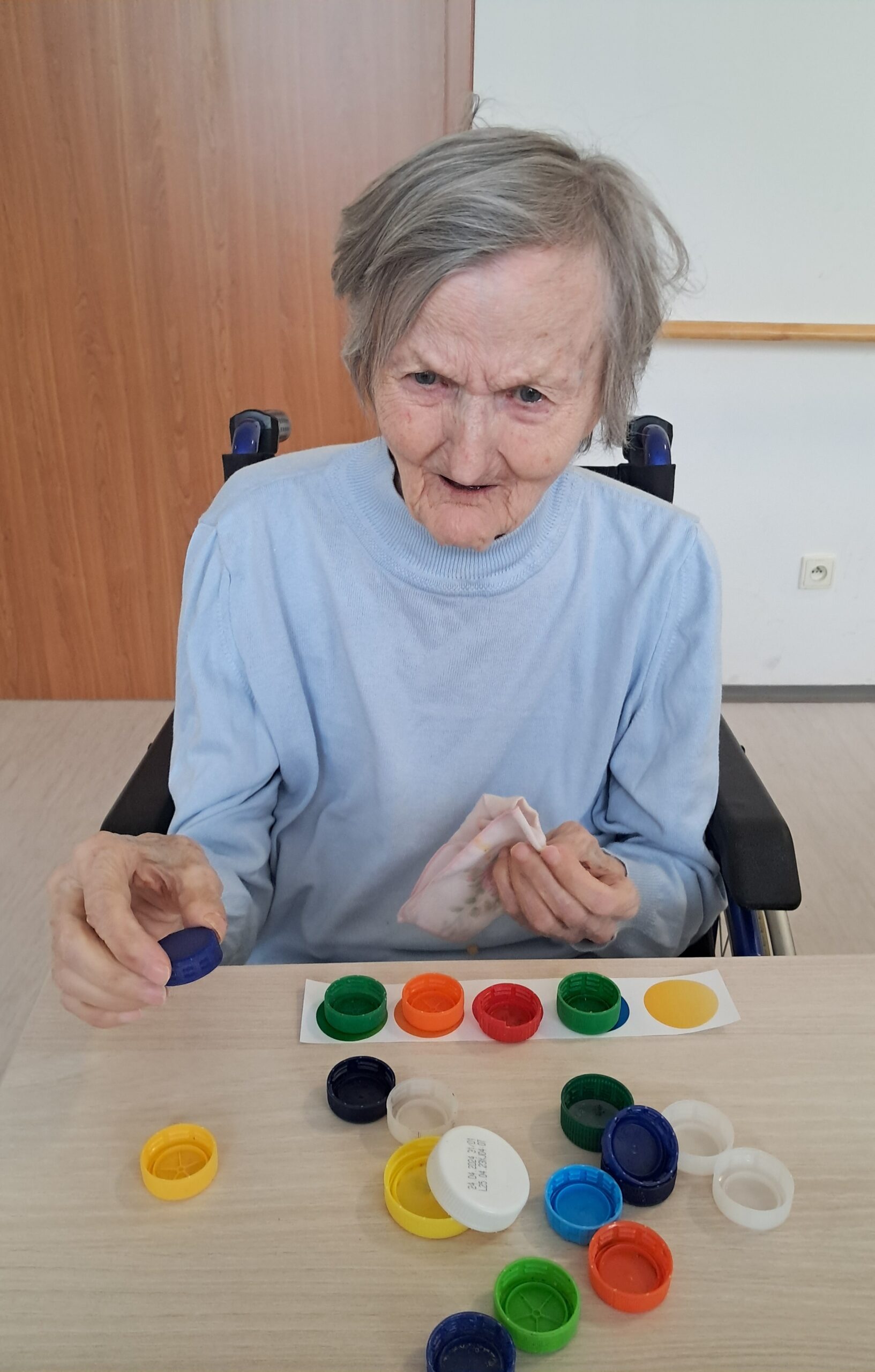 Dopoledne proběhla smyslová aktivizace, jejímž cílem bylo podpořit vnímání, soustředění a jemnou motoriku. Klienti pomocí hmatu poznávali předměty ukryté v pytlíčcích, podle čichu rozlišovali různé vůně a ukládáním barevných koleček na předlohy procvičovali rozlišování barev a pozornost. Aktivita klientům přinesla nové podněty, pocit úspěchu a příjemně strávený čas.