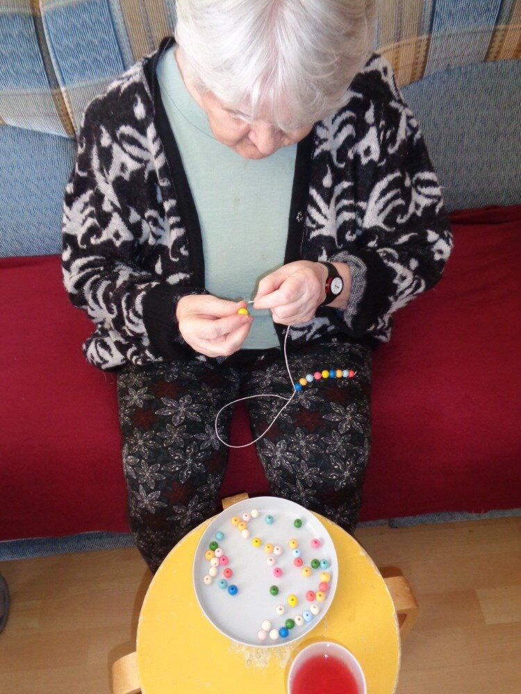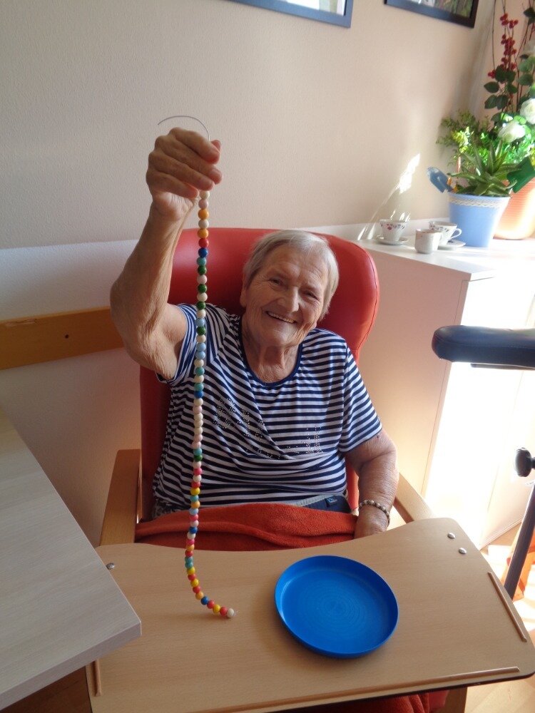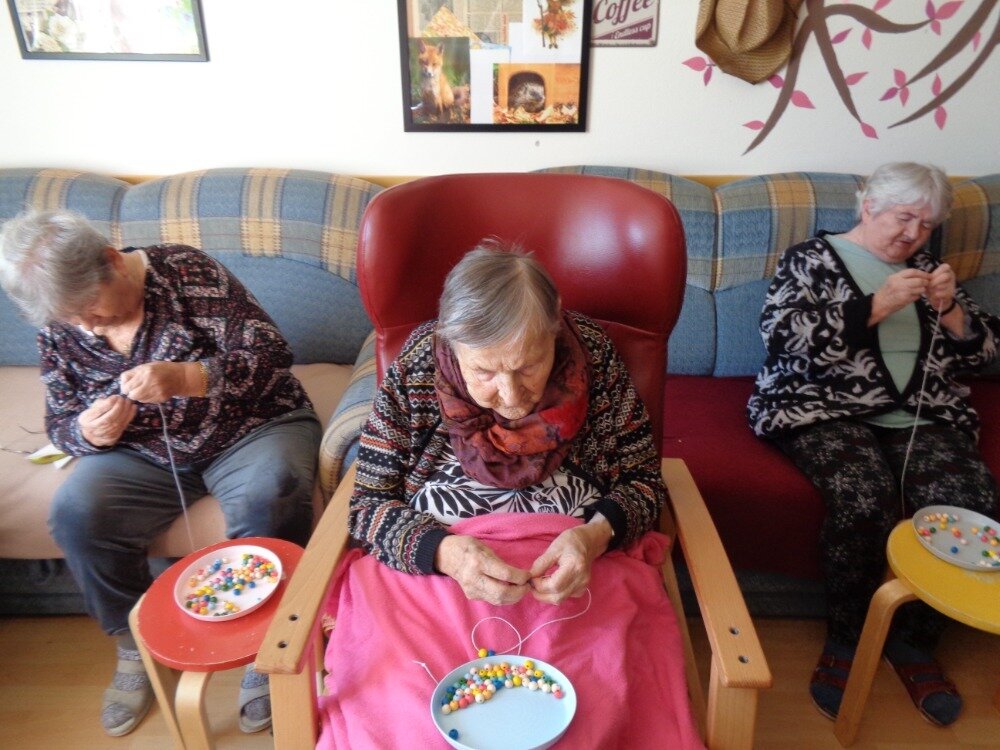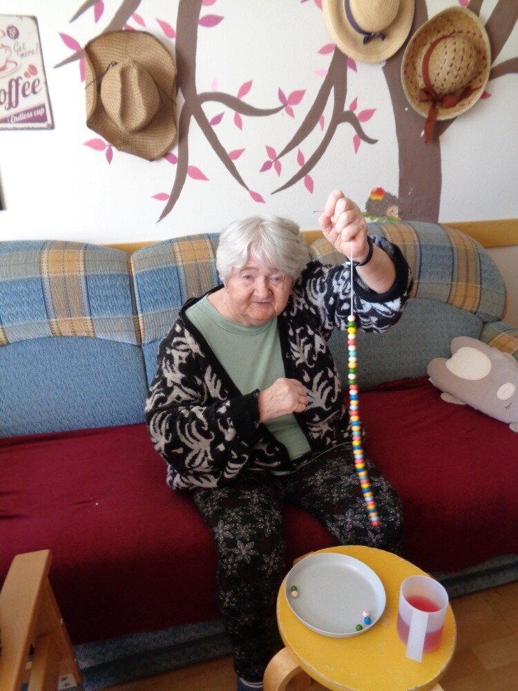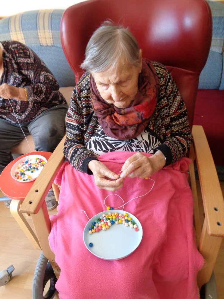 Cvičení jemné motoriky je běžnou součástí aktivit v Domově. A úplně nejlepší je, když se užitečná činnost spojí s něčím příjemným. Proto jsme se daly do navlékání korálků, kterými jsme se pak naparádily.