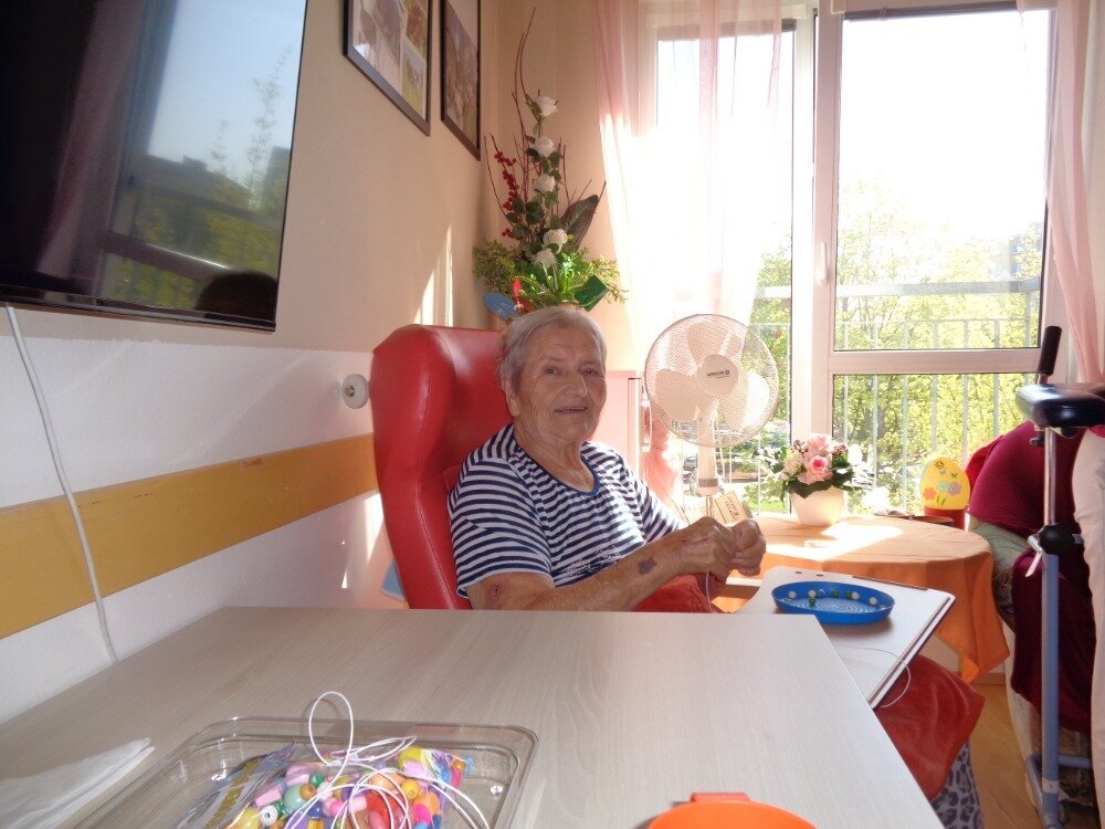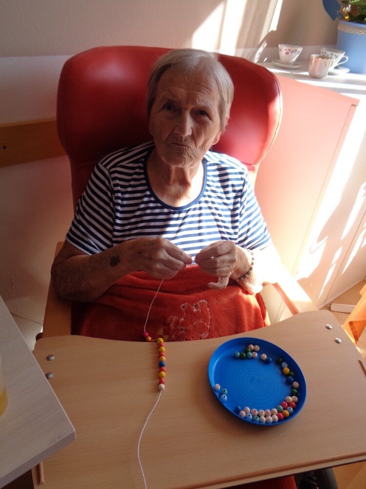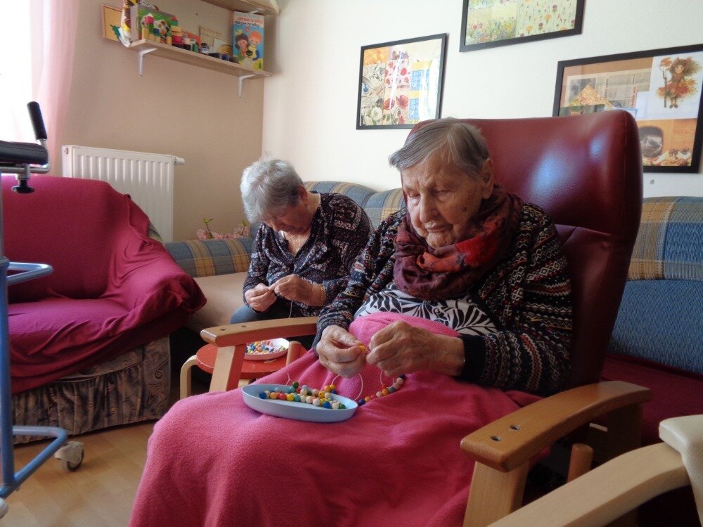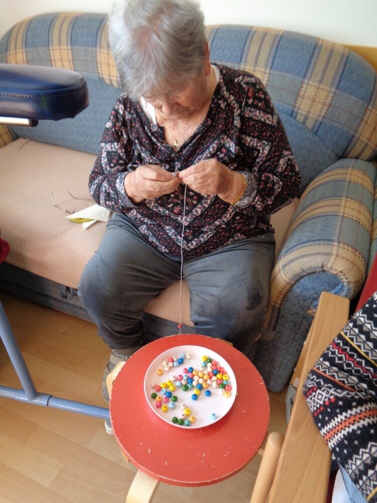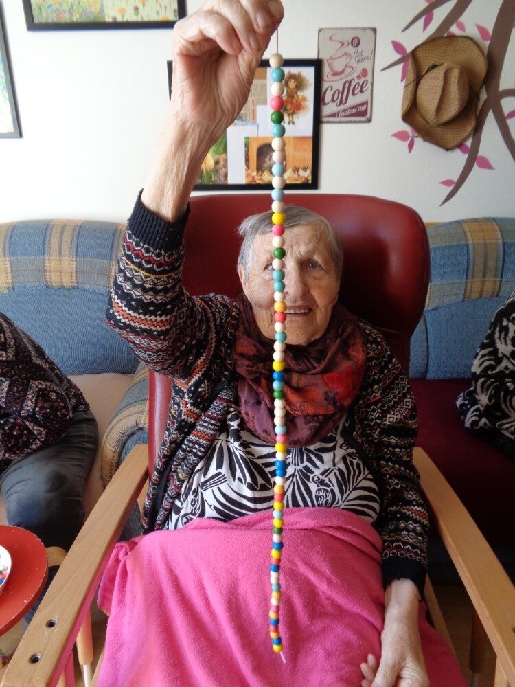 Cvičení jemné motoriky je běžnou součástí aktivit v Domově. A úplně nejlepší je, když se užitečná činnost spojí s něčím příjemným. Proto jsme se daly do navlékání korálků, kterými jsme se pak naparádily.